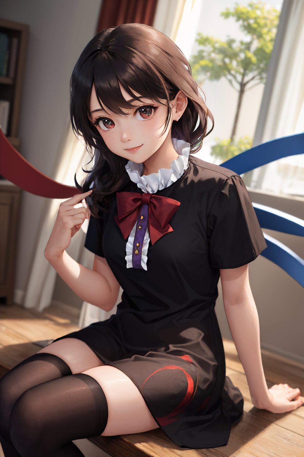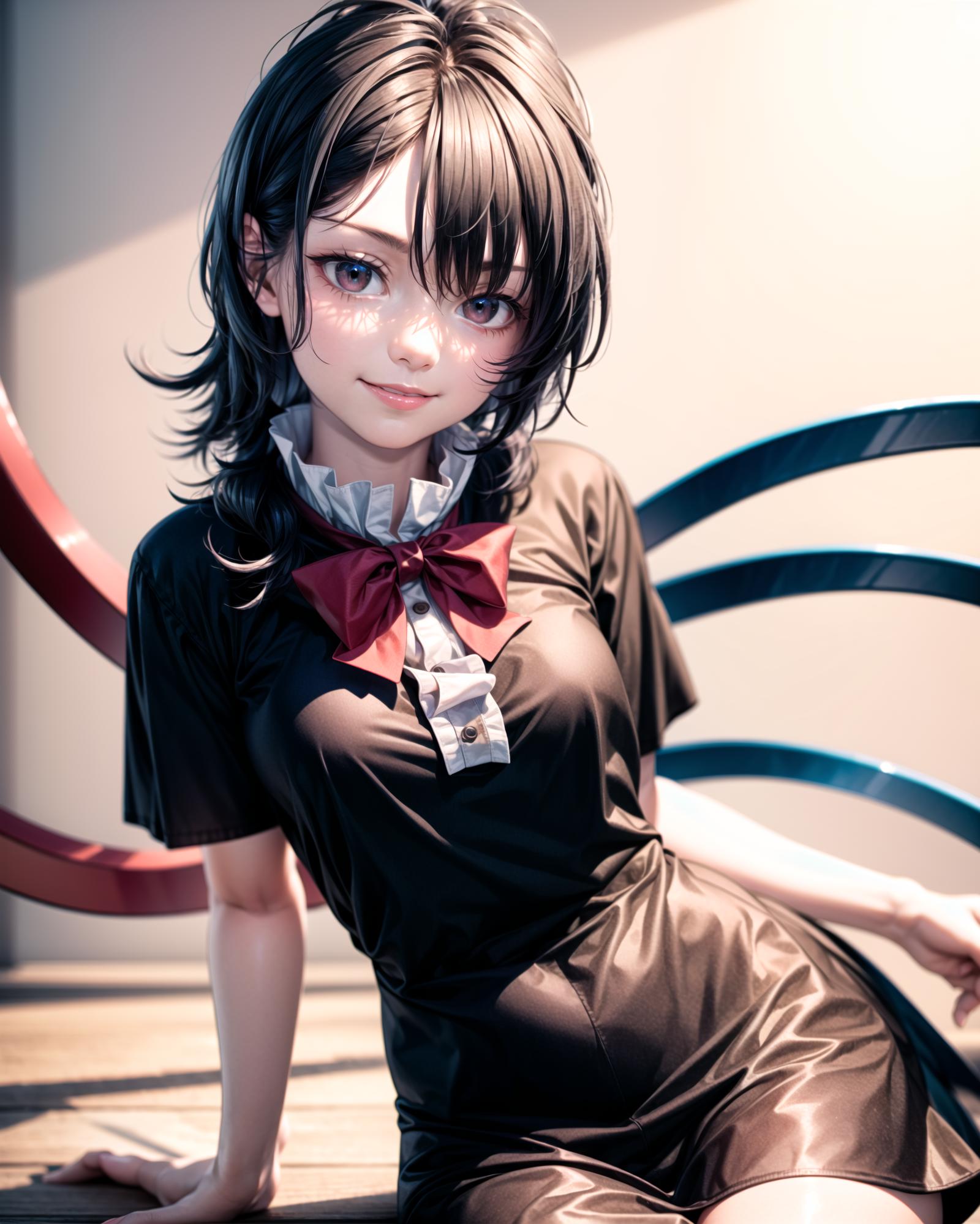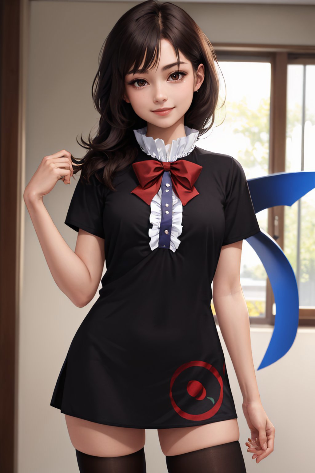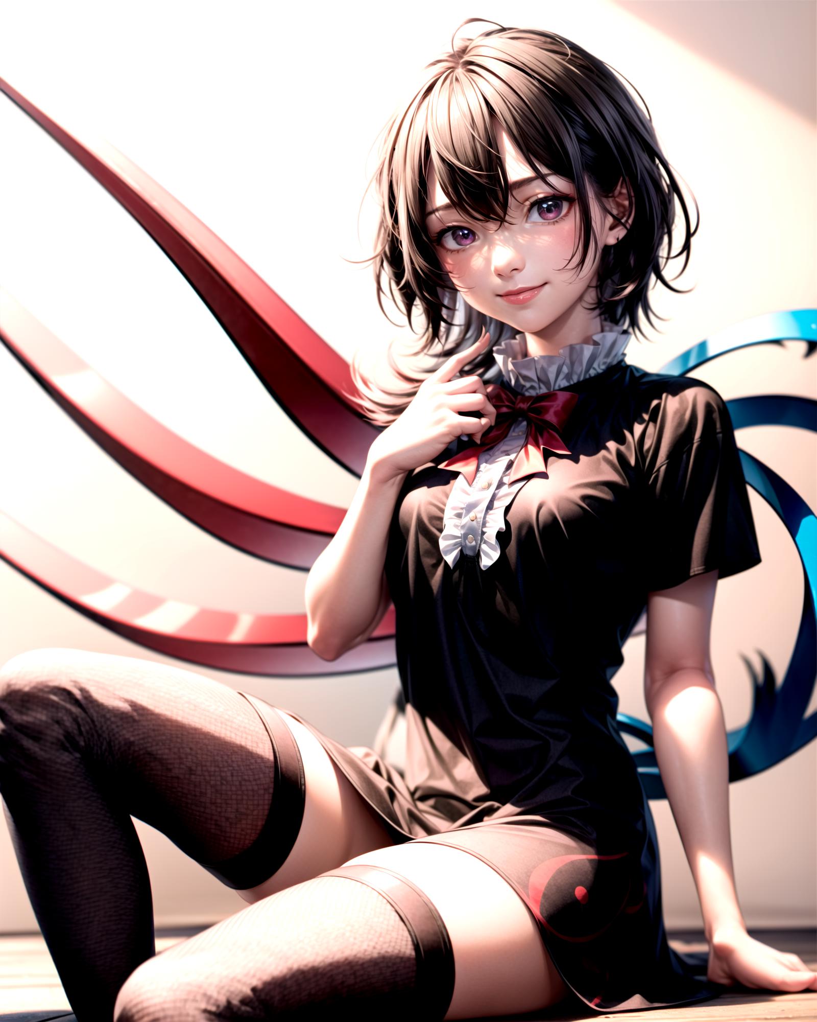 Default Outfit: black dress, red bowtie, short sleeves, black thighhighs