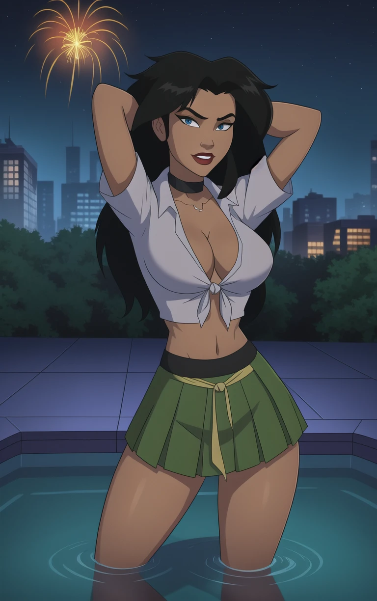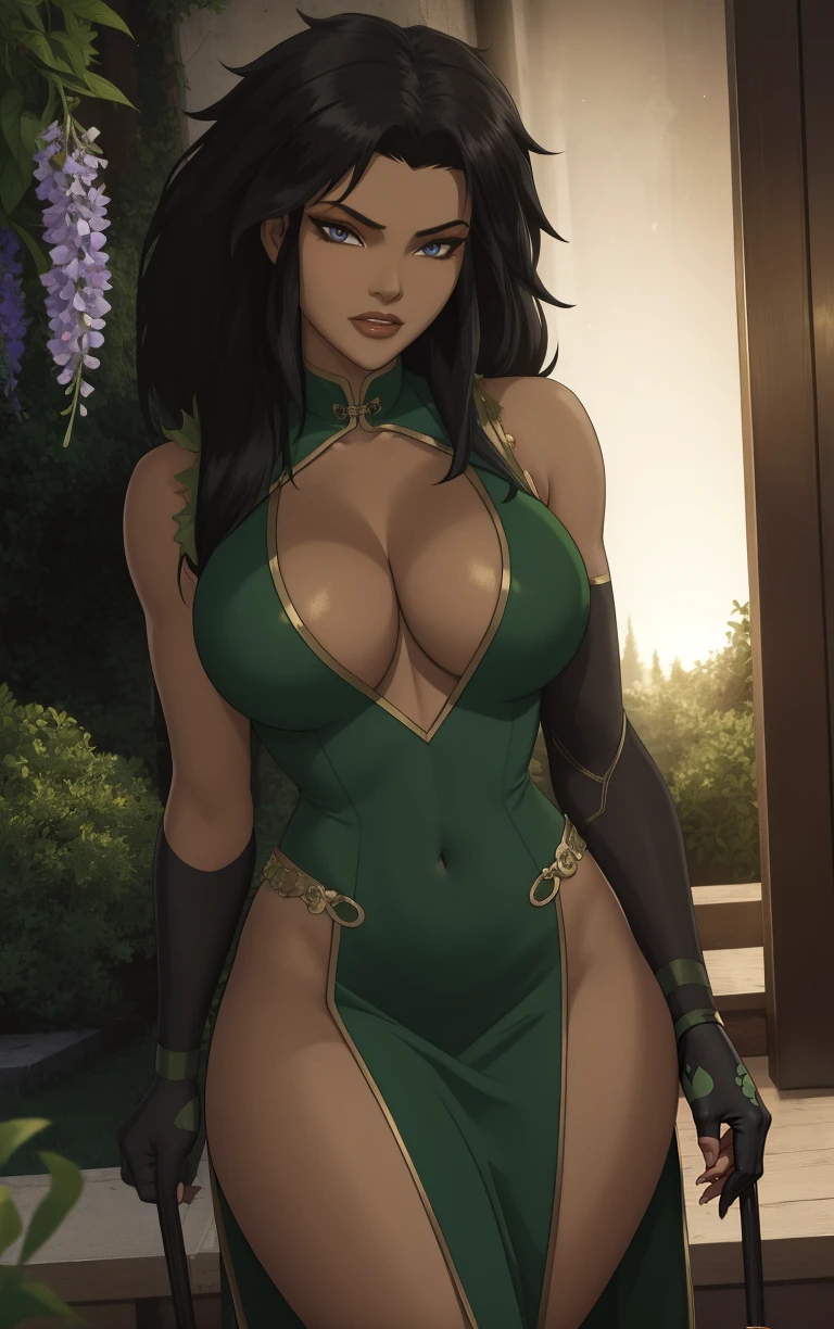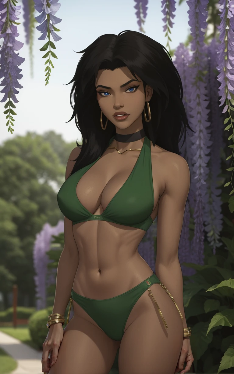 1girl, breasts, large breasts, dark skin, dark-skinned female, lips, makeup, medium breasts, thighs, tan, big hair, black hair, spiked hair, long hair, lipstick,