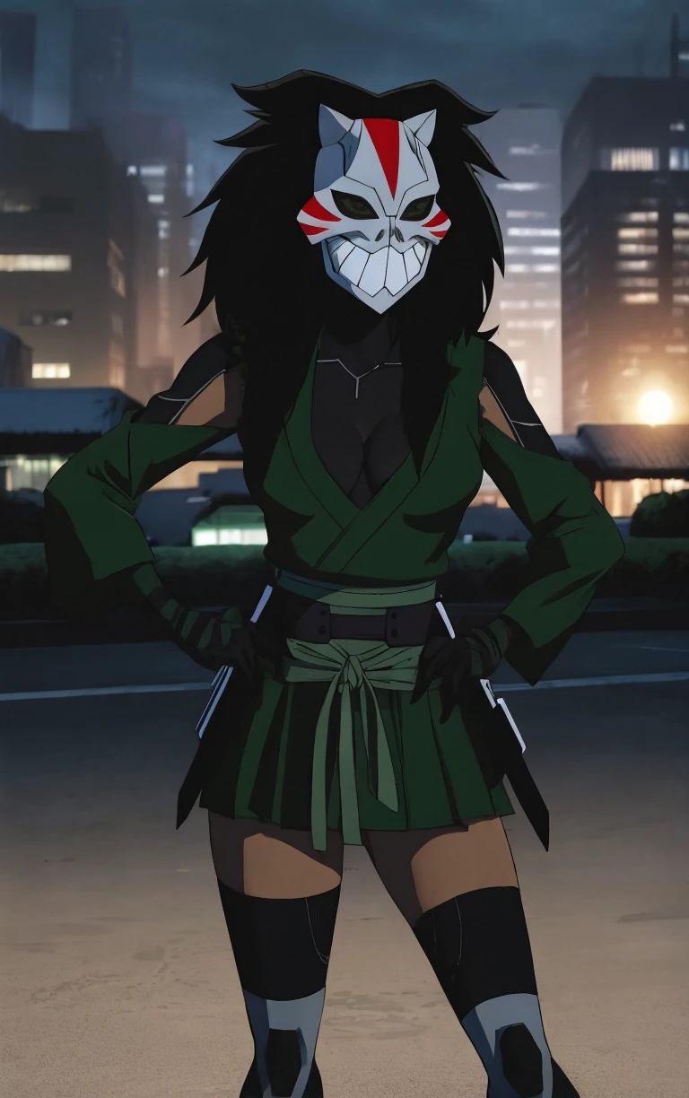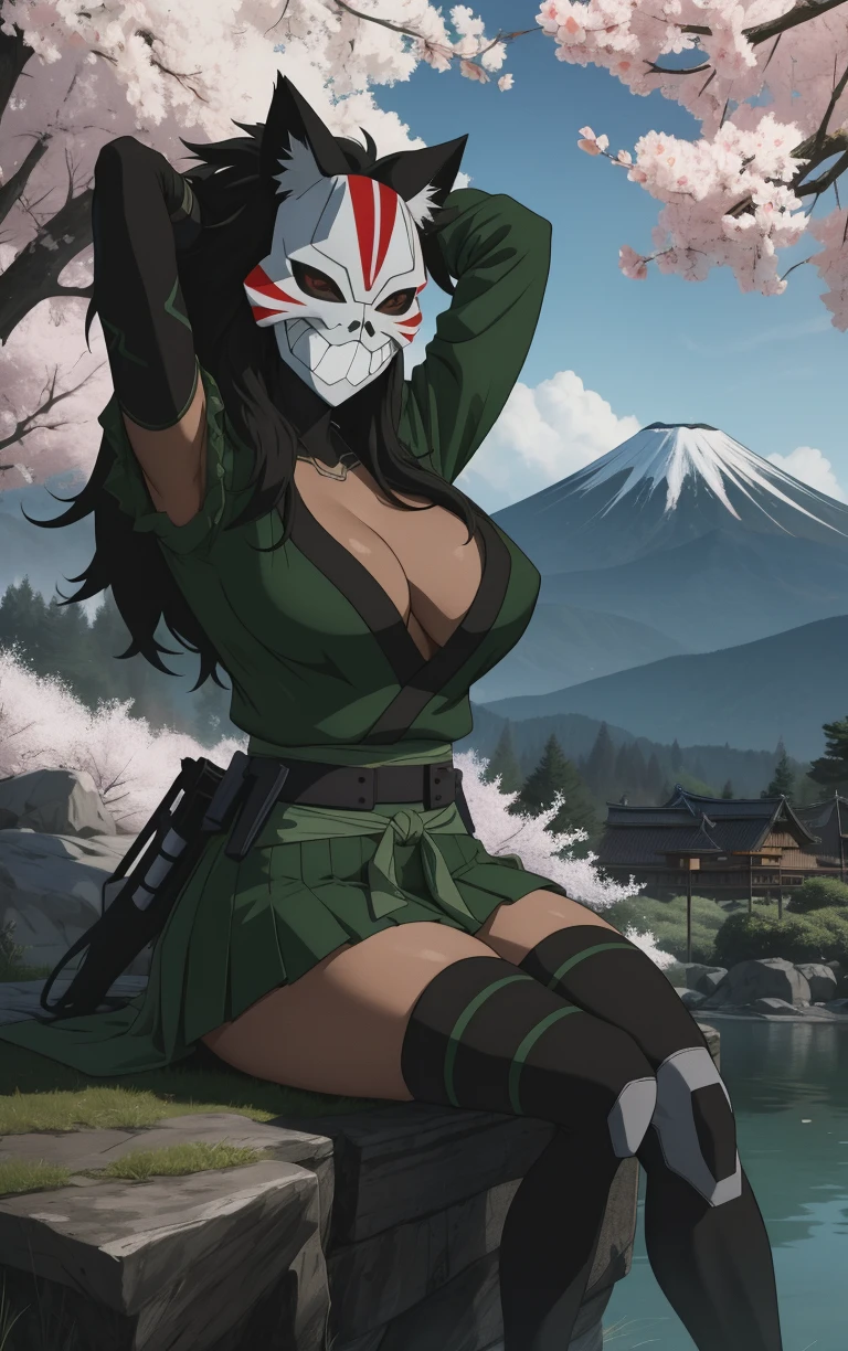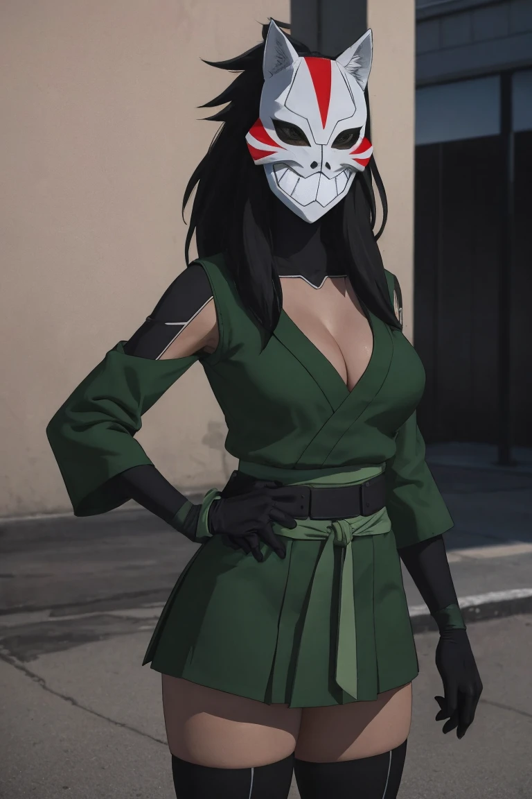 cleavage, asymmetrical_sleeves, black thighhighs, knee pads, thighhighs, japanese clothes, ninja, belt, skirt, black legwear, boots, black gloves, elbow gloves, long sleeves, green jacket, green shirt, green vest, ribbon,