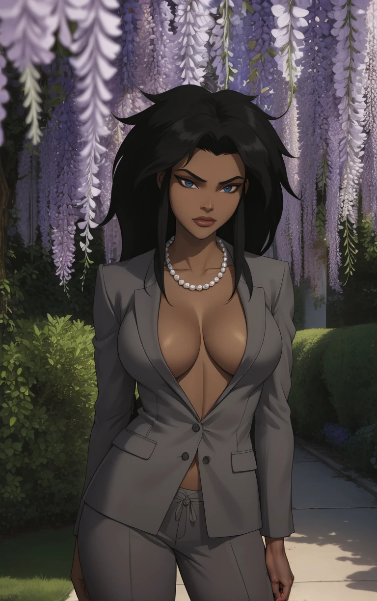jewelry, necklace, formal, pants, suit, cleavage, ??????????, jacket, no bra, pearl necklace, open clothes, open shirt, pant suit, grey suit,