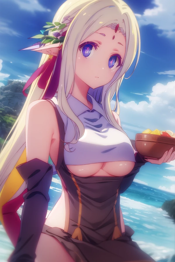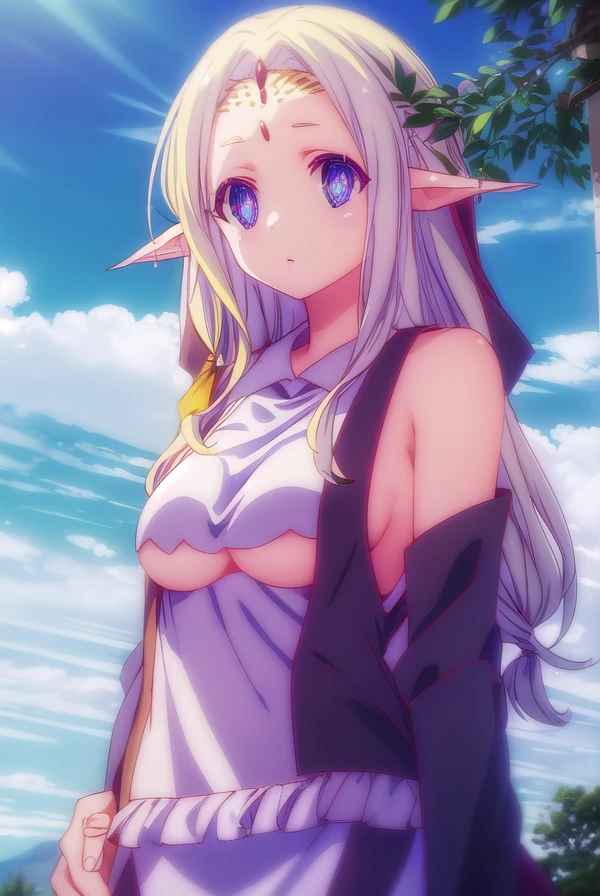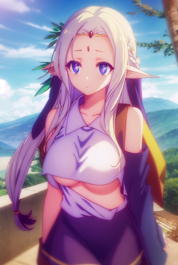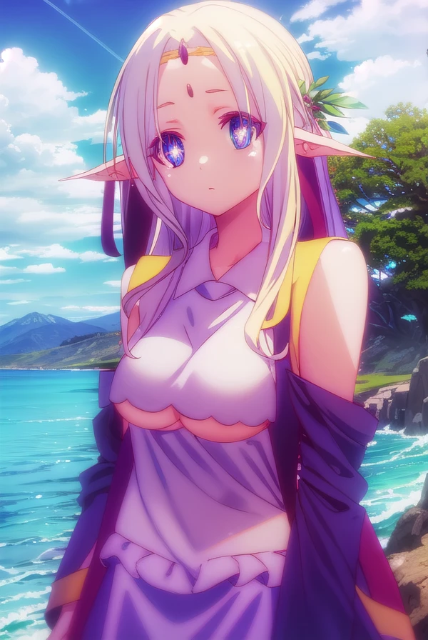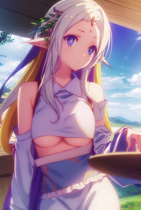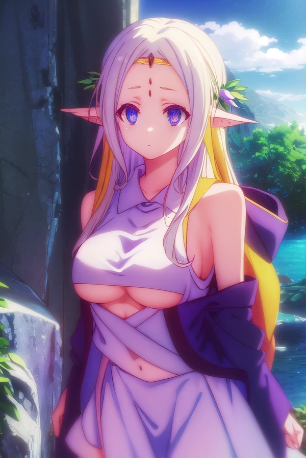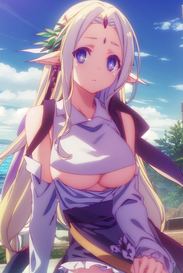 fiel nirvalen, long hair, blonde hair, hair ornament, (purple eyes:1.1), pointy ears, elf, circlet, (parted bangs:1.5),