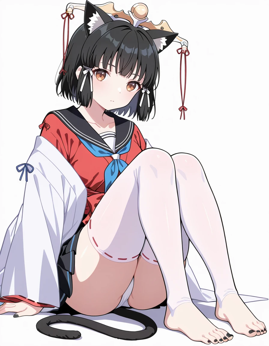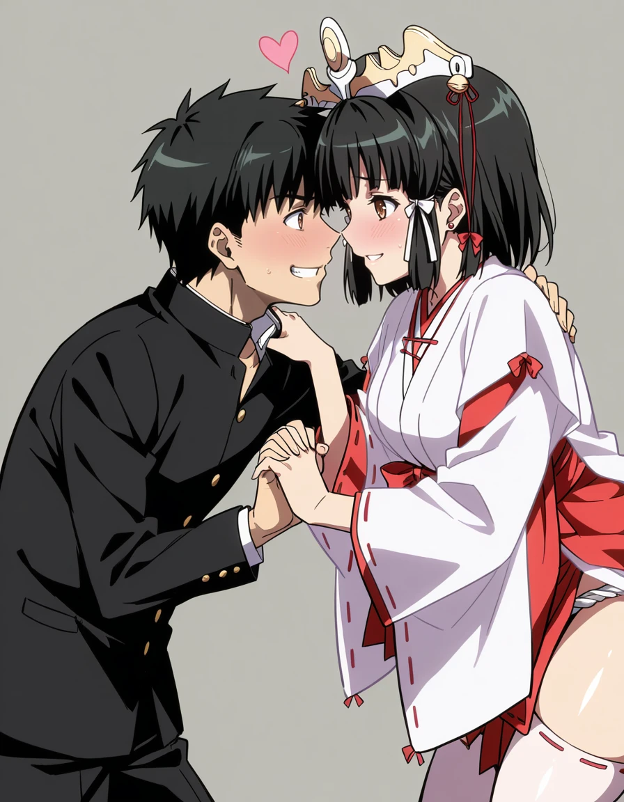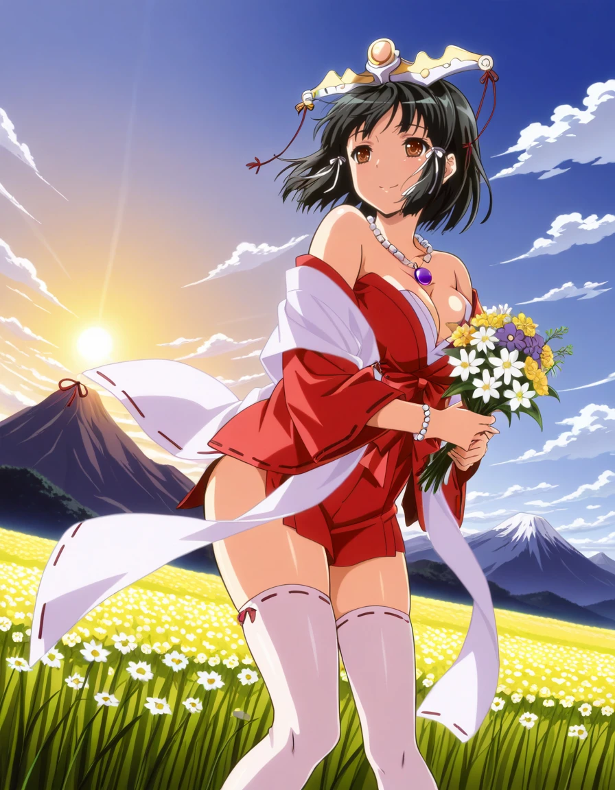 kaguya, black_hair, brown_eyes, japanese_clothes, ribbon, miko, hair_ribbon, large_breasts, white_thighhighs, hair_ornament