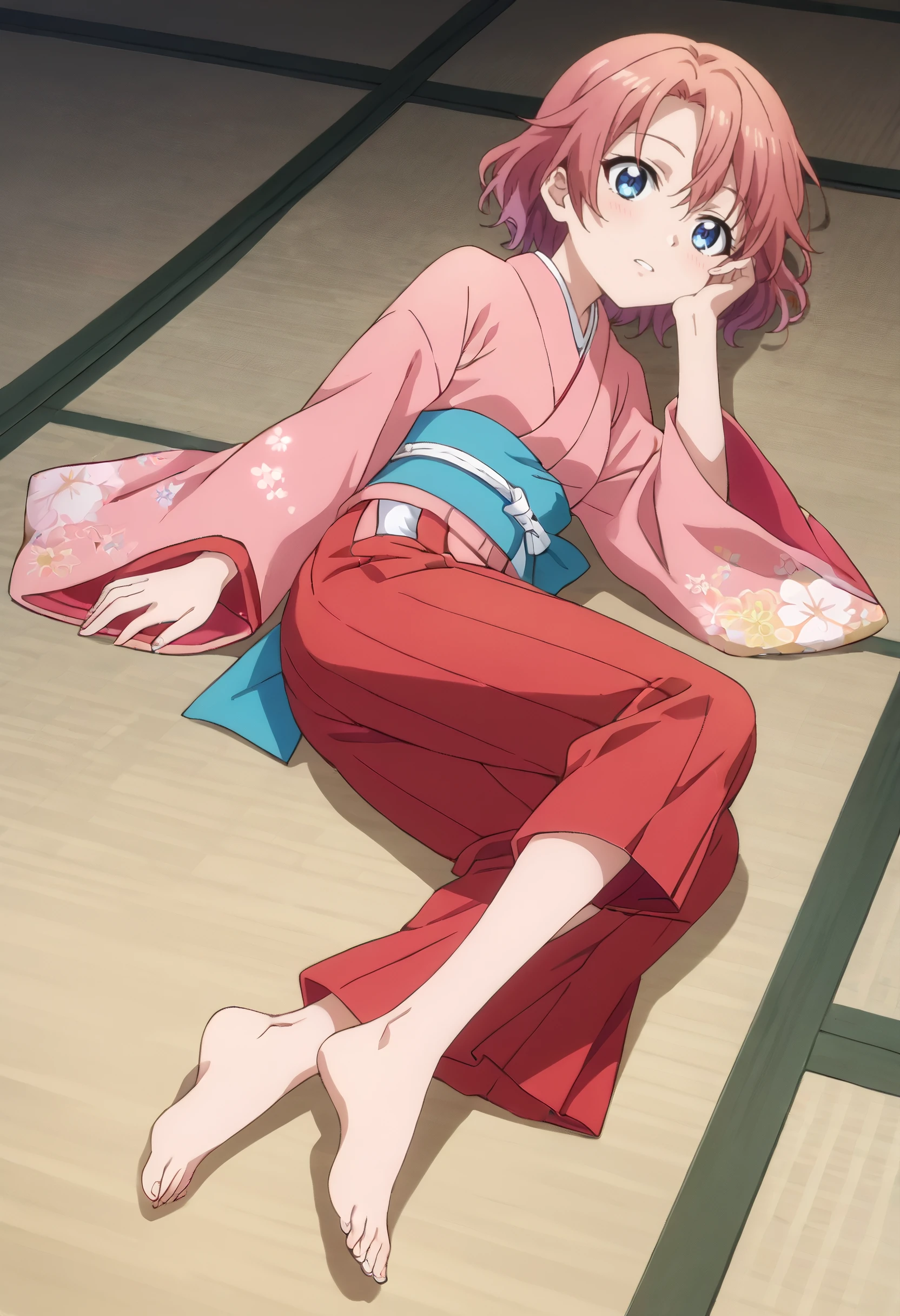 RikoRobe, japanese clothes, kimono, pink kimono, hakama, hakama skirt, long sleeves, obi, sash, red hakama, wide sleeves, barefoot,