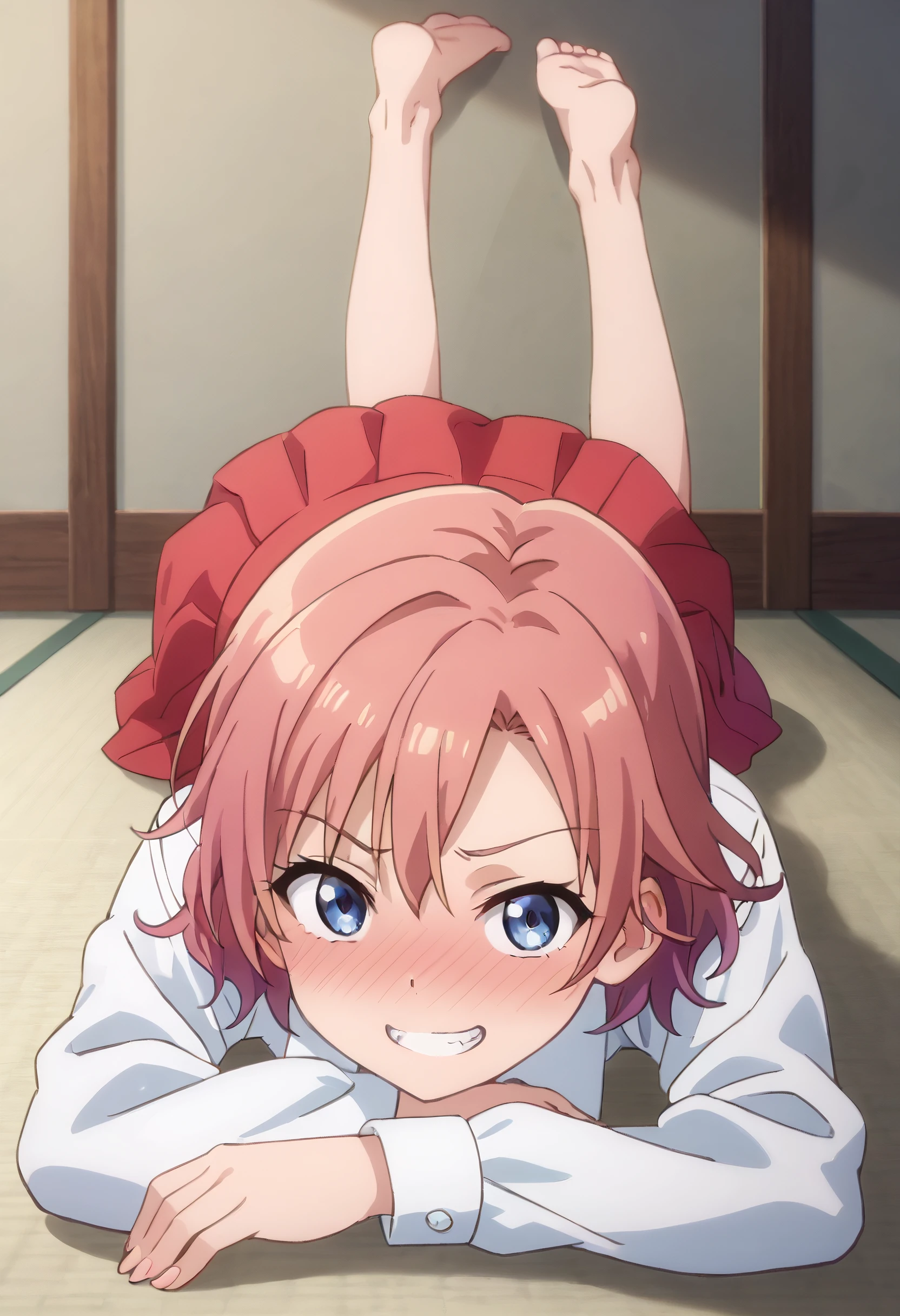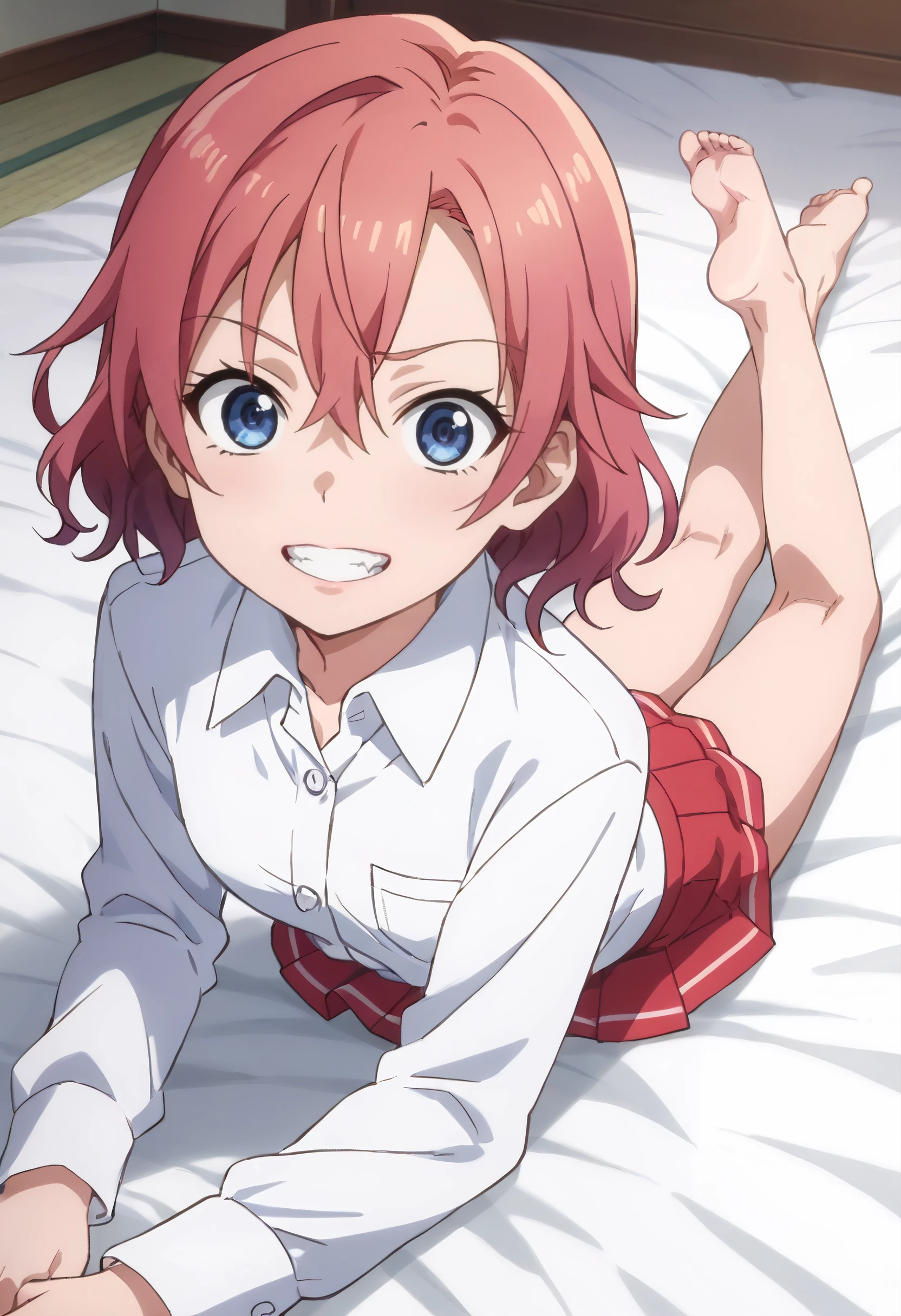 RikoShirt, white shirt, shirt, collared shirt, dress shirt, wing collar, long sleeves, red skirt, skirt, miniskirt, buttons, pleated skirt, casual,