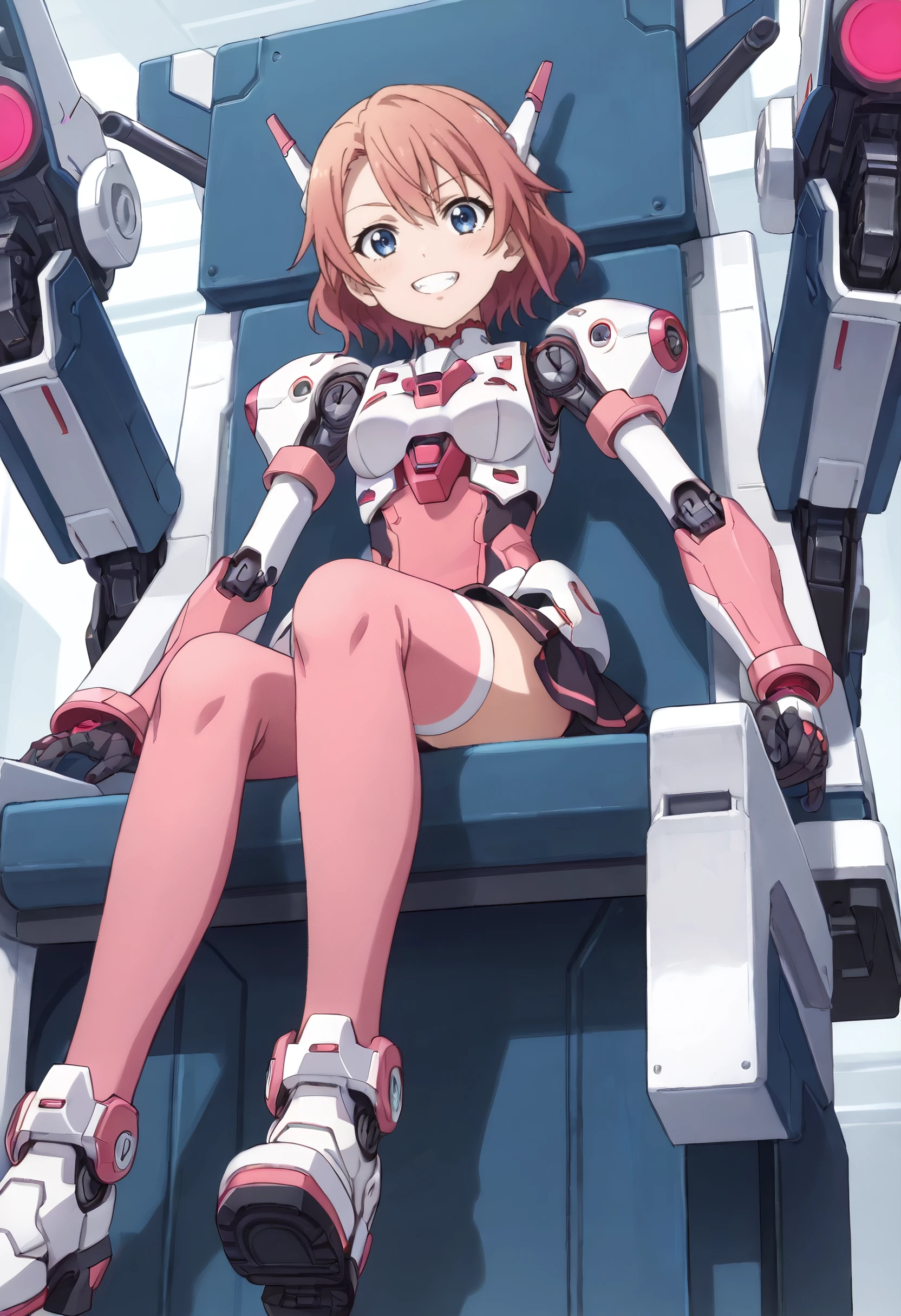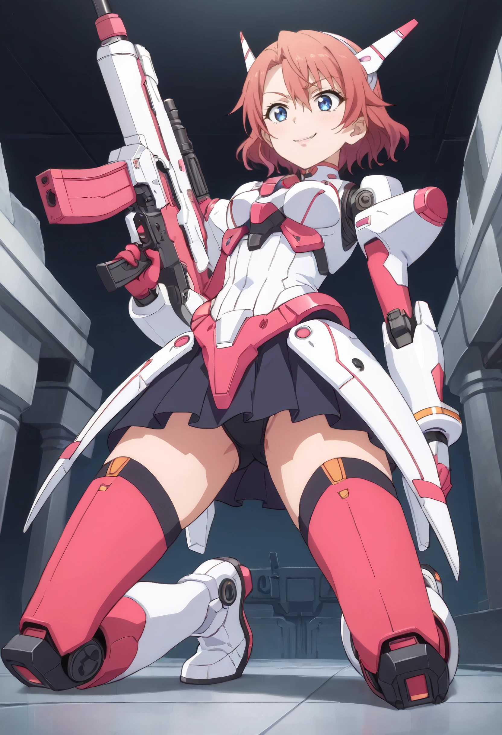RikoMecha, weapon, gloves, gun, rifle, mecha musume, thighhighs, mecha, headgear, beam rifle, science fiction, machinery, skirt, boots, pilot suit, pink thighhighs, black skirt,