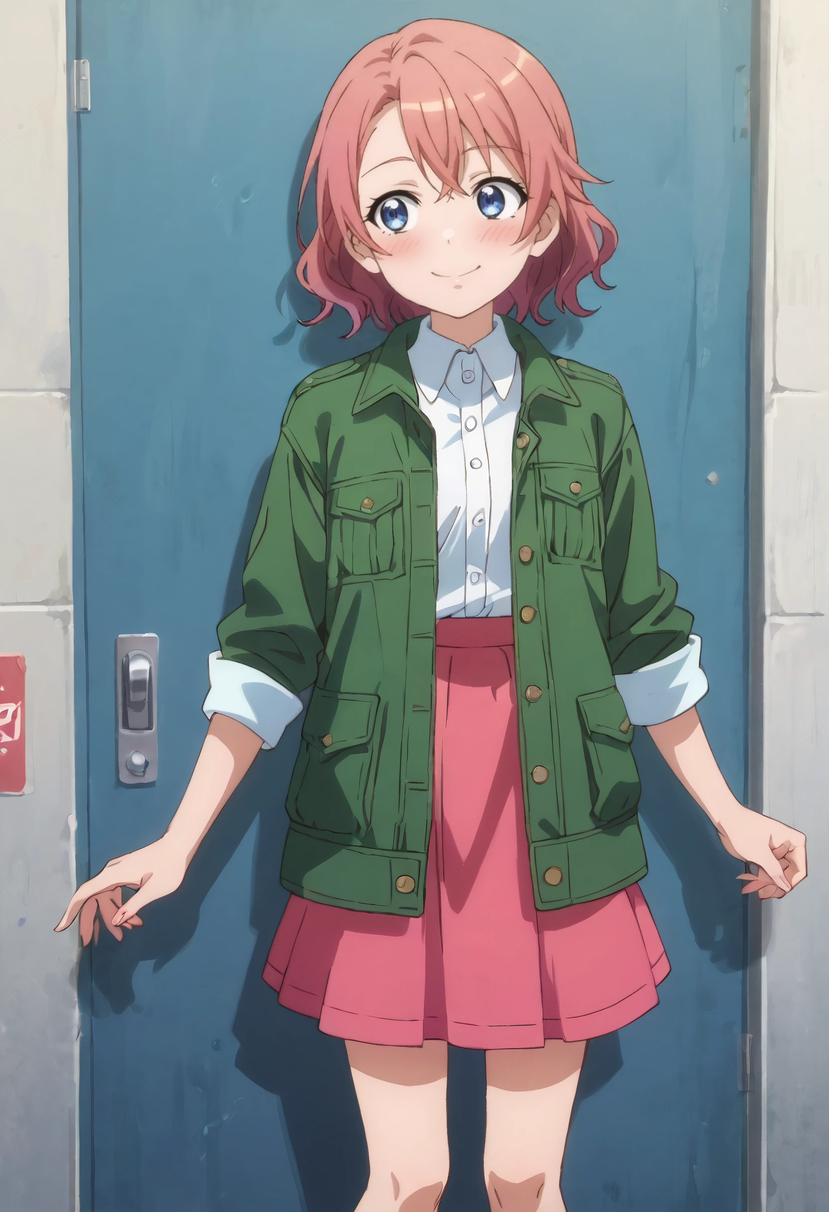 RikoJacket, shirt, green jacket, jacket, white shirt, collared shirt, long sleeves, skirt, buttons, wing collar, sleeves rolled up, pink skirt, socks, shoes, open jacket,