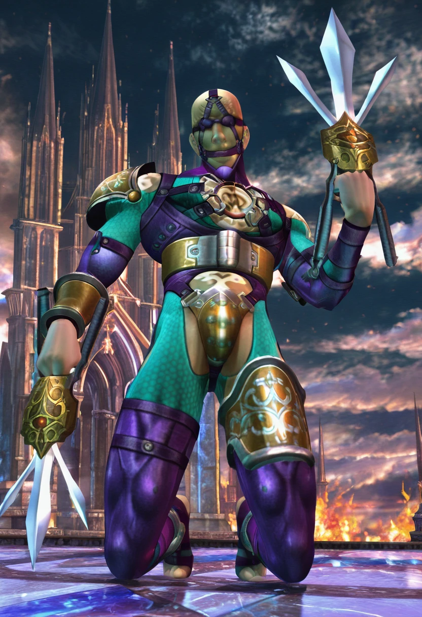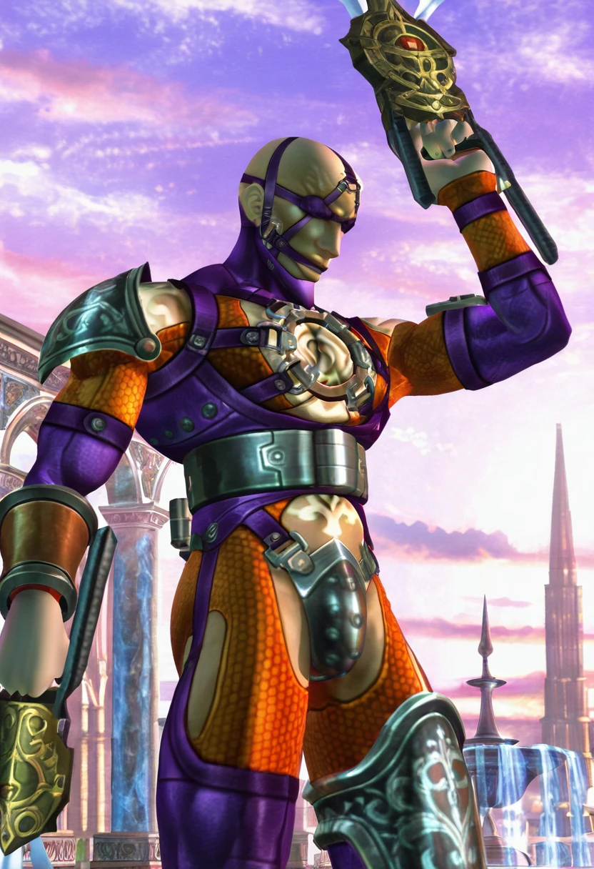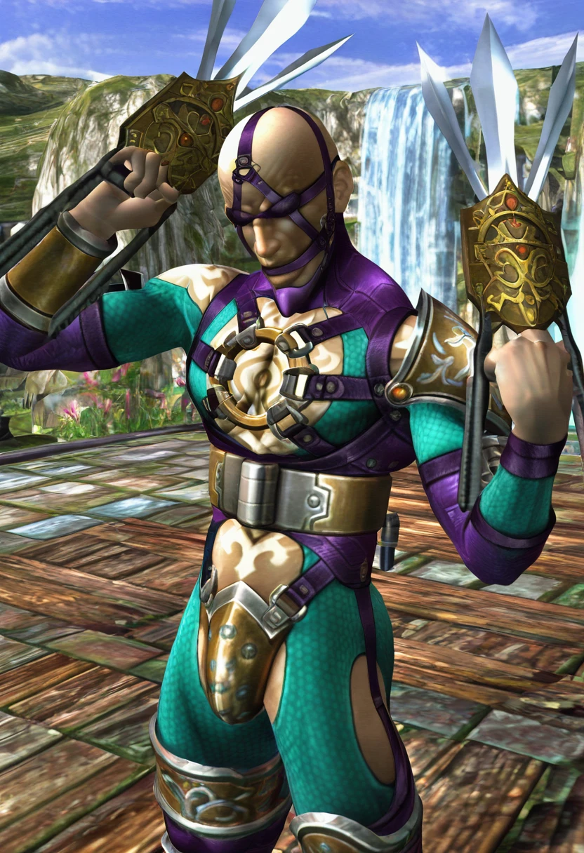 voldo, 1boy, toned male, skinny, tall, pectorals, chest tattoo, shoulder tattoo, stomach tattoo, back tattoo, bald