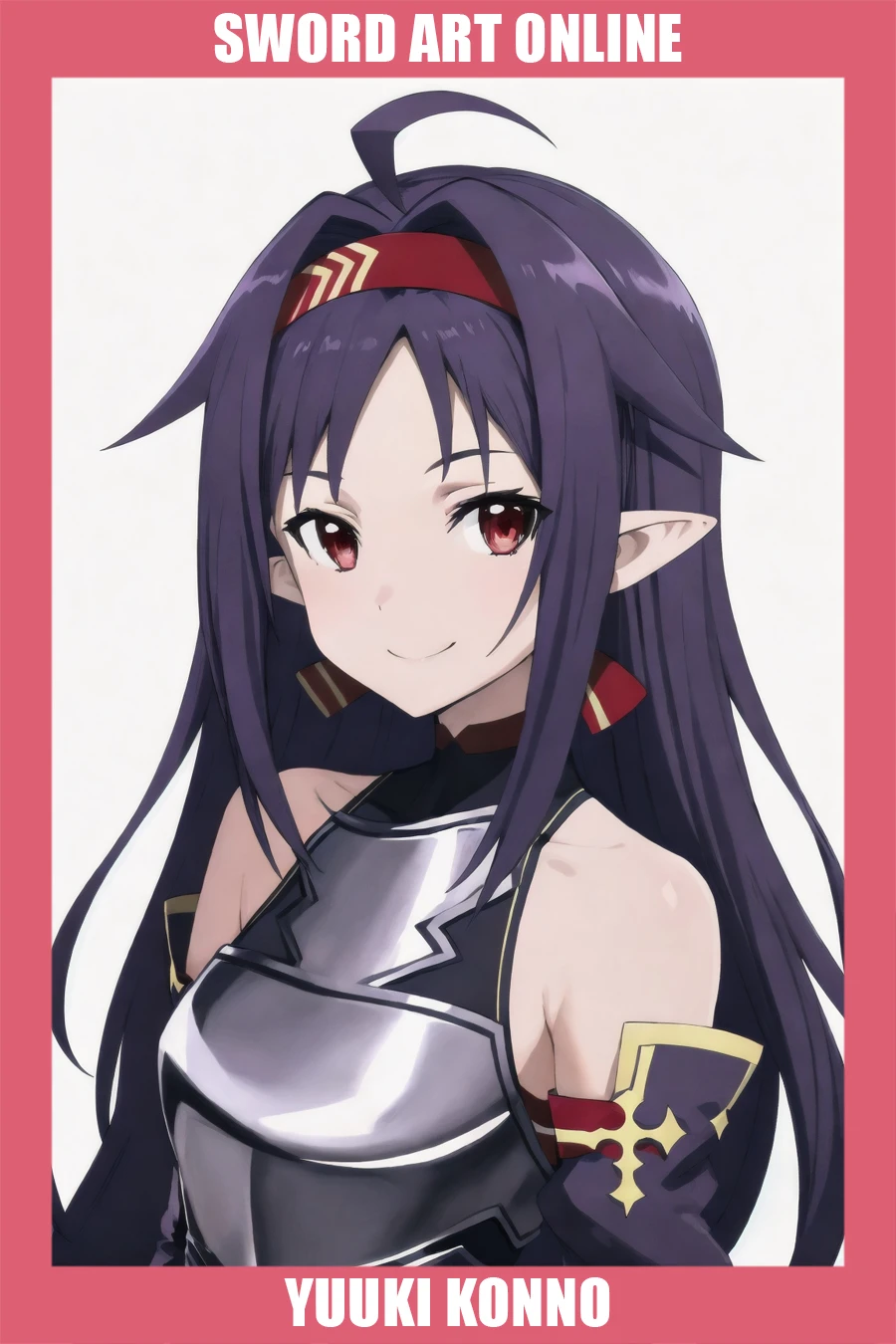 Character: konno yuuki, kizukiai, purple hair, hair intakes, red headband, very long hair, pointy ears, red eyes, small breasts, ahoge, parted bangs