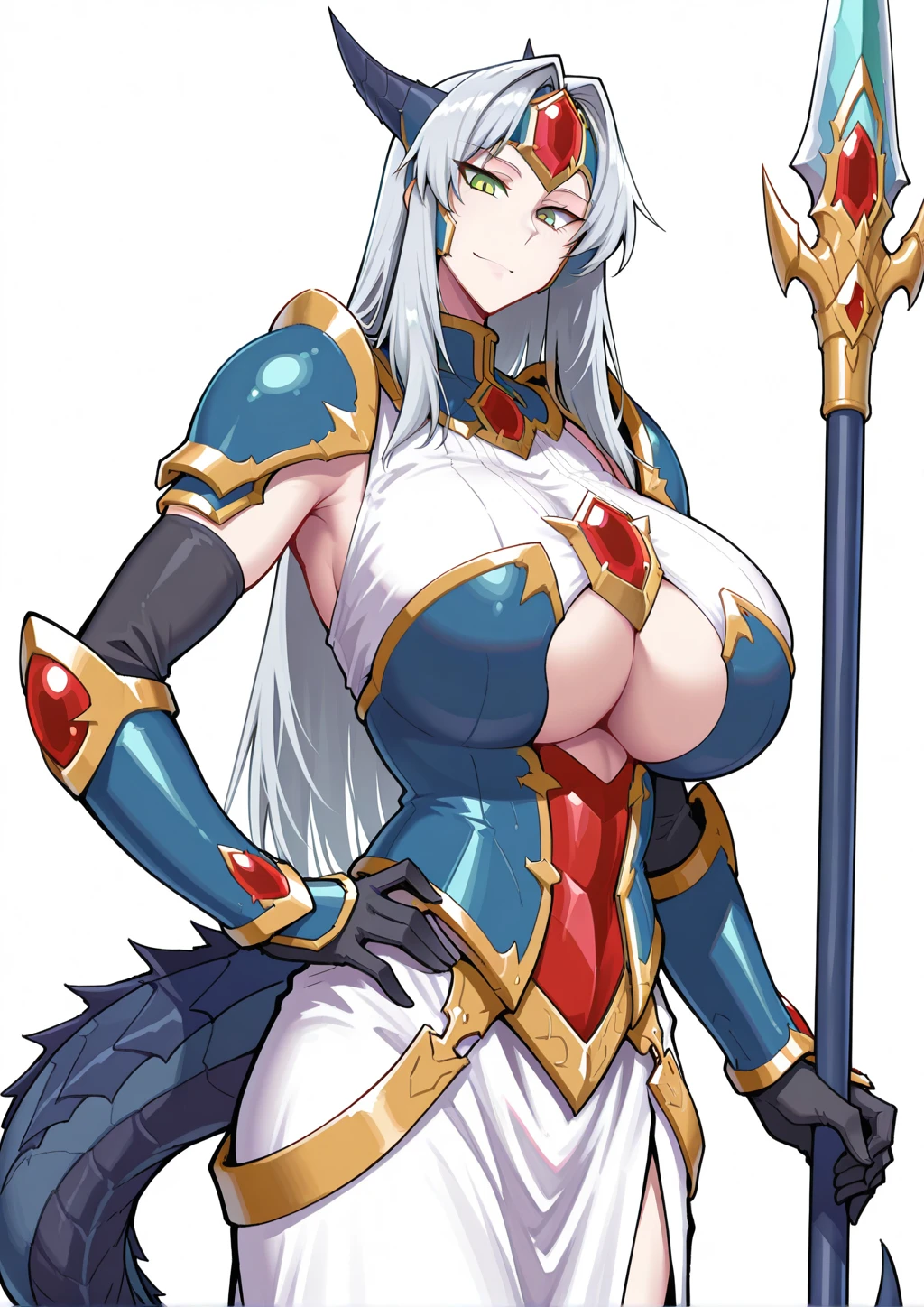 zapphire, silver hair, long hair, straight hair, hair intakes, long sidelocks, lime green eyes, tsurime, dark blue dragon horns, dragon tail, blue forehead protector, red forehead jewel, cheek pads, armored horns, blue shoulder armor, black elbow gloves, blue gorget, red jewel between breasts, red jewel on gauntlets, white sleeveless shirt, underboob cutout, multicolored corset armor, blue corset armor, red corset armor, gold trim, gold hip belt, white skirt, long skirt, side slit skirt, red trim skirt, black thighhighs, blue armored boots