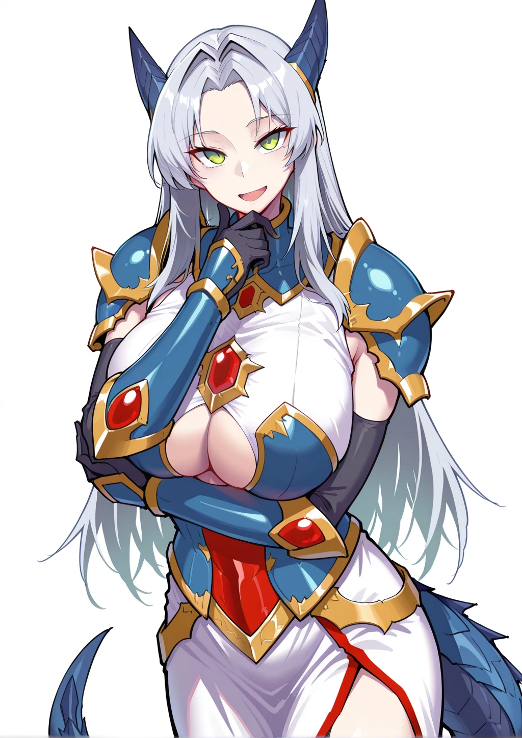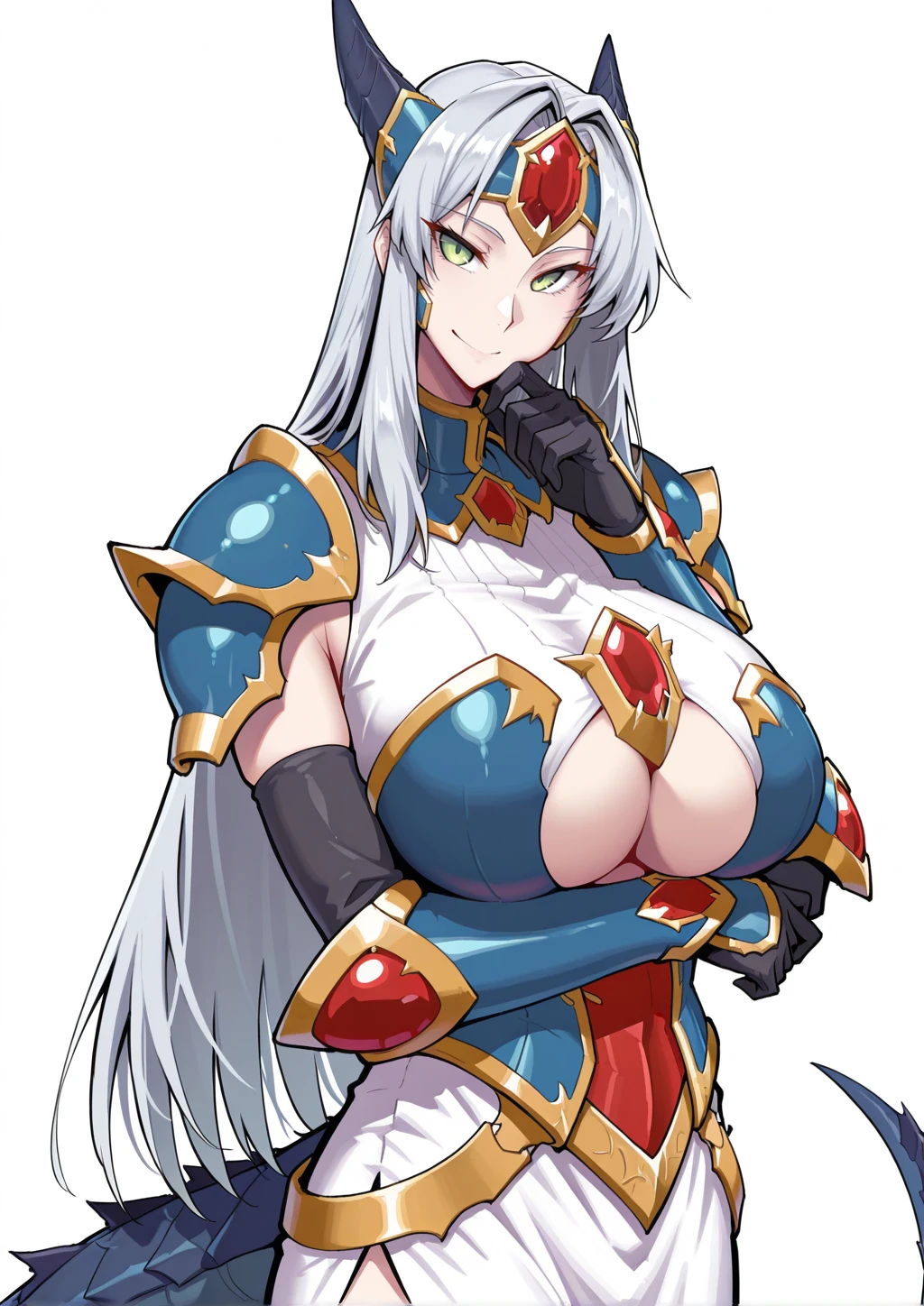 zapphire, silver hair, long hair, straight hair, hair intakes, long sidelocks, lime green eyes, tsurime, dark blue dragon horns, dragon tail, blue forehead protector, red forehead jewel, cheek pads, armored horns, blue shoulder armor, black elbow gloves, blue gorget, red jewel between breasts, red jewel on gauntlets, white sleeveless shirt, underboob cutout, multicolored corset armor, blue corset armor, red corset armor, gold trim, gold hip belt, white skirt, long skirt, side slit skirt, red trim skirt, black thighhighs, blue armored boots装備無し