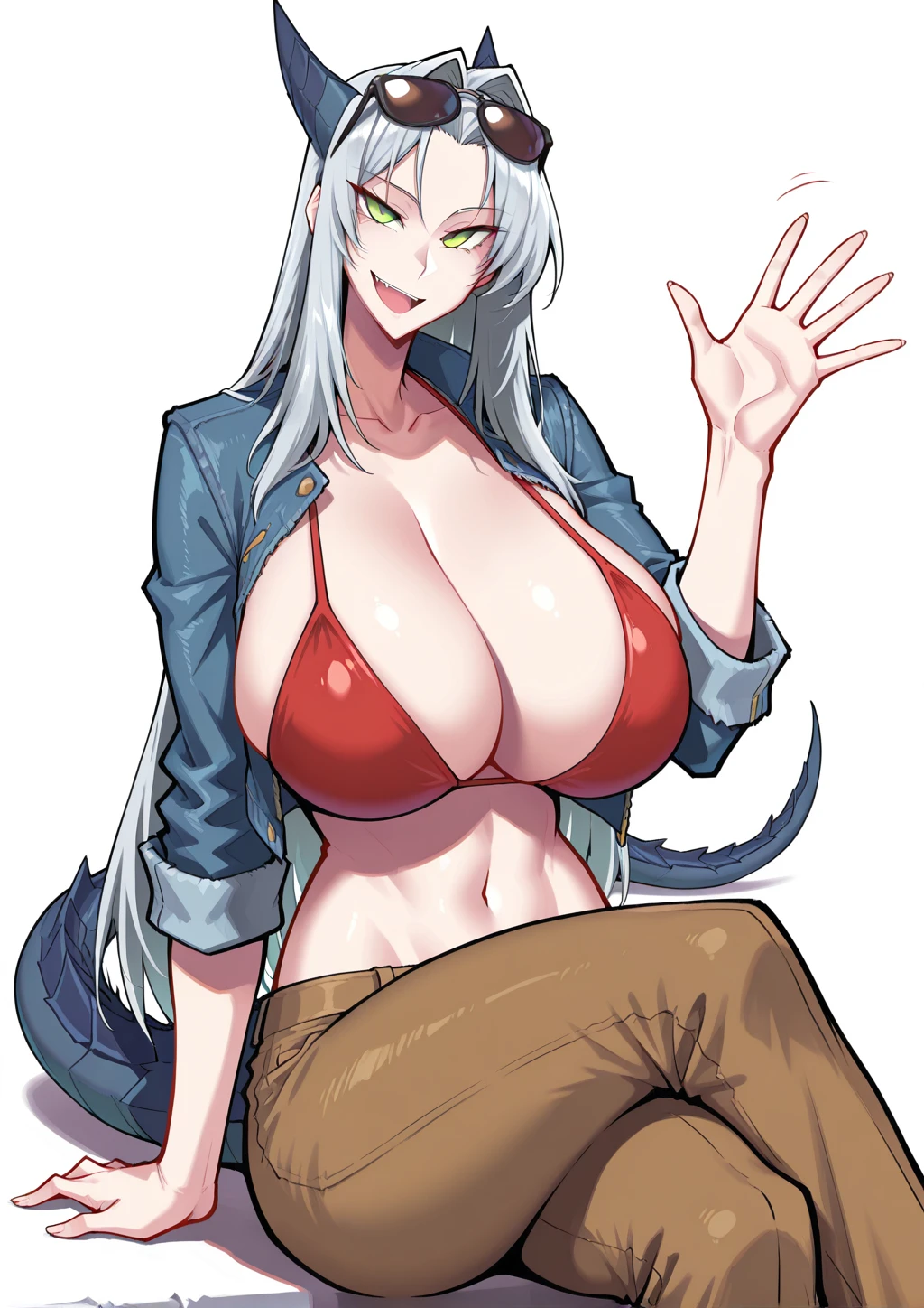 zapphire, silver hair, long hair, straight hair, hair intakes, long sidelocks, forehead, lime green eyes, tsurime, dark blue dragon horns, dragon tail