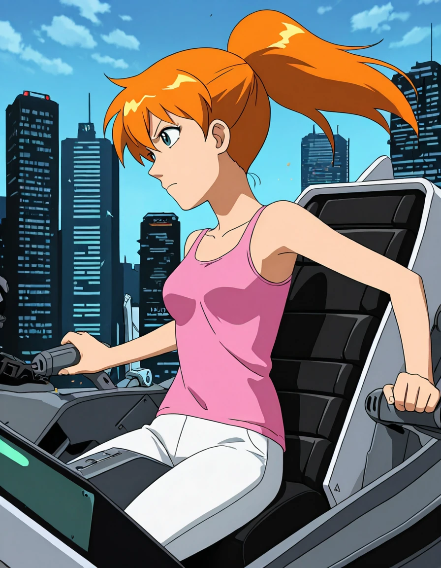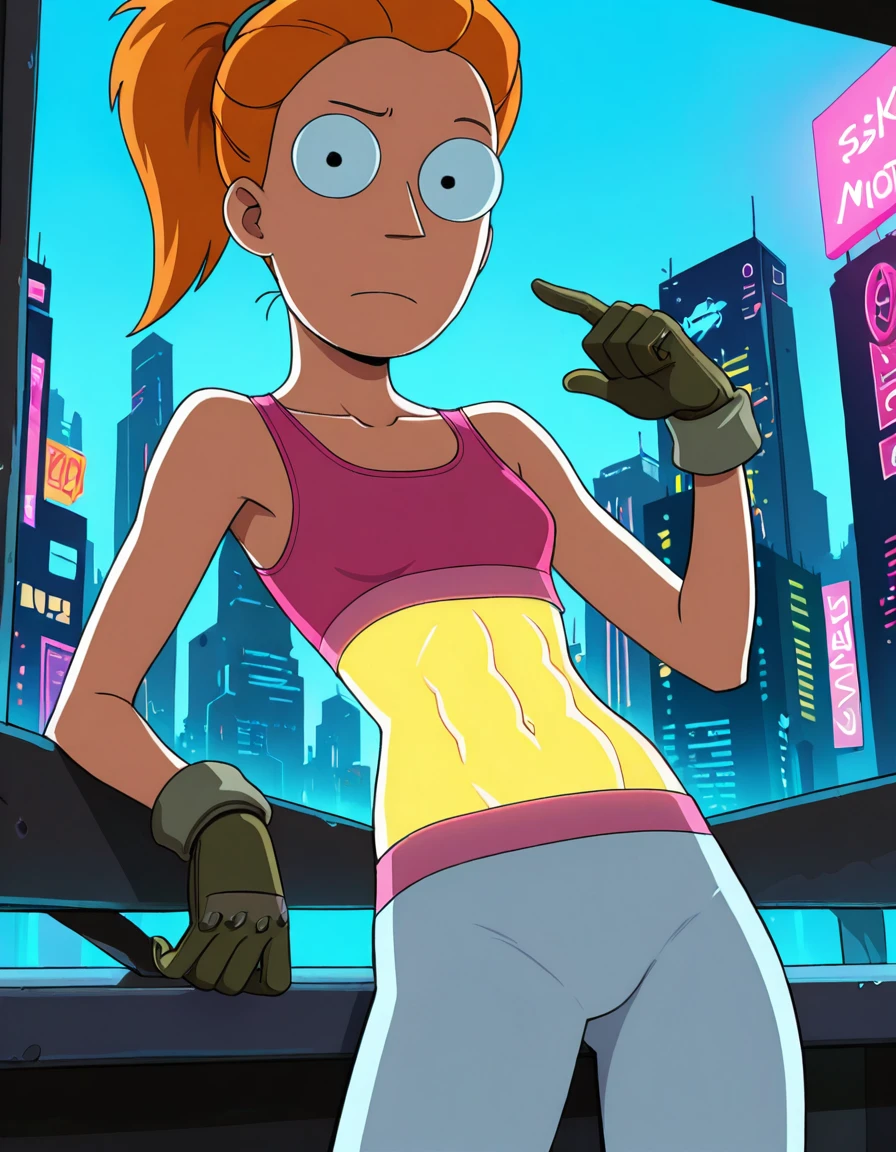 orange hairponytail(highly recommended if you don't specify another hairstyle)pink tank topwhite pants
