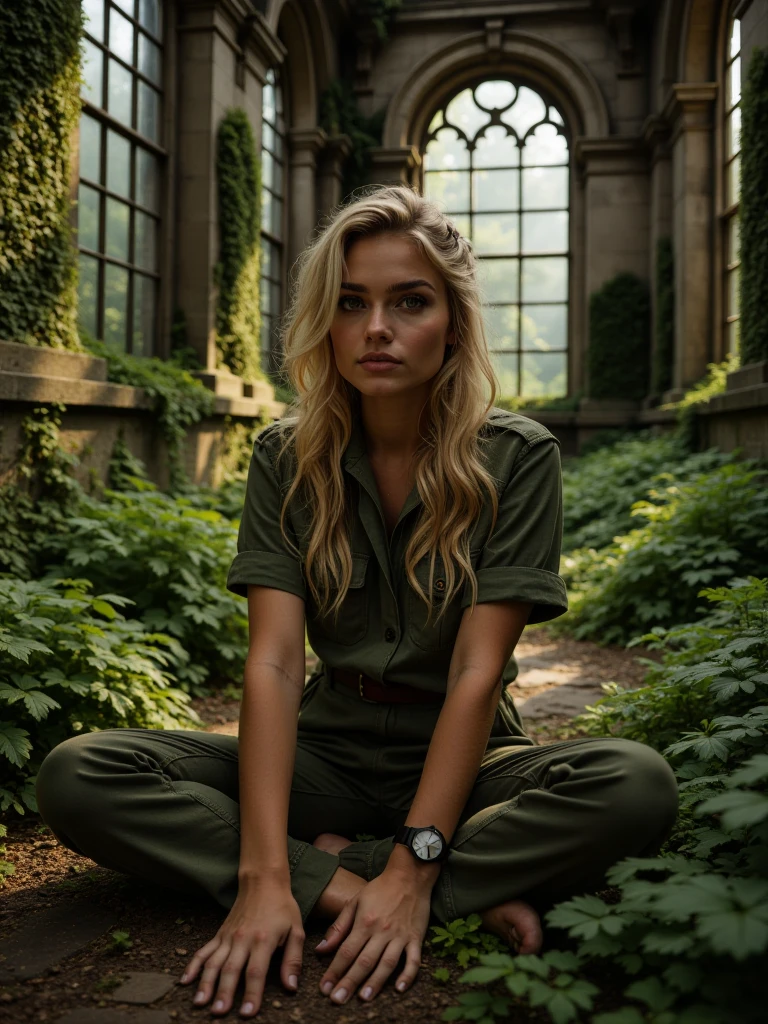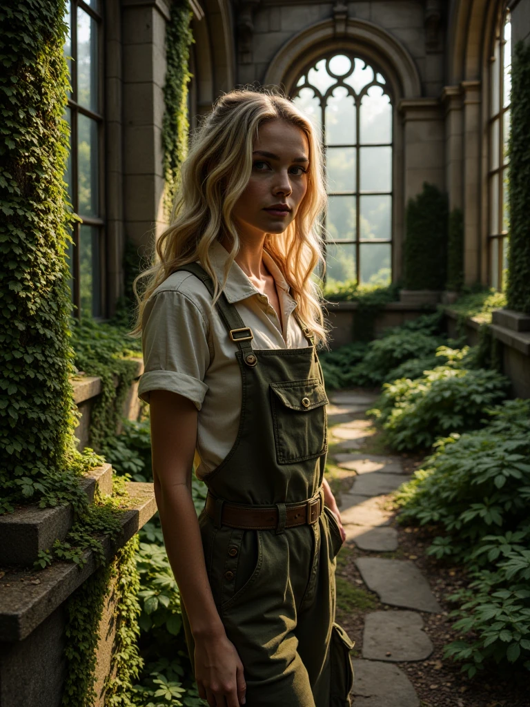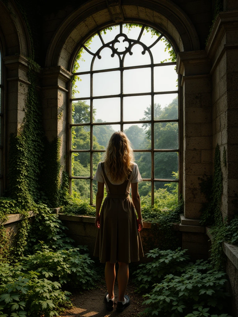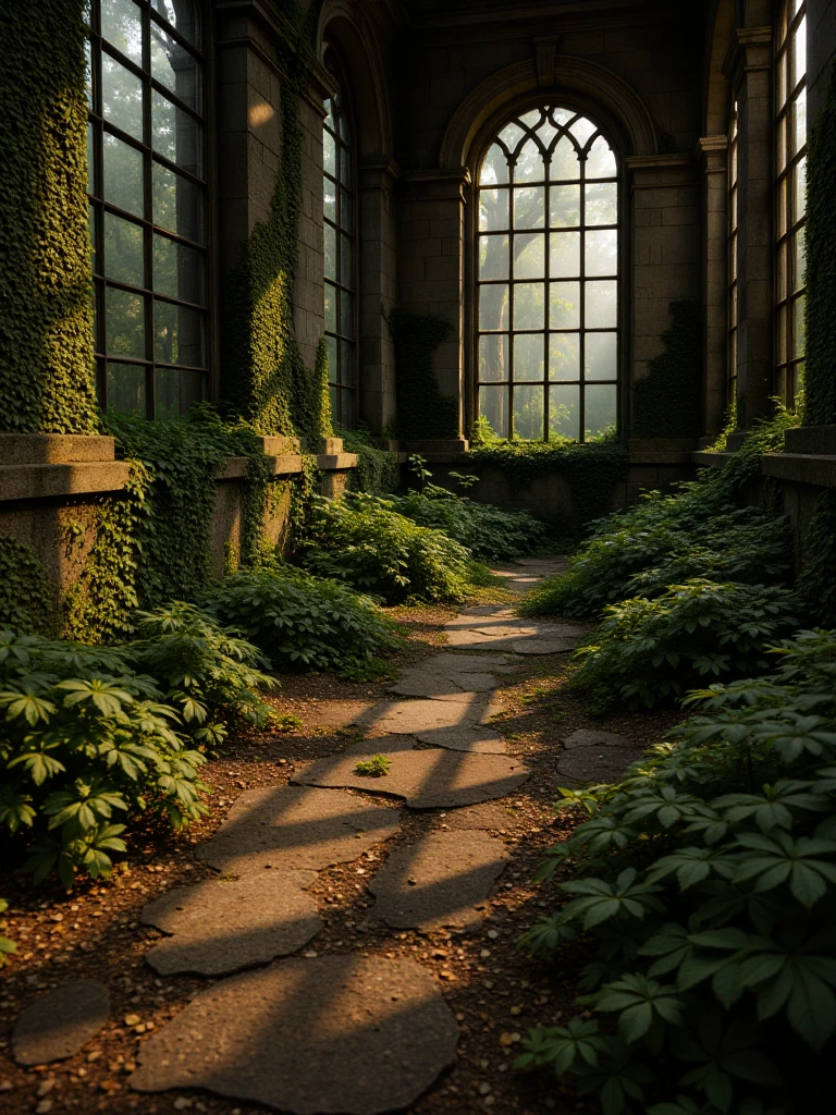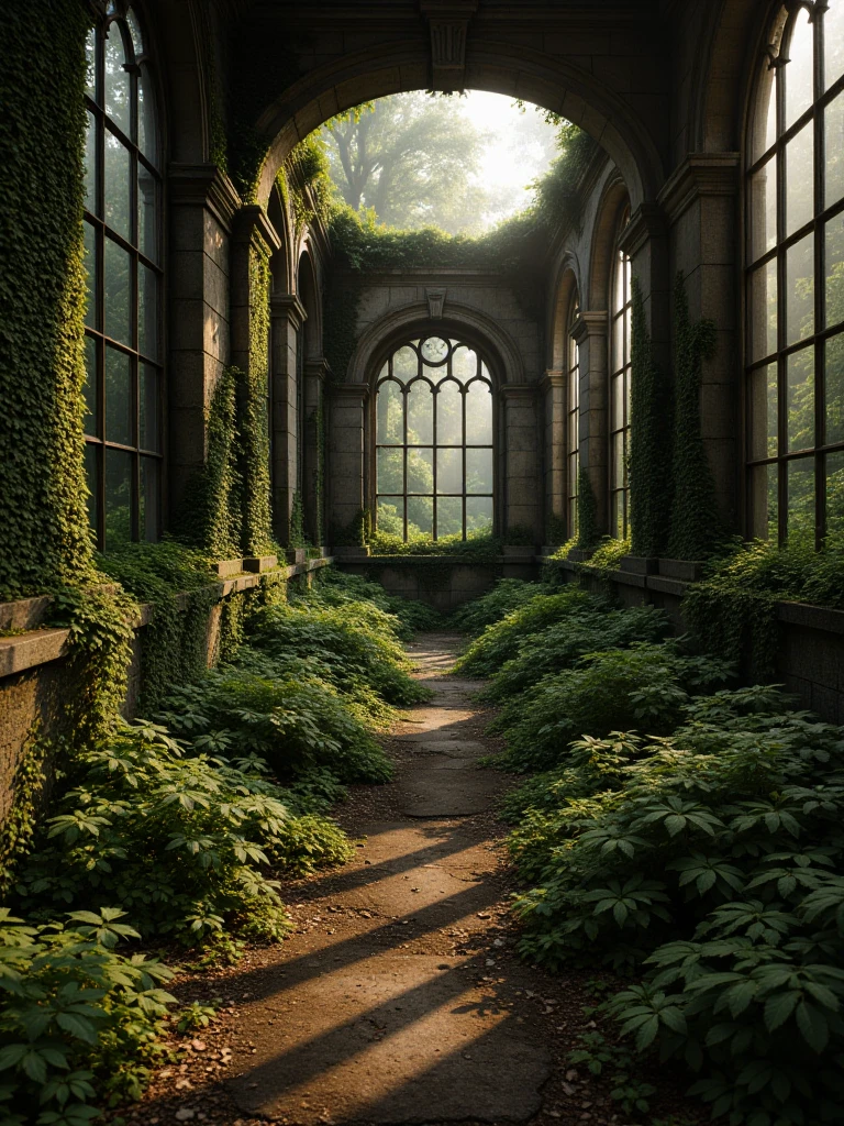Ancient Ruins Reclaimed By Nature, a photorealistic gothic conservatory overtaken by centuries of growth, featuring irregular stone slabs coated in vivid green moss forming a path through the interior. Massive stone walls and pillars are heavily draped in ivy and climbing plants, partially concealing carved blocks and scattered debris. Tall arched windows with intricate gothic tracery frame dense forest outside, while the roof stands open to a luminous tree canopy above. Soft yet directional sunlight streams through leaves and windows, creating sharp, defined shadows across the mossy floor and textured stone surfaces. The atmosphere is clear, serene, and mystical, with high dynamic range lighting, natural color balance, crisp air, and cinematic depth emphasizing grandeur and decay in harmonious equilibrium.