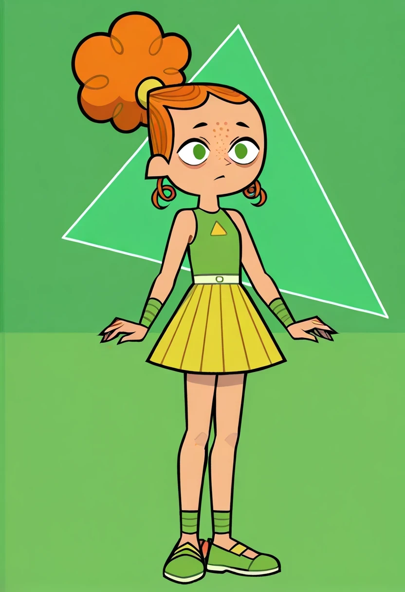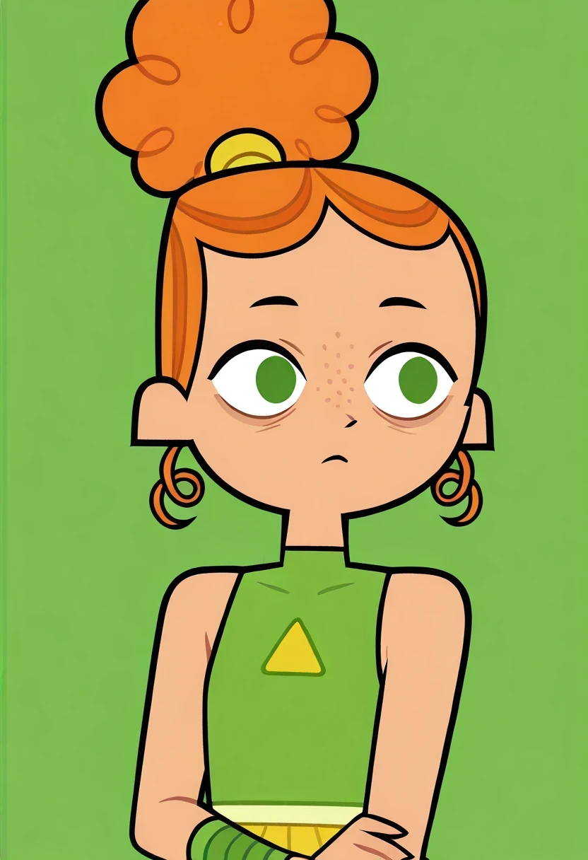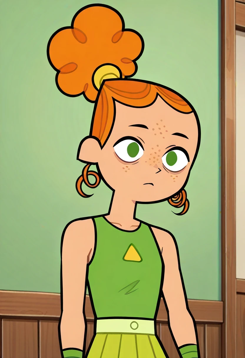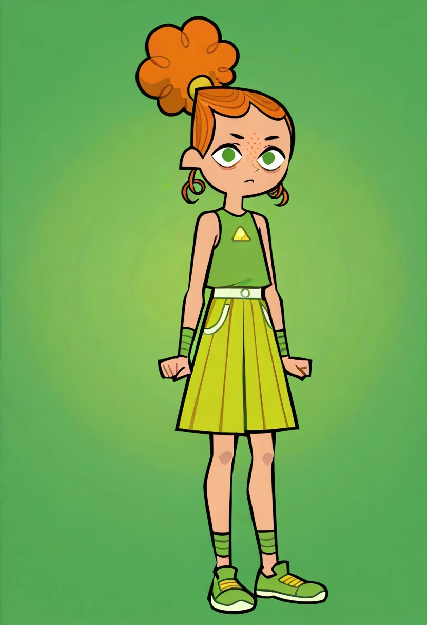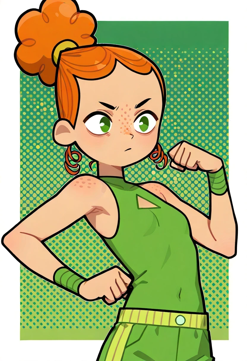 IzzyTDR, 1girl, curly orange hair, hair styled in a bun, green eyes, green top with a triangle cutout, light green, green shoes, green wristbands, freckles,