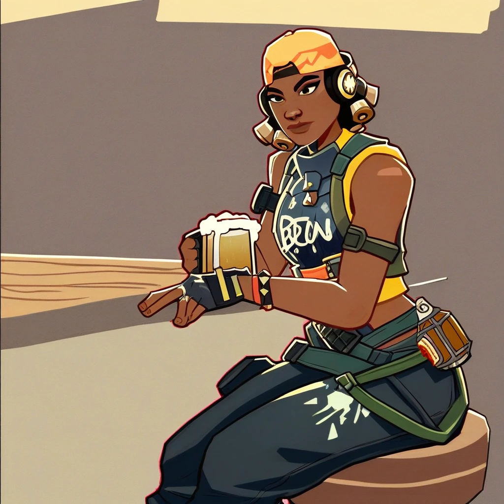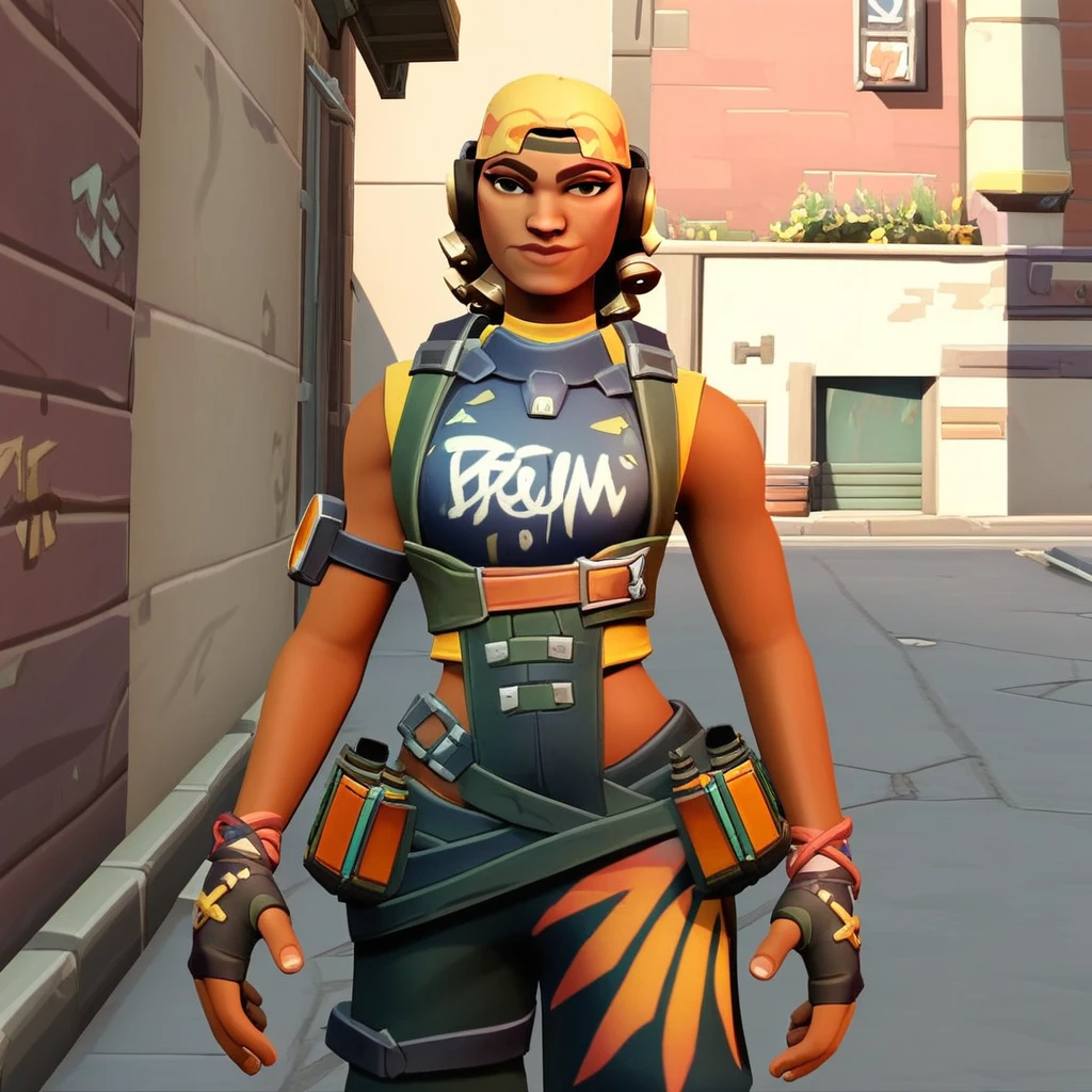 raze_valorant, dark skin, backwards hat, fingerless gloves, headphones