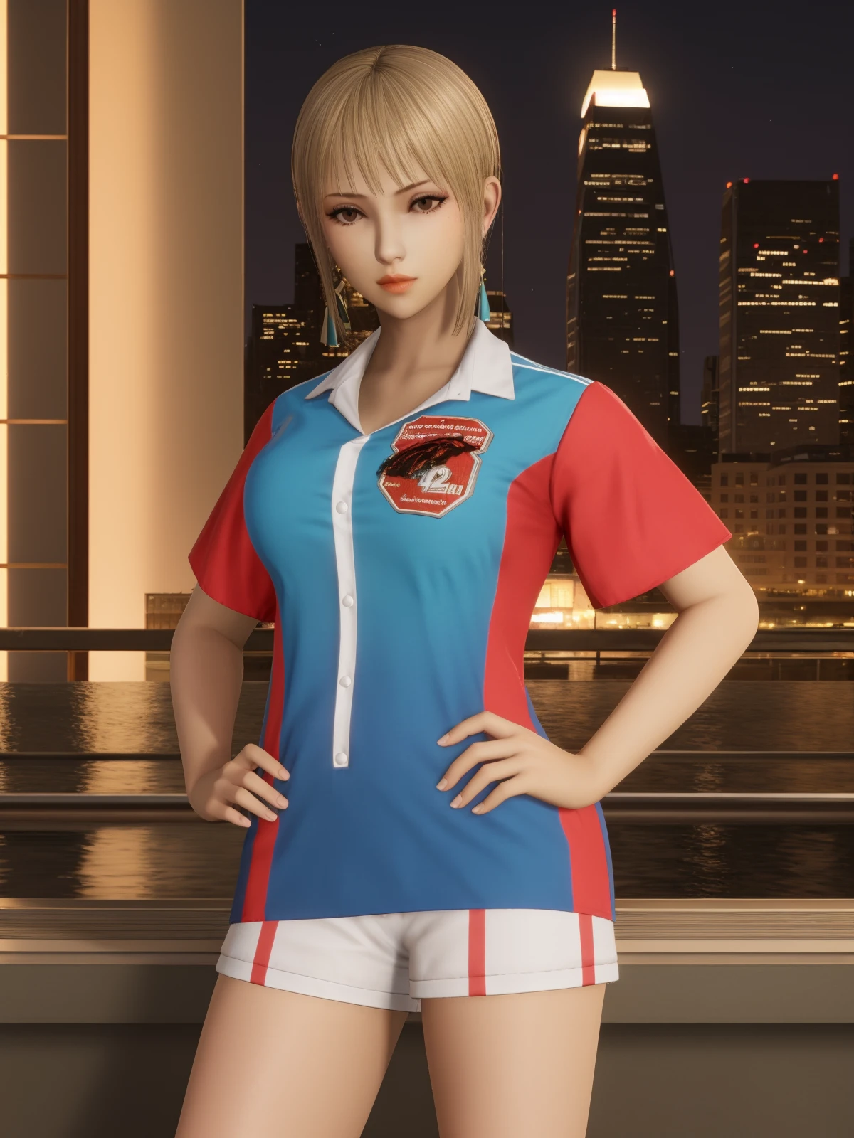 ZSGWSwangyuanjiSC, 1girl, solo, sportswear, shorts,blonde hair, shirt, brown eyes, earrings, short sleeves, lips, jewelry,soccer uniform, cityscape, night, poolside, hand on hip,