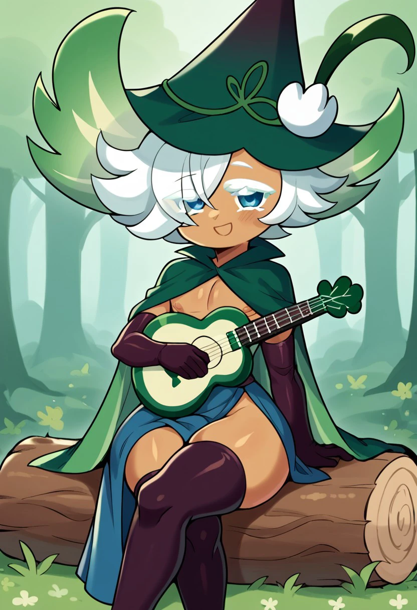 clover cookie, cookie_run_kingdom_(series), male, girly, femboy body, white hair, medium length hair, hat, tan skin, blue eyes, white eyelashes, huge ass, noseless, no nose, earless, no ears, simple face, cartoony face, big eyes,