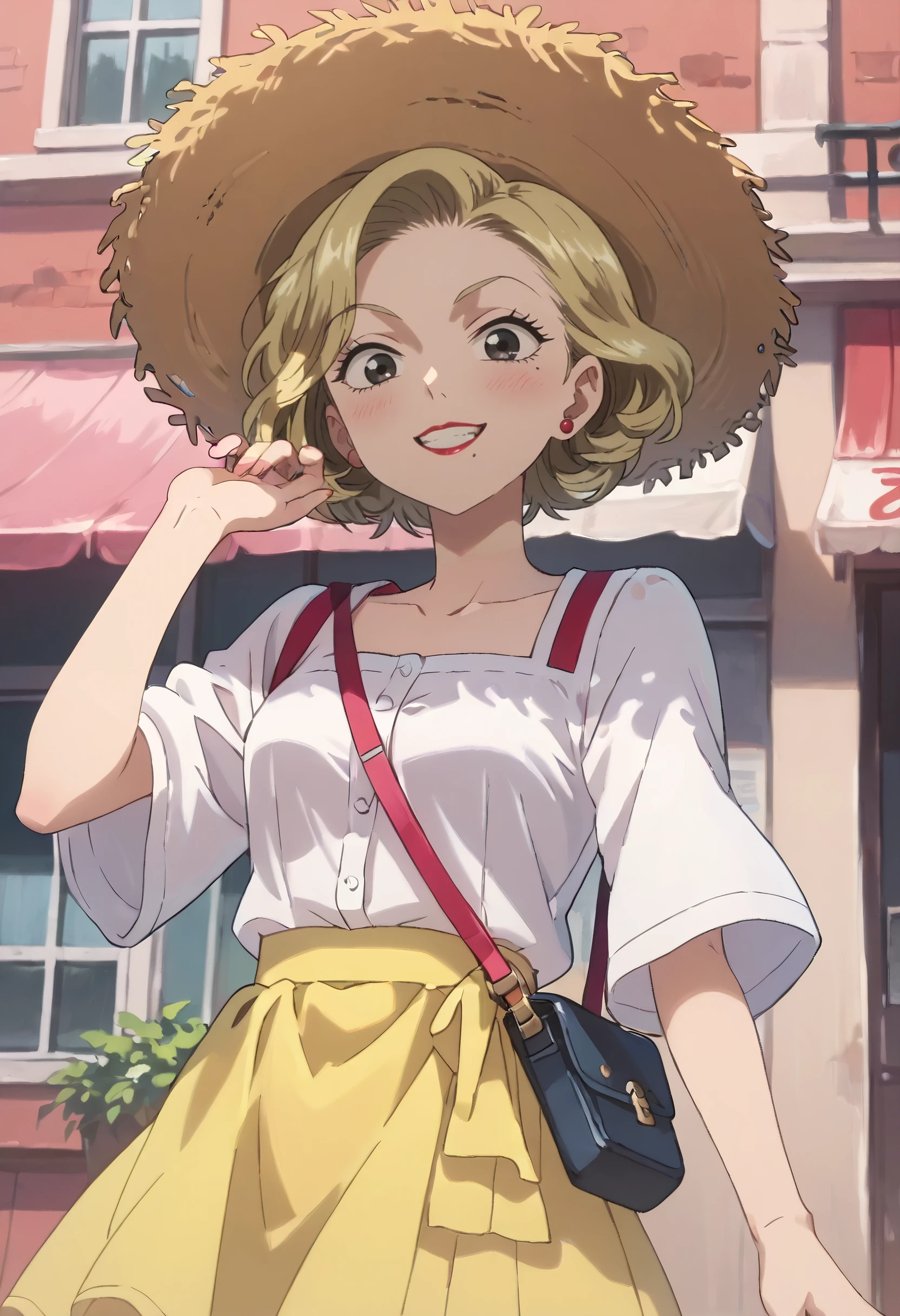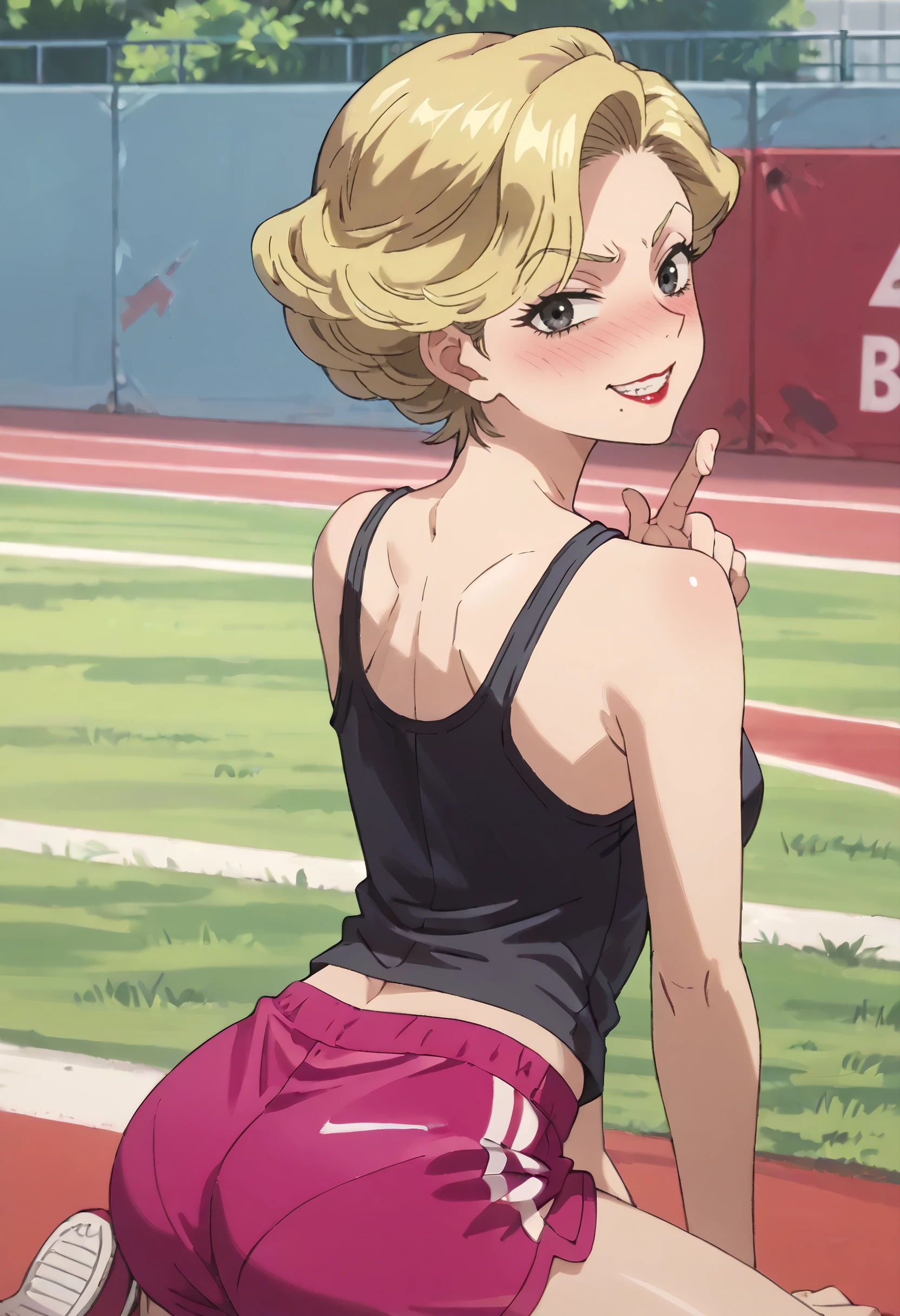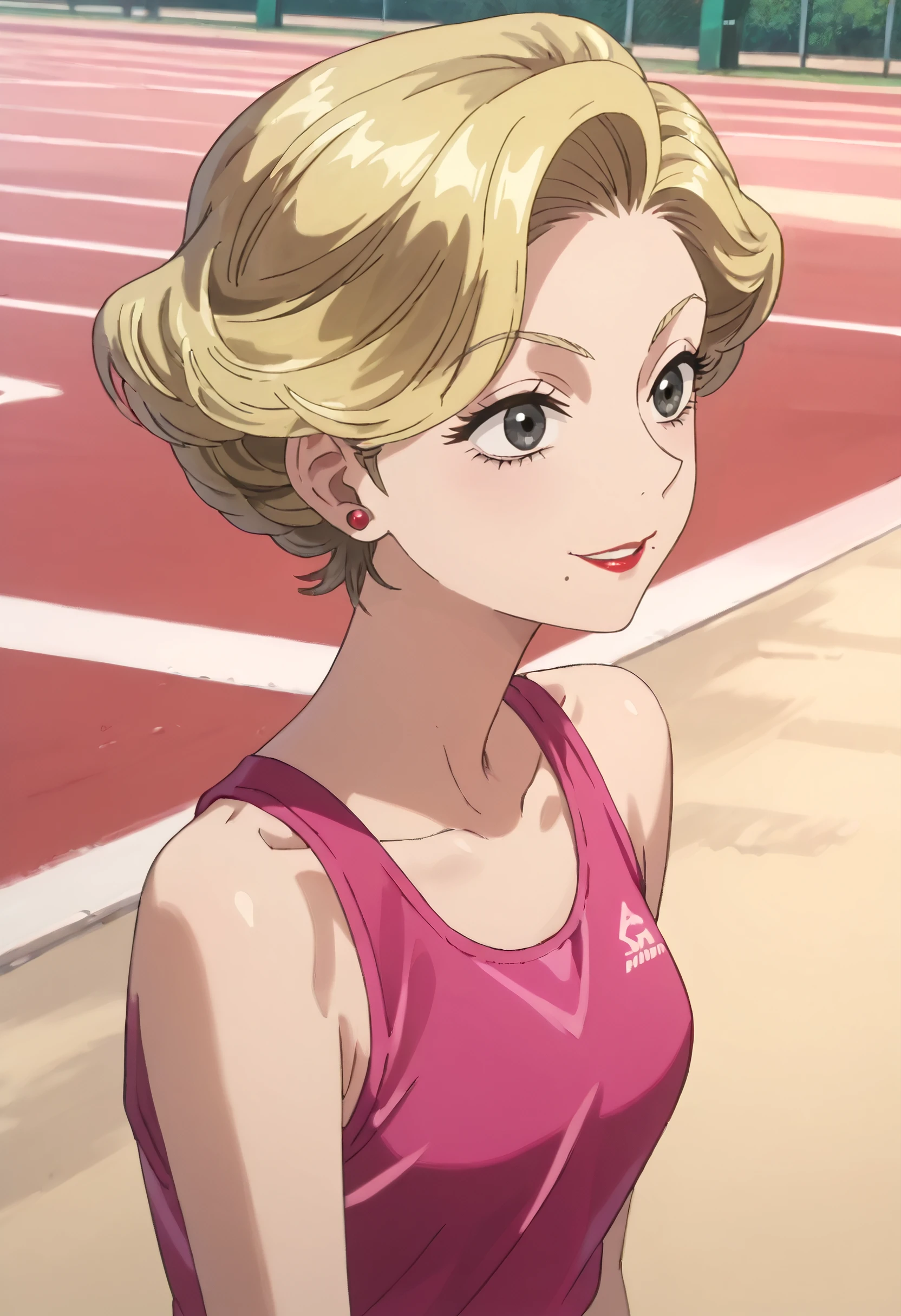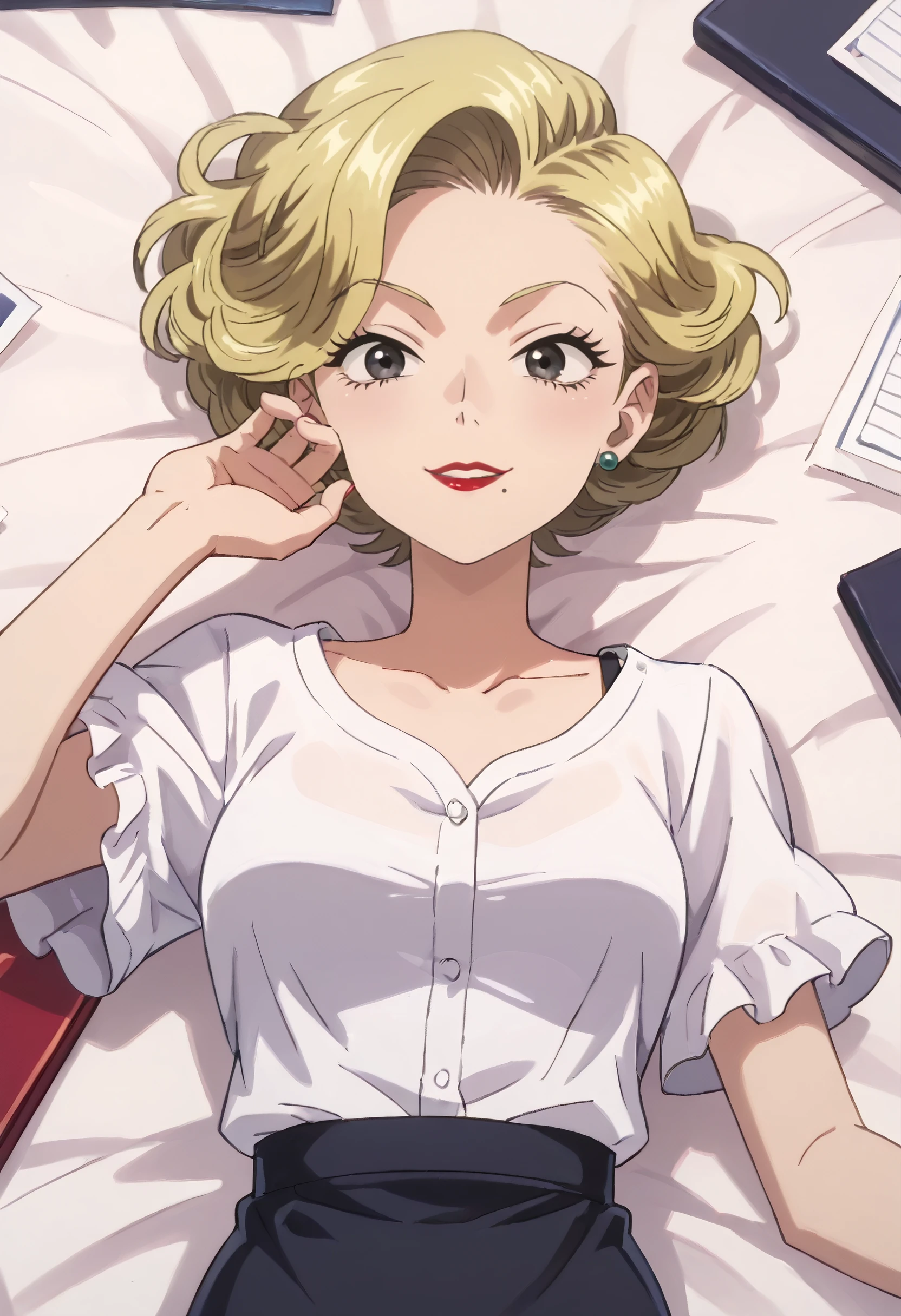 KGRRose, blonde hair, short hair, mole under mouth, mole, black eyes, lipstick, makeup, red lips,