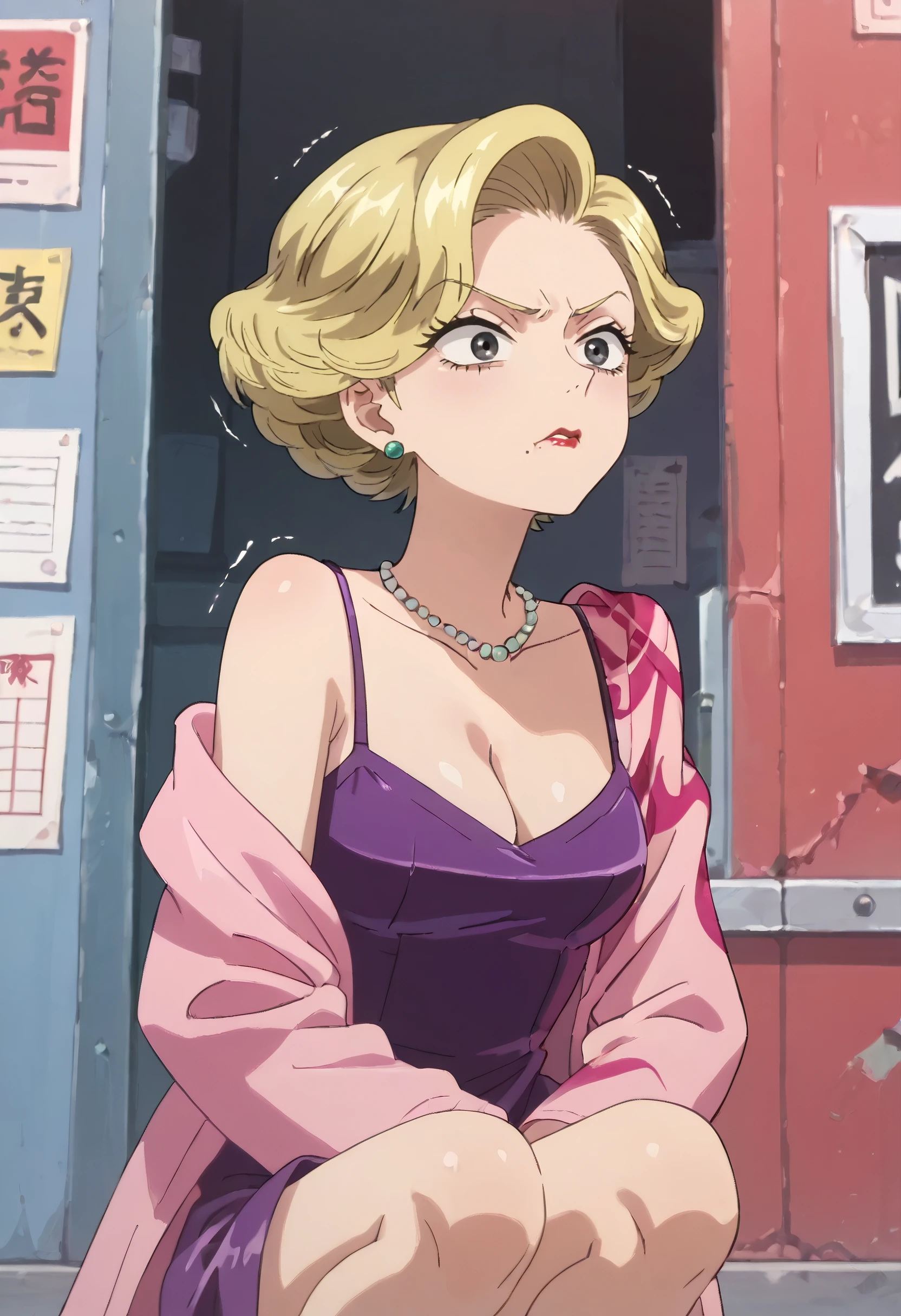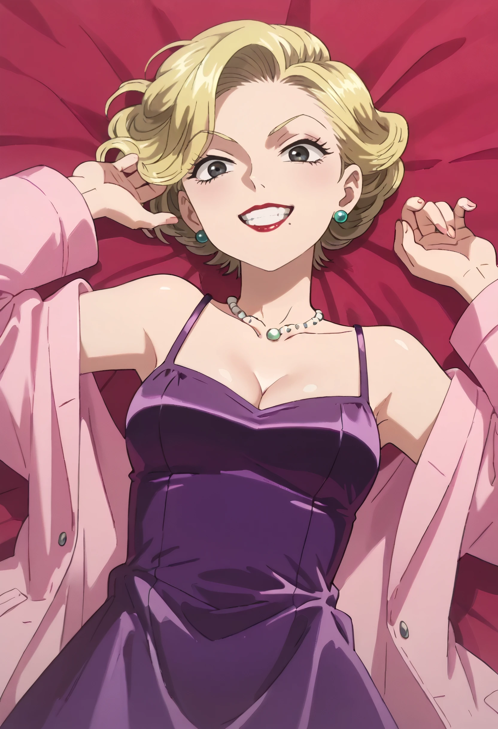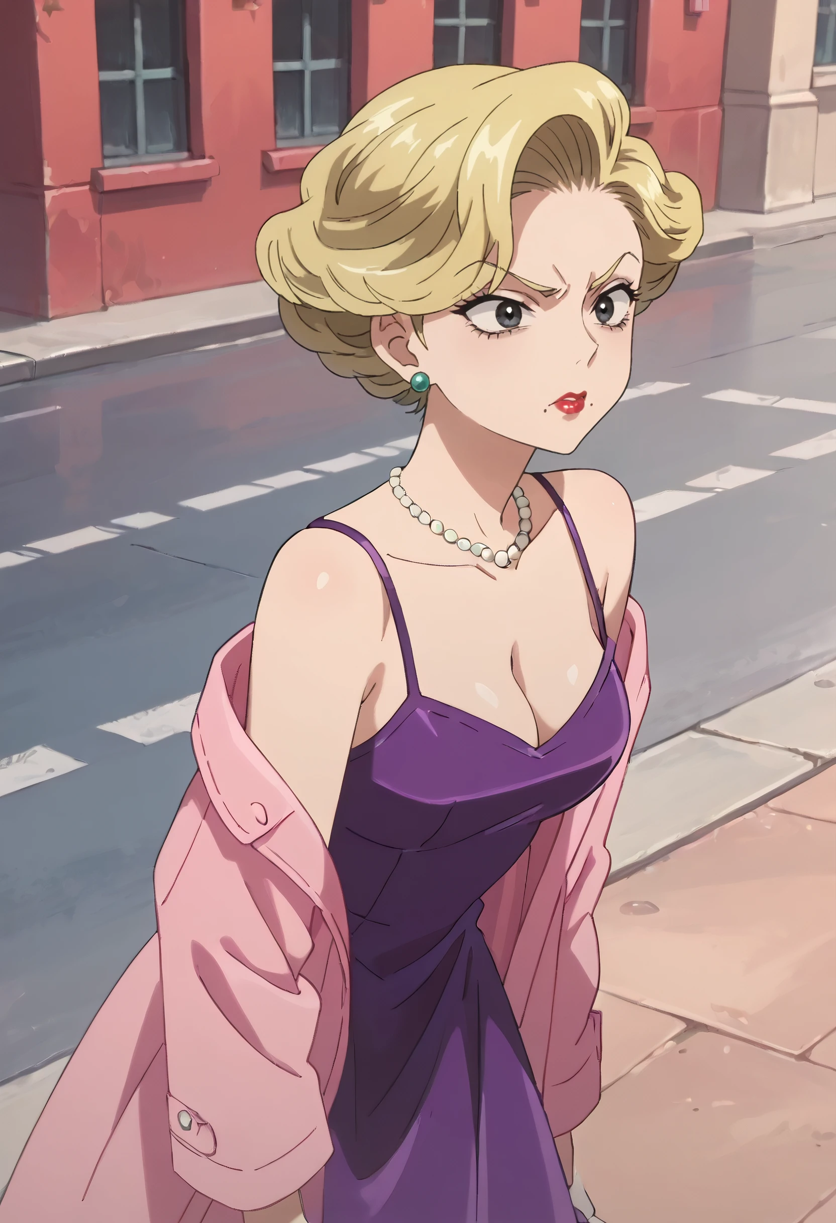 RoseOutfit, jewelry, earrings, necklace, cleavage, dress, off shoulder, long sleeves, purple dress, spaghetti strap, sleeveless dress, pink coat, pearl necklace, loose shirt,
