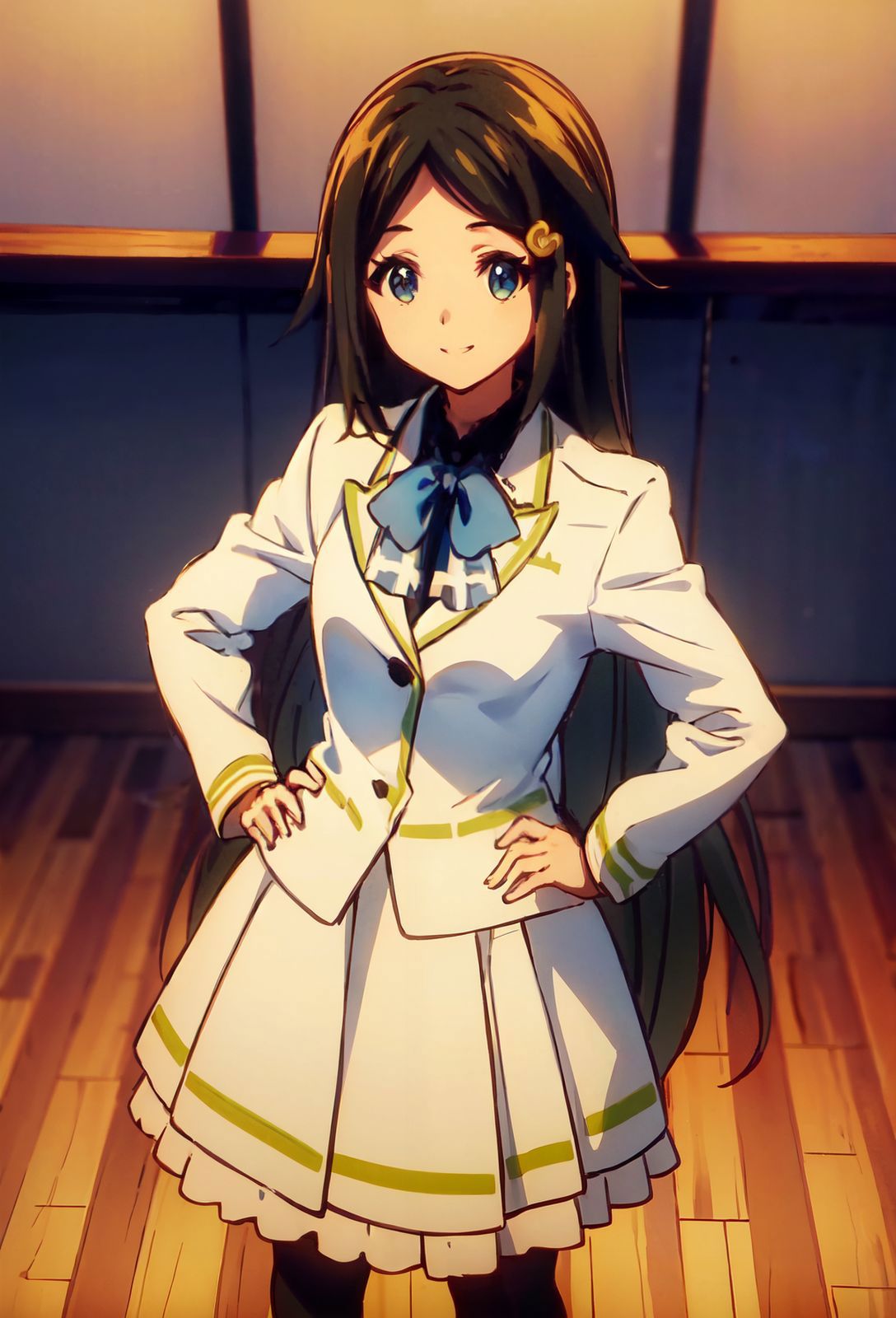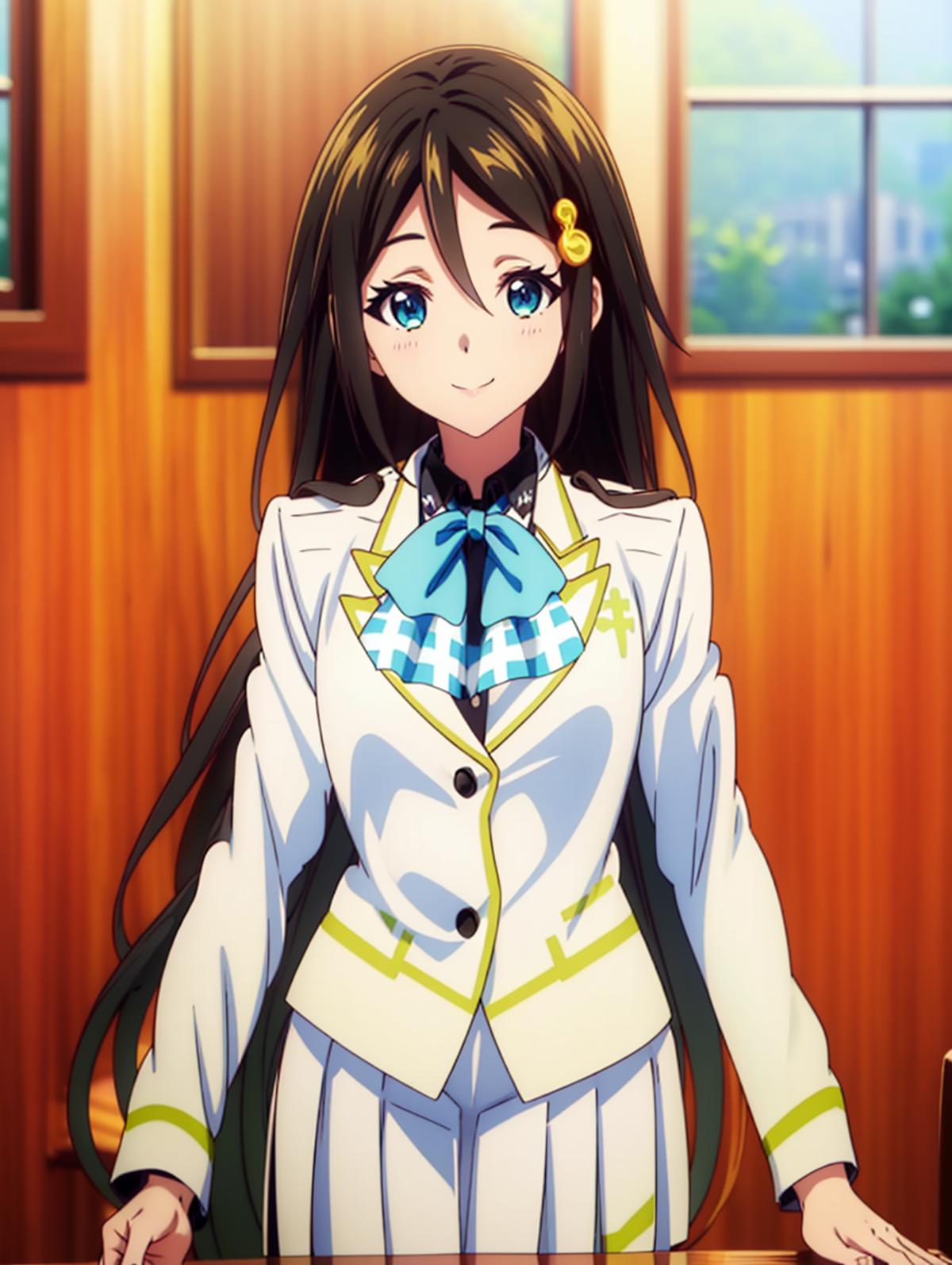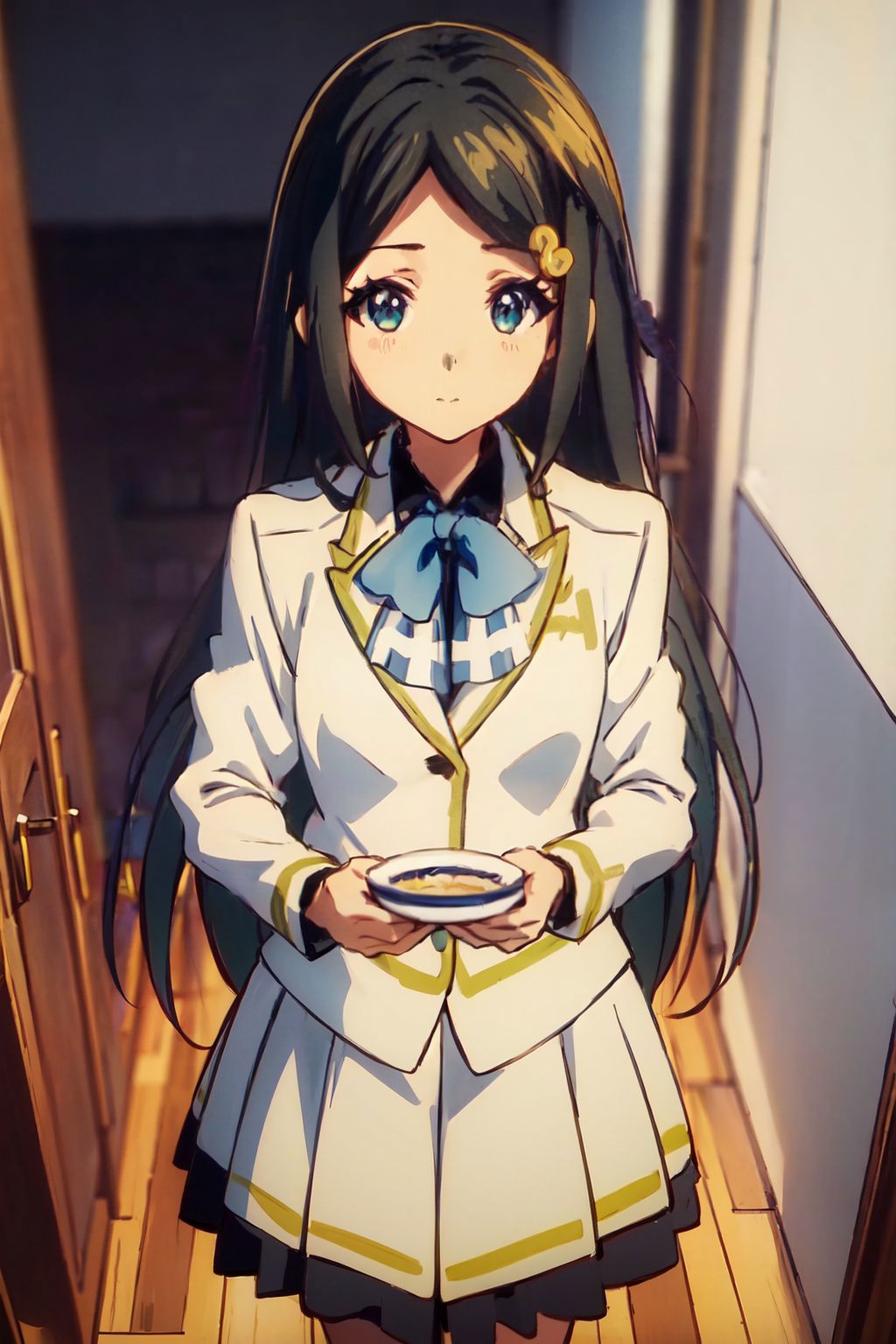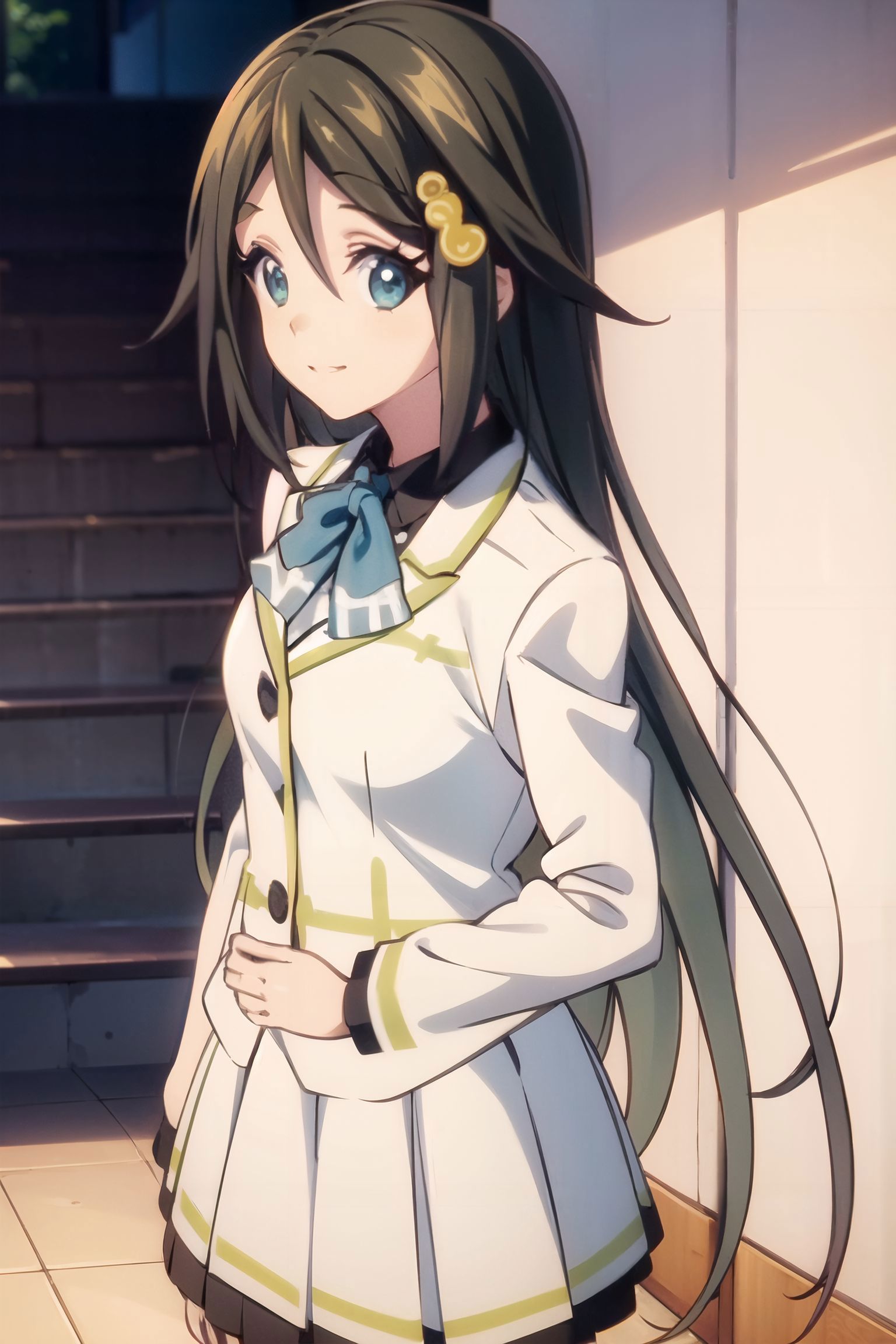 Prompt : reina, 1girl, long hair, black hair, blue eyes, hair ornament, hair clip, solo, white school uniform, skirt,