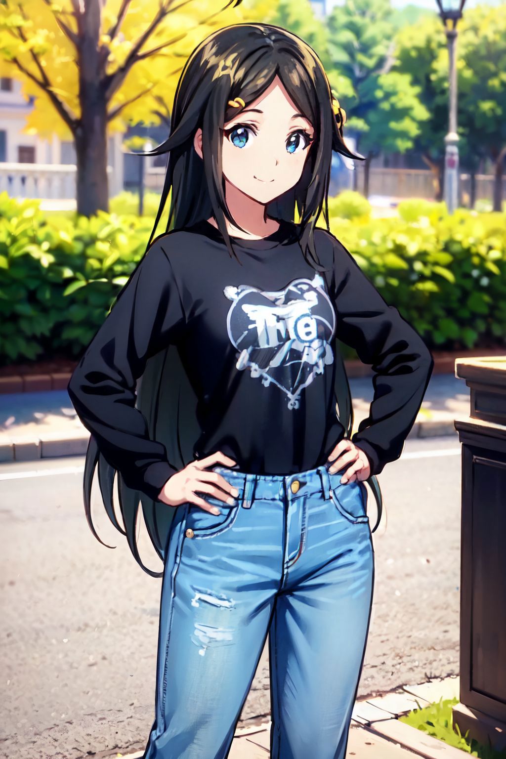 prompt : reina, 1girl, long hair, black hair, blue eyes, hair ornament, hair clip, solo,