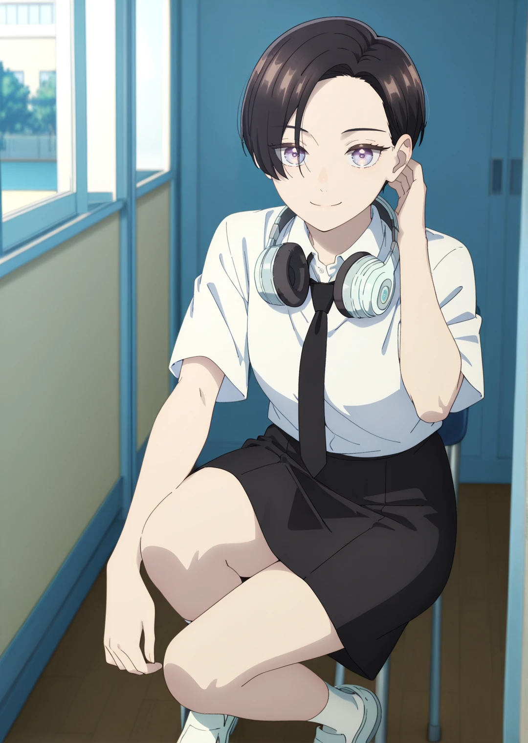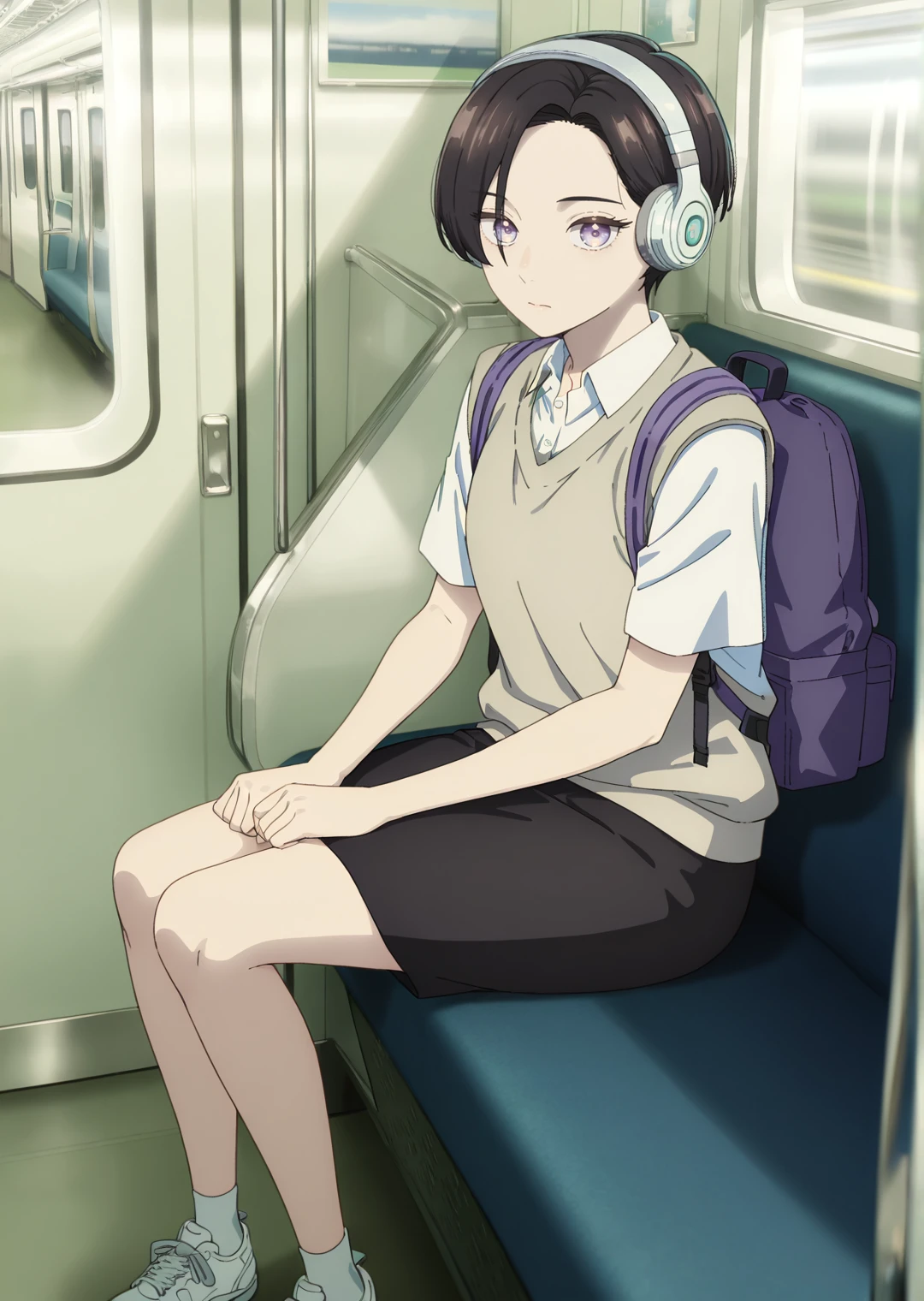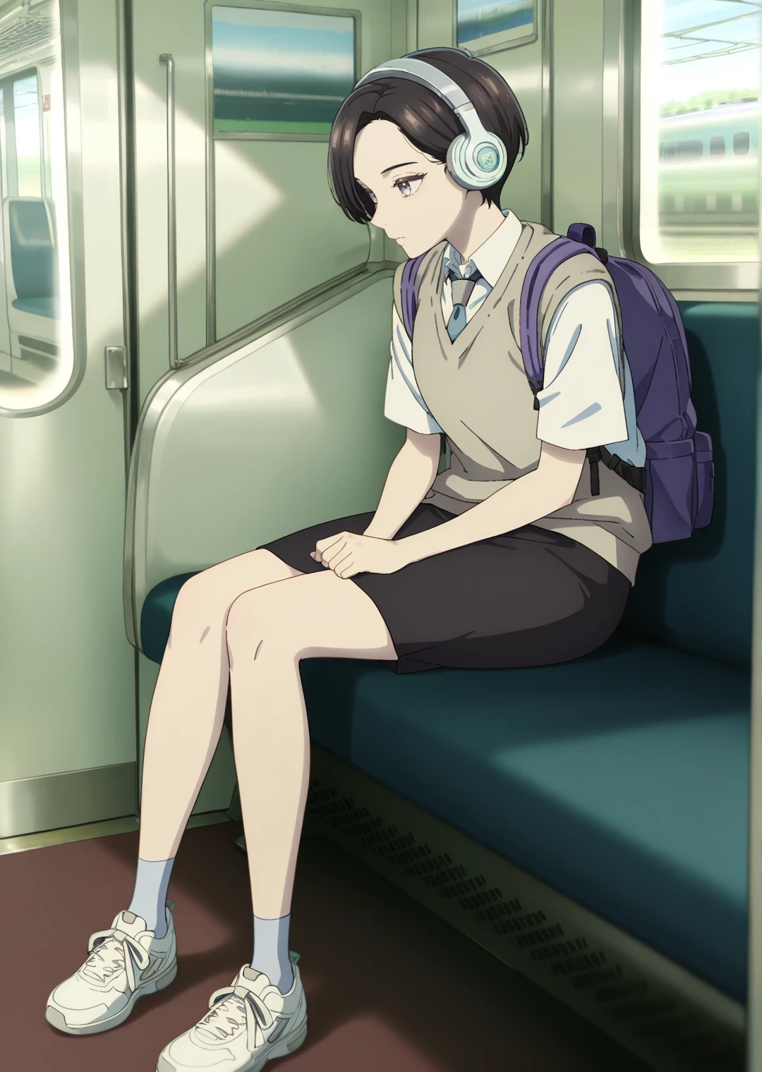 headphones, backpack, sweater vest, pencil skirt, white footwear, socks, sneakers, white shirt, school uniform, black skirt, collared shirt