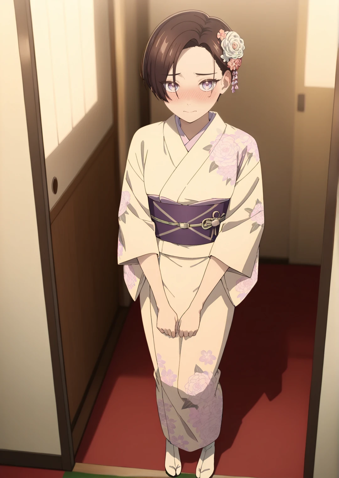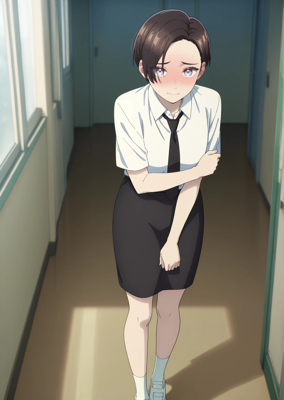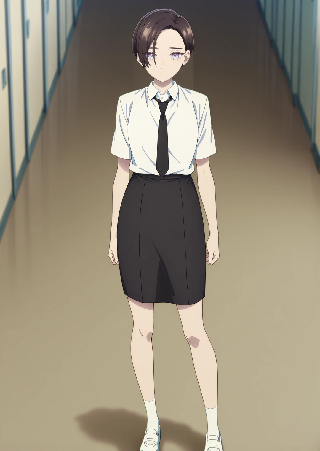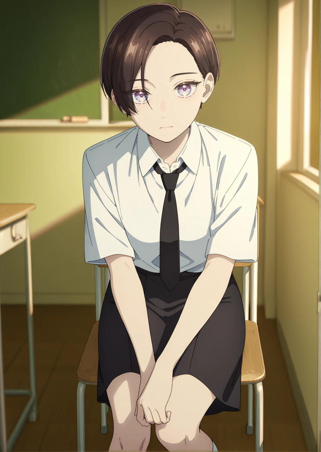 YoiTakiguchi, 1girl, solo, purple eyes, short hair, brown hair,