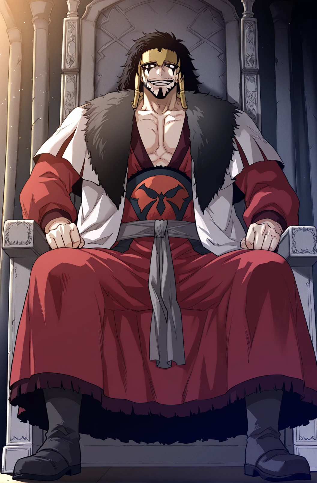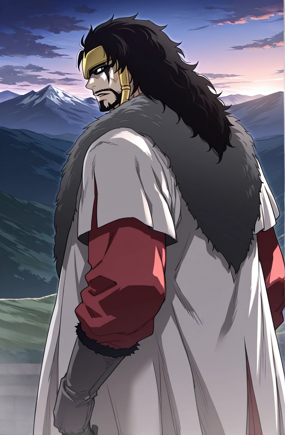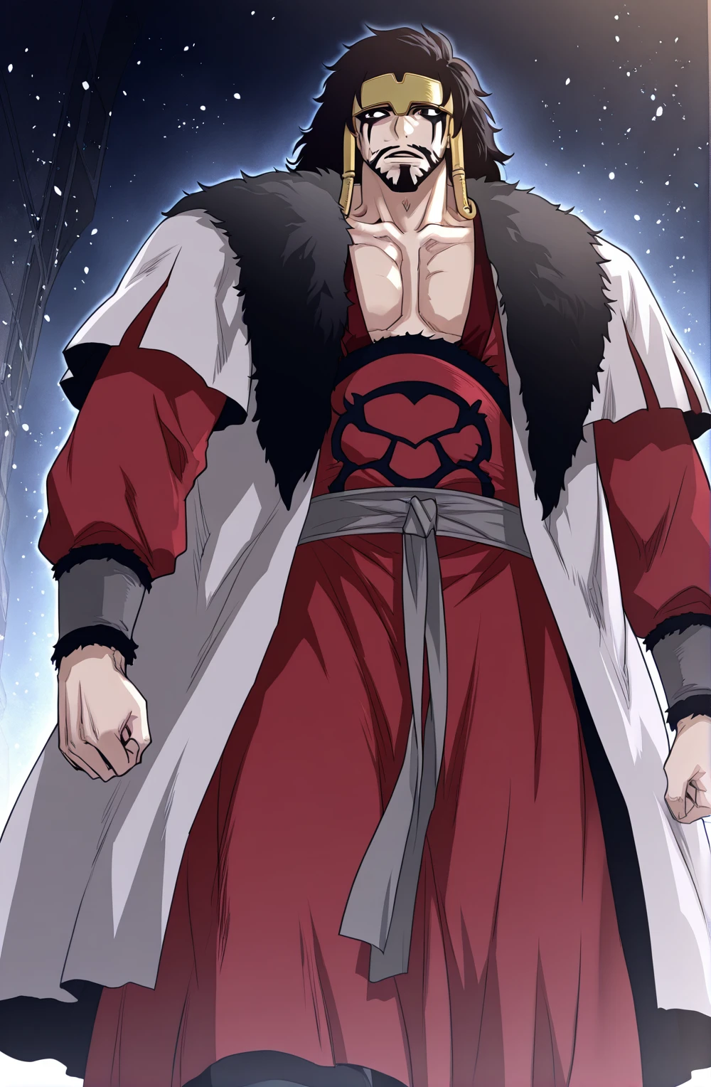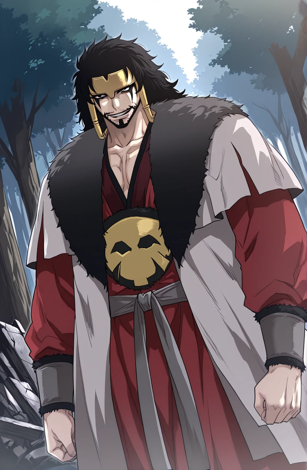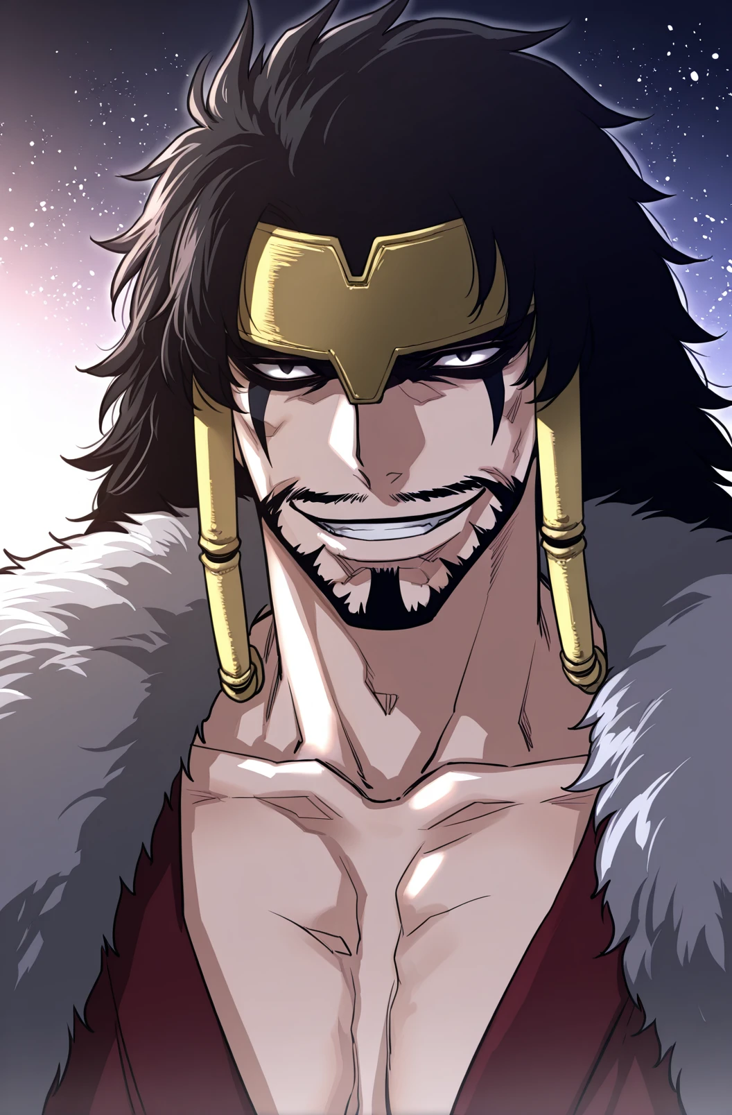 northwind, 1boy, solo, messy black hair, beard, golden headpiece, black face markings, black eyes,