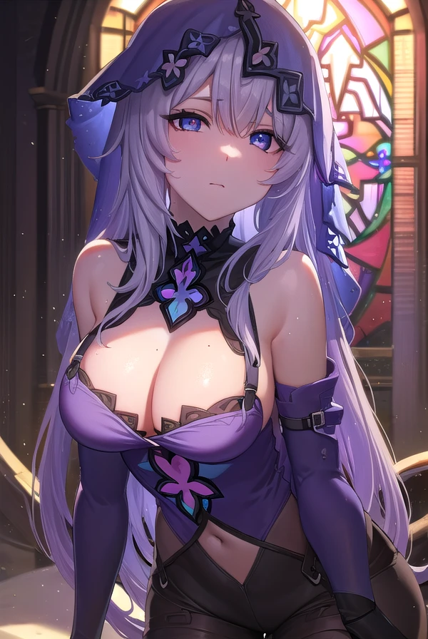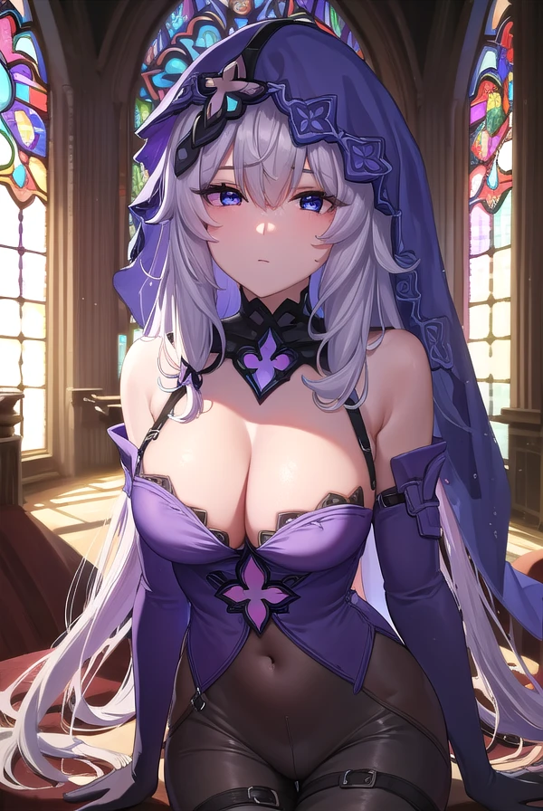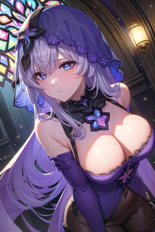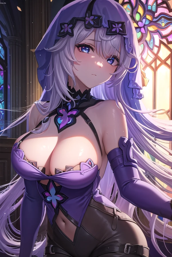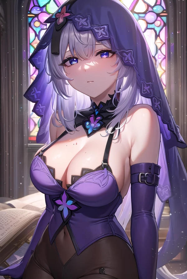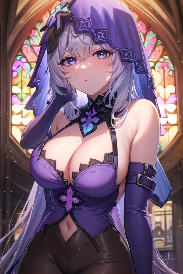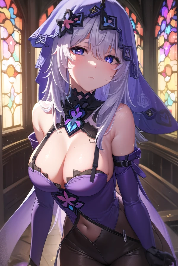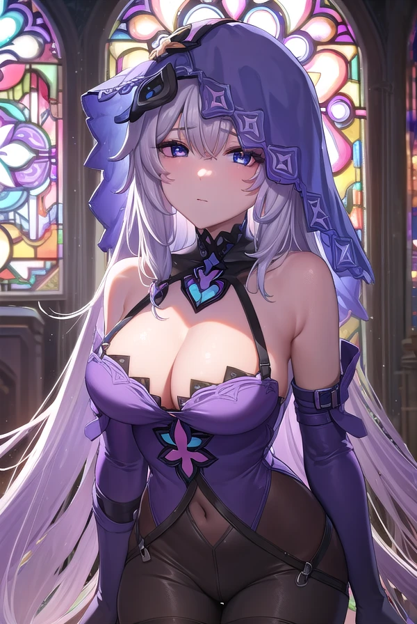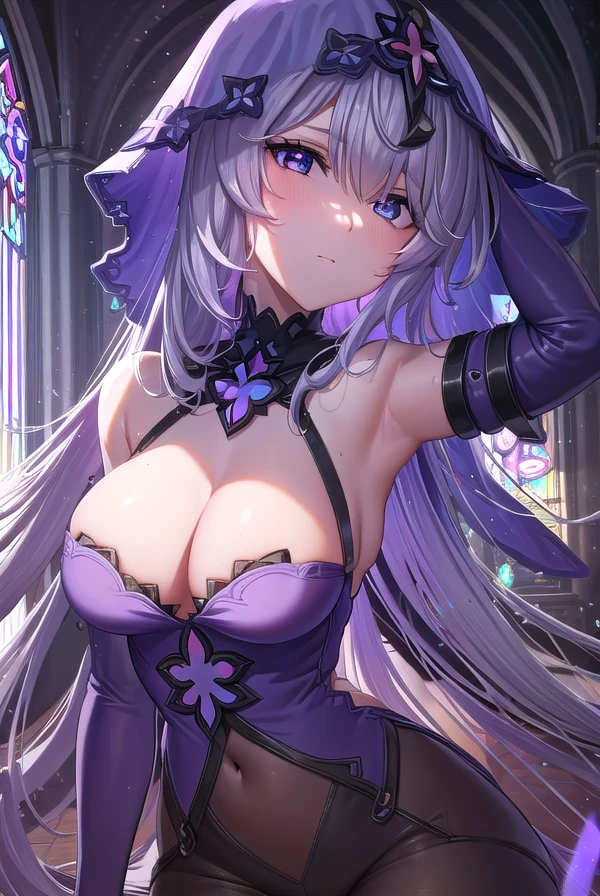 arm belt, bare shoulders, cleavage, covered navel, dress, elbow gloves, gloves, purple dress, sleeveless, sleeveless dress, veil,