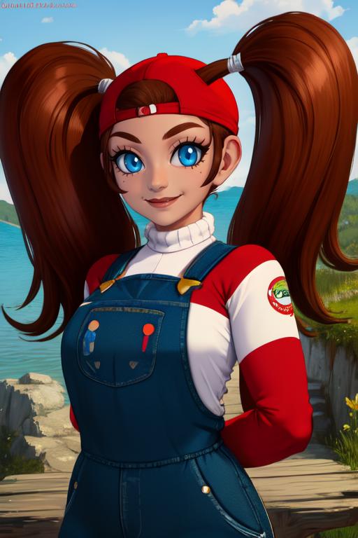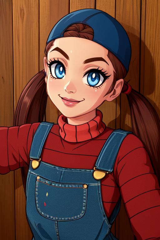 denim overalls, red striped sweater, sleeves past wrists , backwards hat,