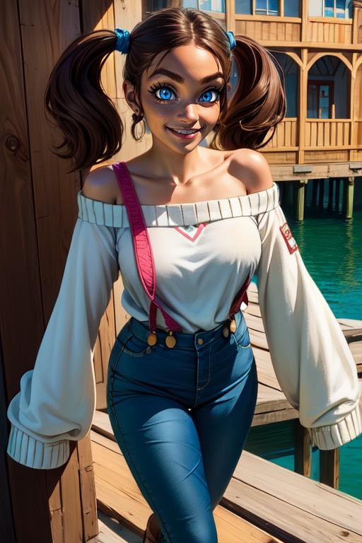 shorty, blue eyes, high twin tails, bangs, brown hair,