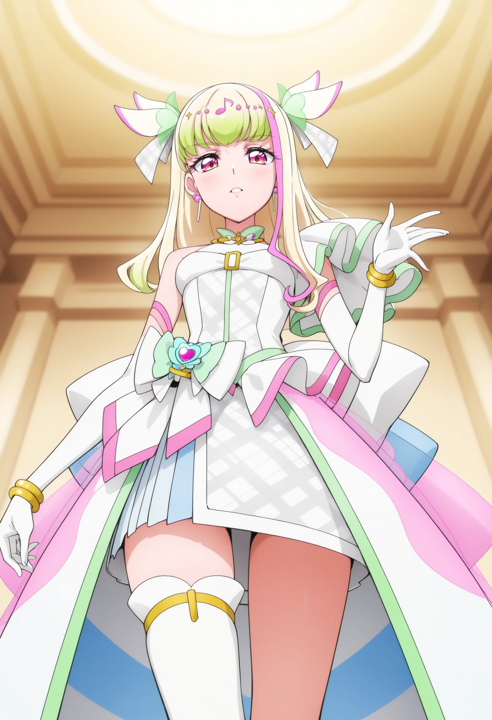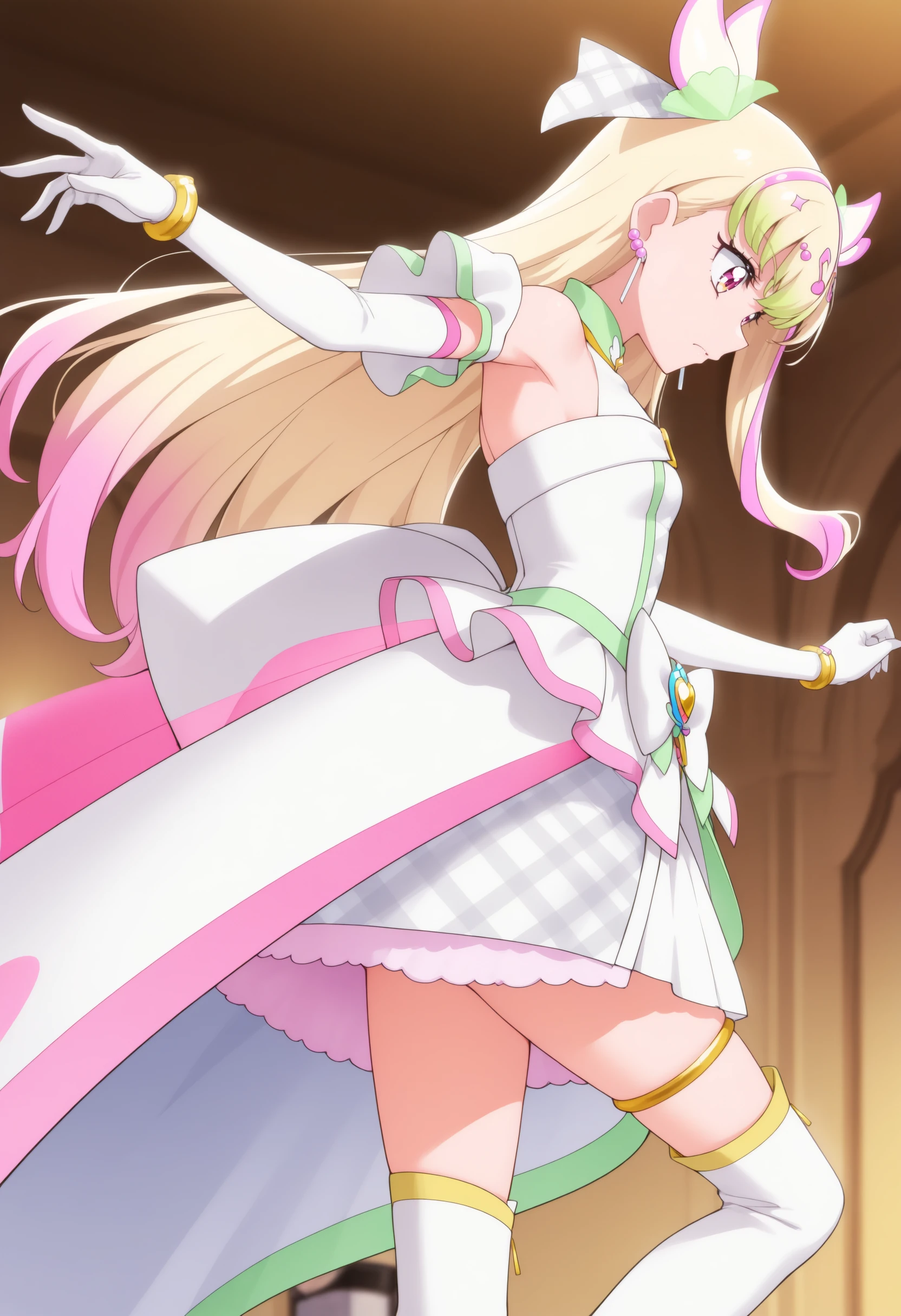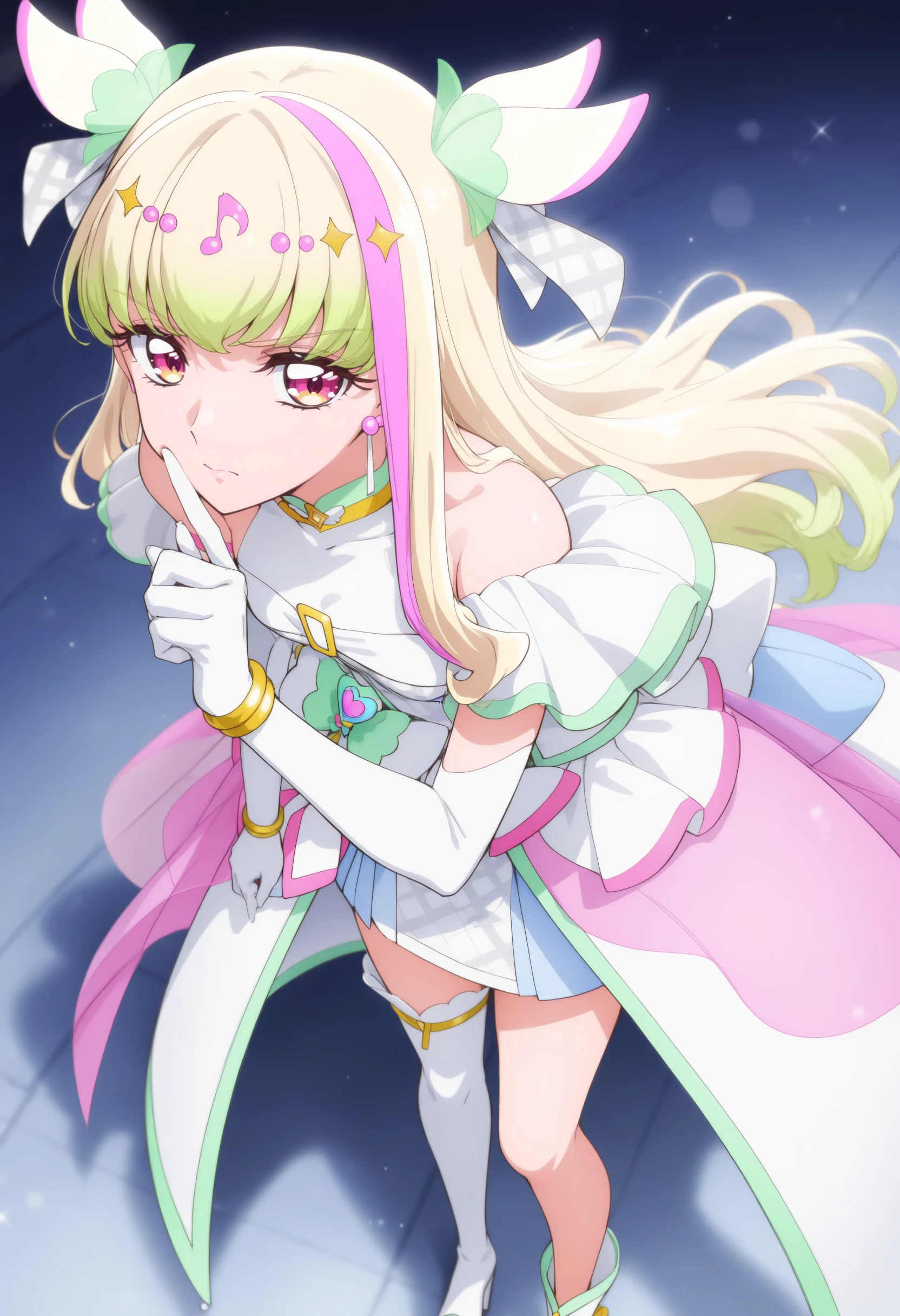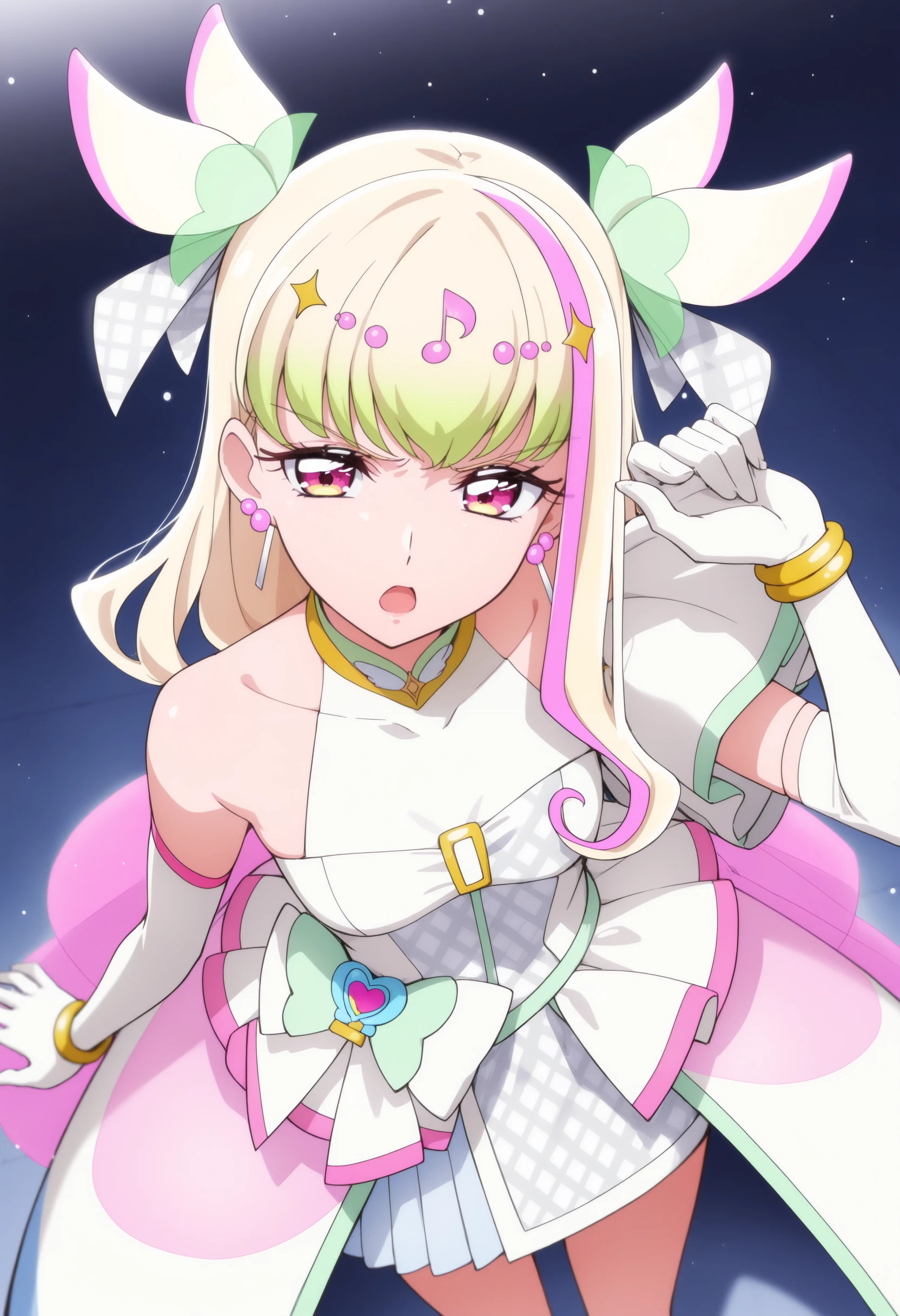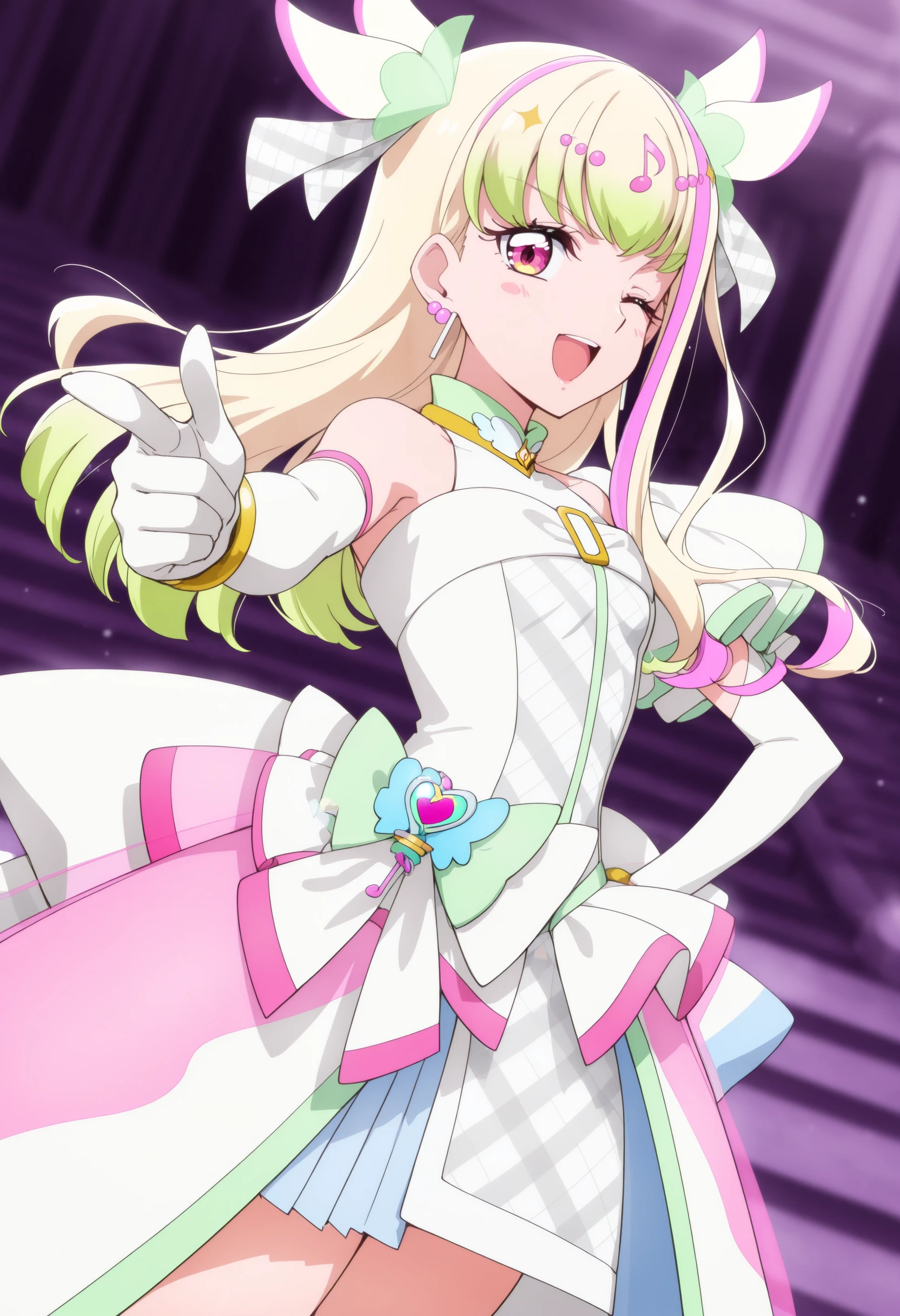 If it is not stable, you can use long hair, green hair, blonde hair, pink hair, streaked hair, two side up, multicolored hair, gradient hair, pink eyes,small breasts,idol clothes, magical girl, white dress, sleeveless dress, bare shoulders, asymmetrical clothes, multicolored dress, plaid,hair ornament, earrings, white bow, jewelry, musical note white bow, jewelry, musical note hair ornament,white gloves, elbow gloves, bracelet