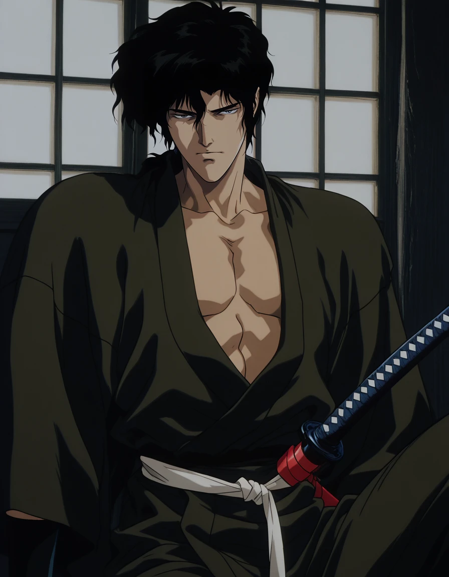 mai_juun,mai_juubeeju,black_hair,japanese_clothes,kimono,katana,,pectorals