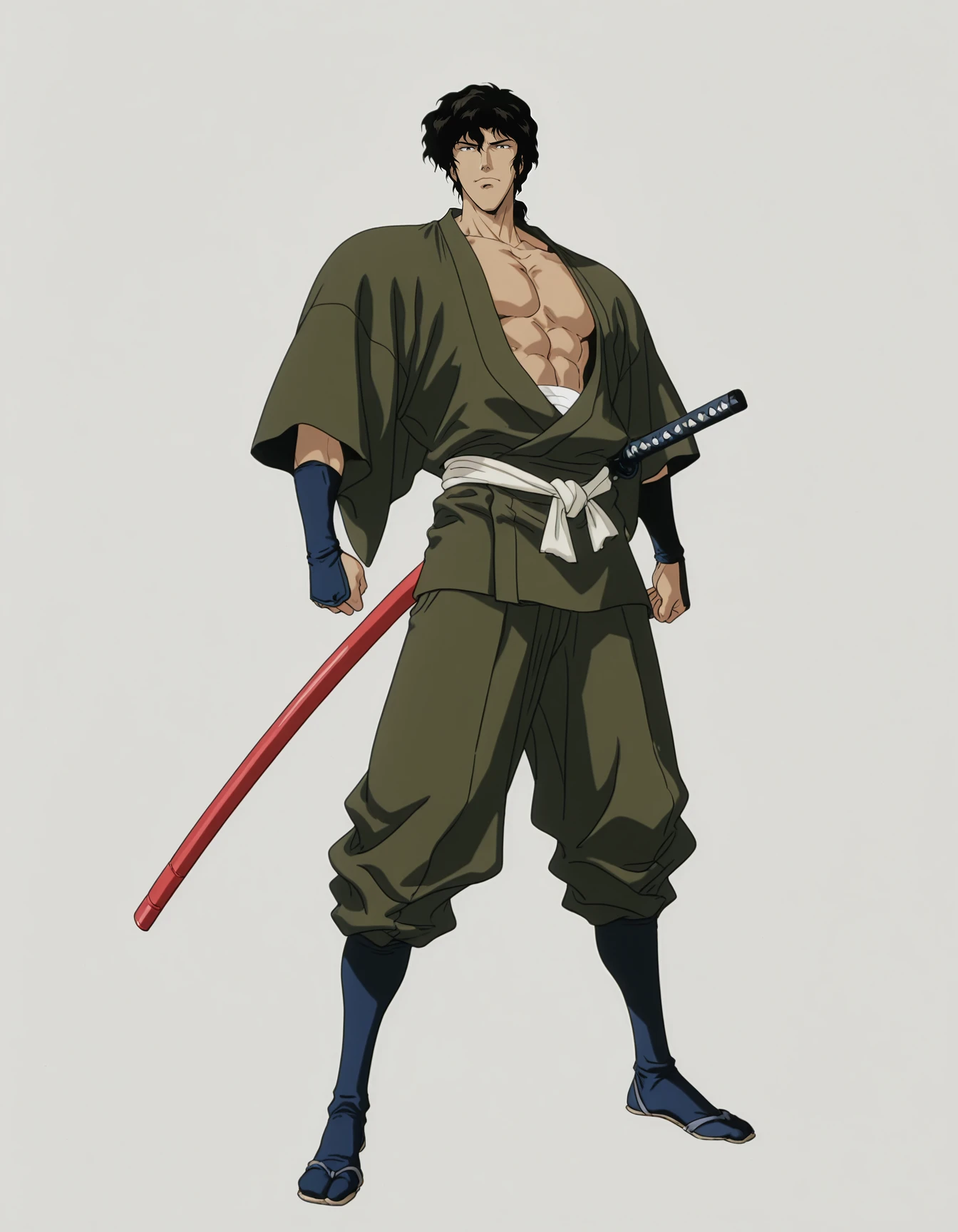 mai_juun,mai_juubeeju,black_hair,japanese_clothes,kimono,katana,sheath,pectorals