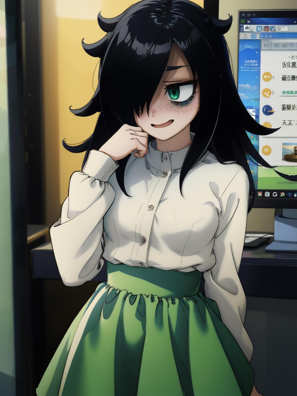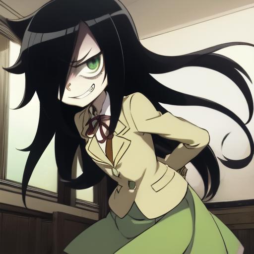 I suggest you use those prompts to make the character more recognizable: kuroki-tomoko, hair over one eye, green eyes, long hair, bags under eyes