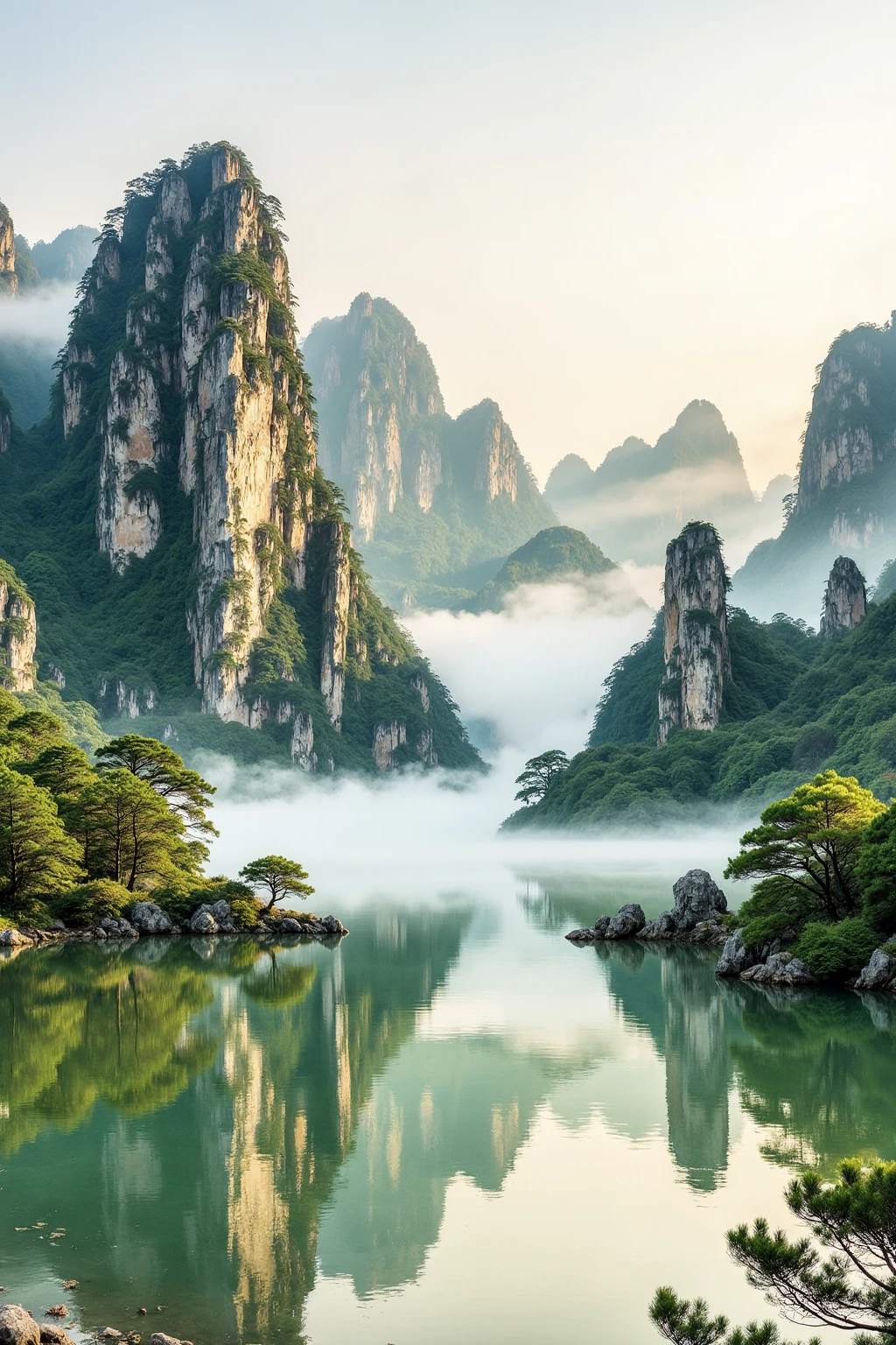 Chinese landscape painting style, peculiar peak shapes, lakes reflecting sky, pine shadows on water, twilight glow, serene beauty.