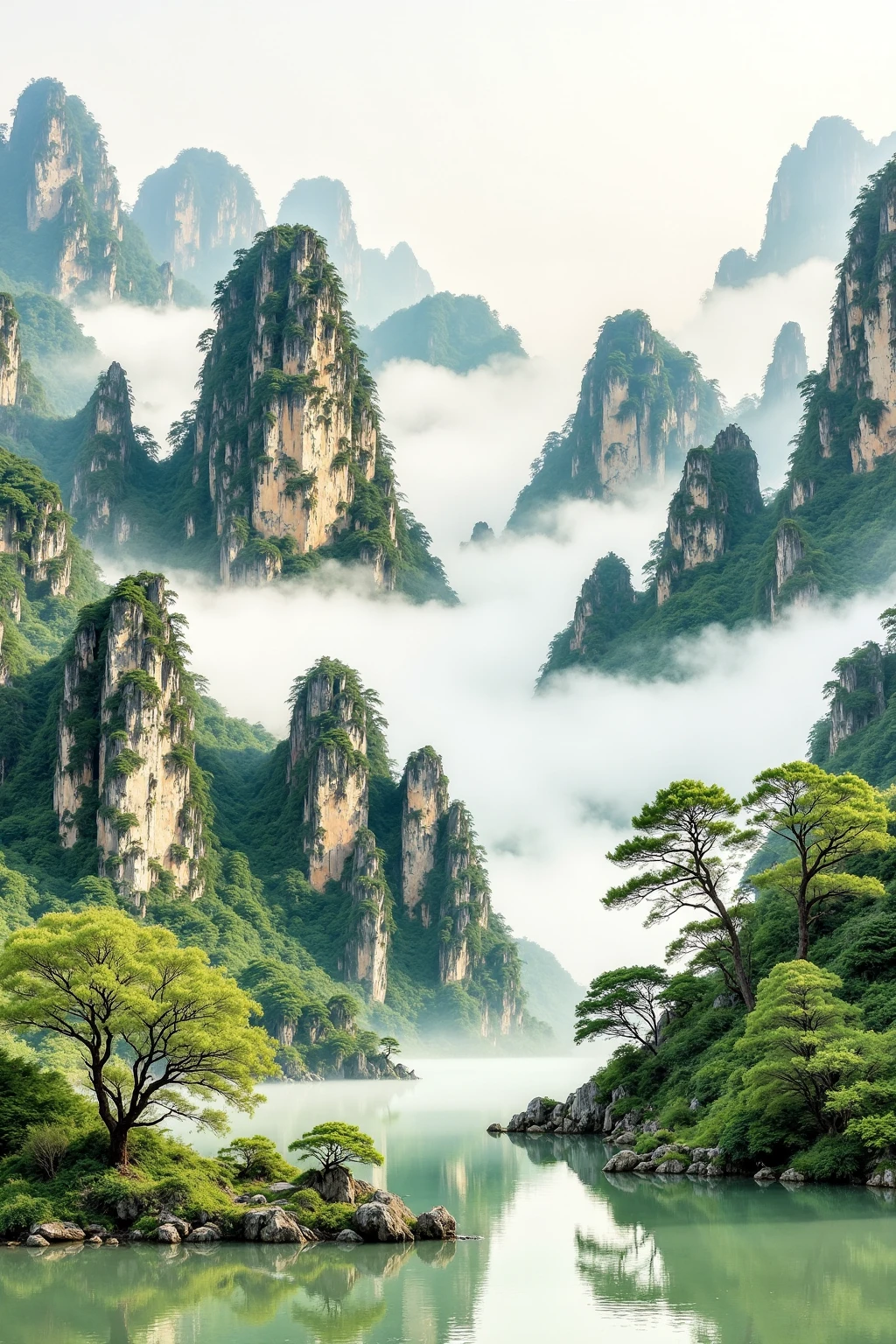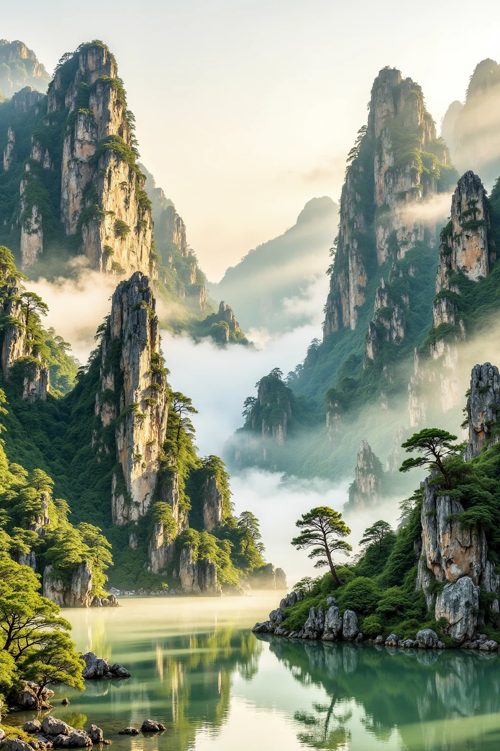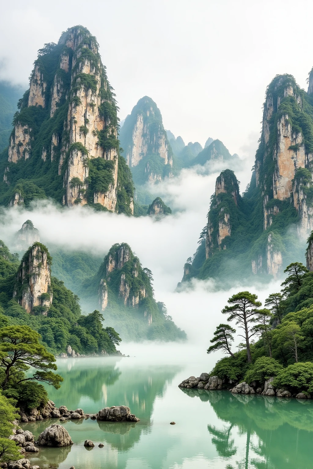 Chinese landscape painting style, mist - wrapped peaks, emerald lakes, ancient pines leaning, clouds drifting like silk, natural harmony.