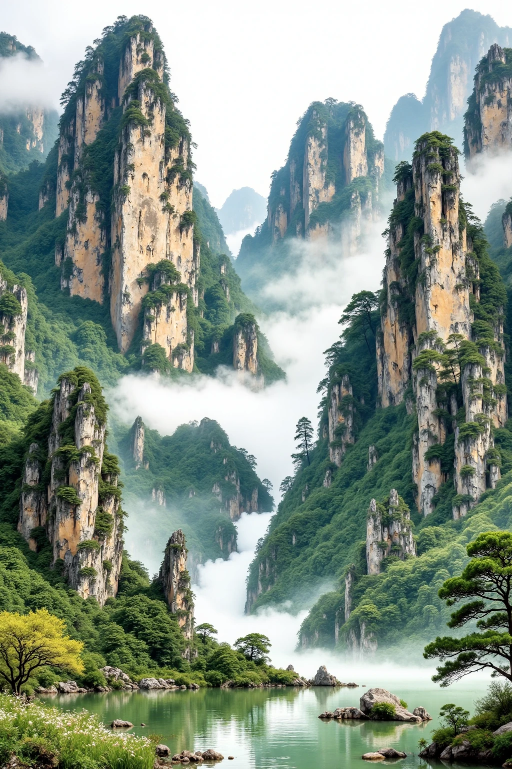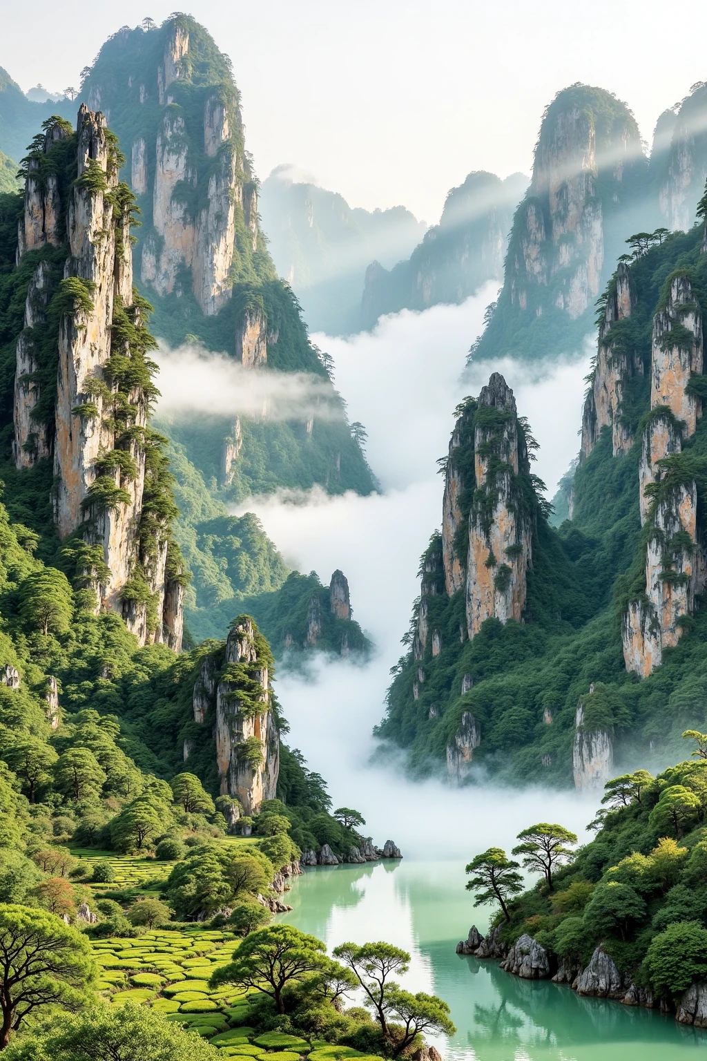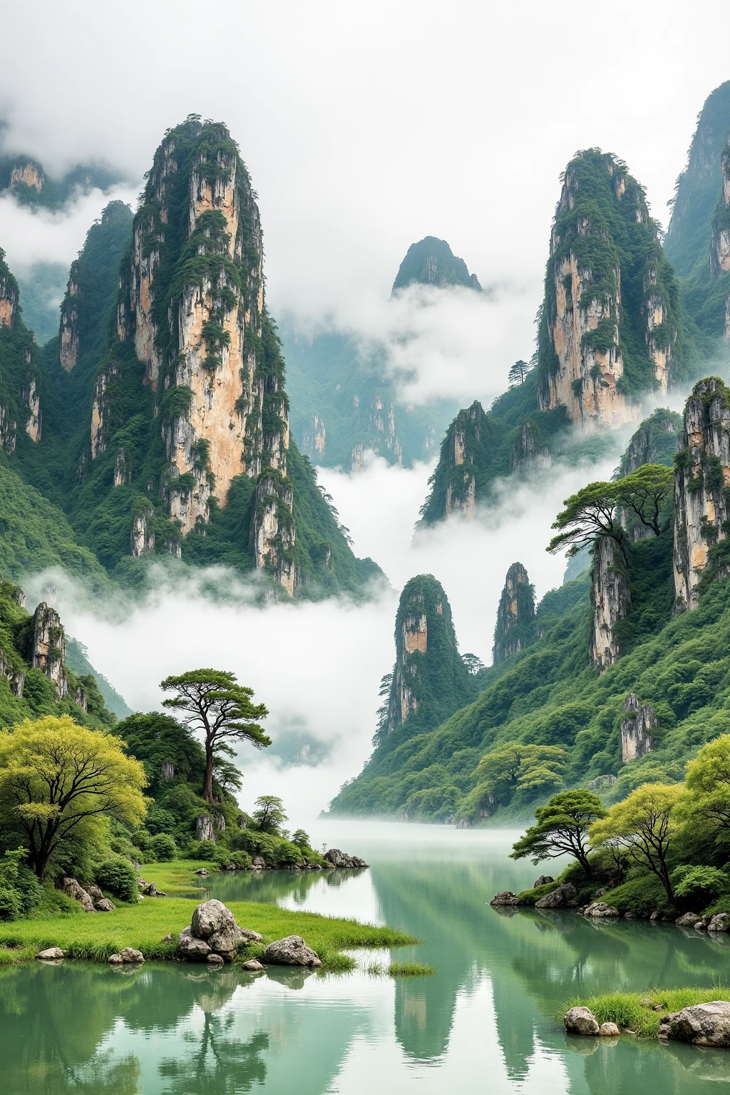 Chinese landscape painting style, mist - wrapped peaks, emerald lakes, ancient pines leaning, clouds drifting like silk, natural harmony.
