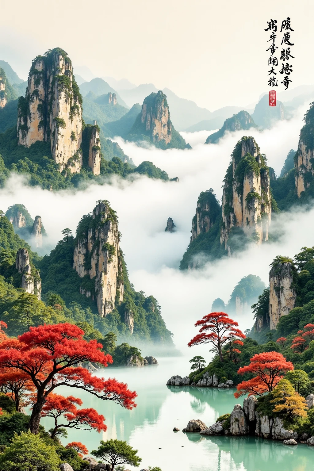 Chinese landscape painting style, continuous mountains in clouds, clear rivers flowing, maple trees red in autumn, rich colors.