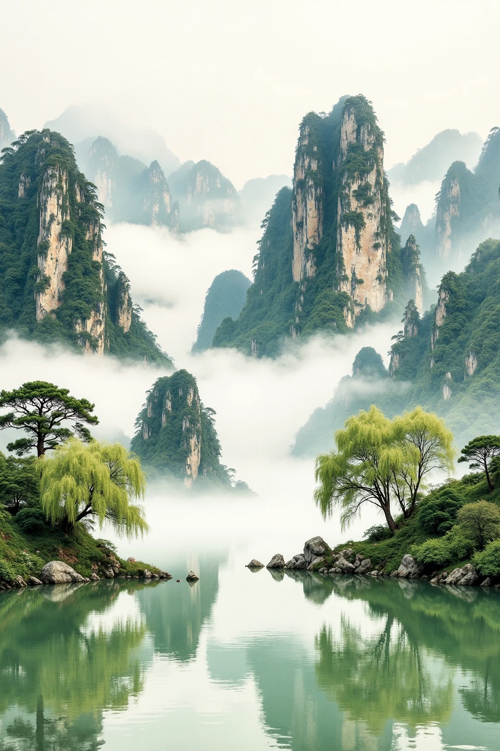 Chinese landscape painting style, layered peaks in fog, mirror - like ponds, willow trees by shore, gentle breeze, poetic atmosphere.