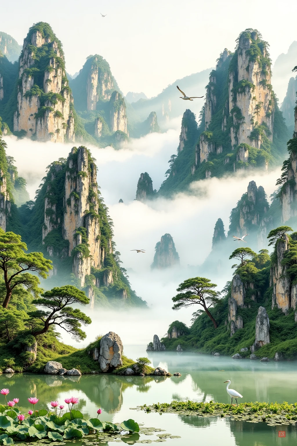 Chinese landscape painting style, fairy - like peaks, lotus ponds in valleys, egrets flying, summer charm, peaceful scene.