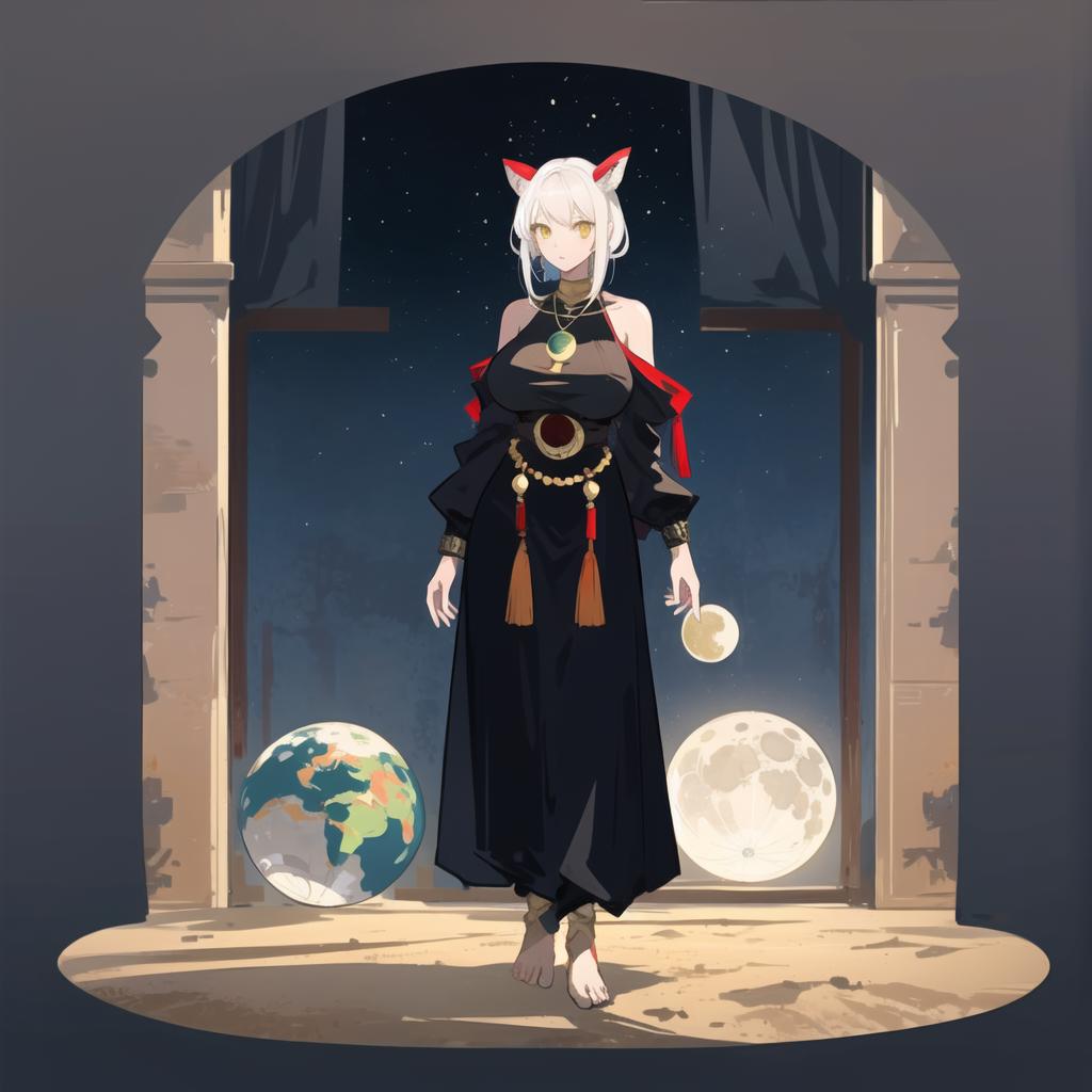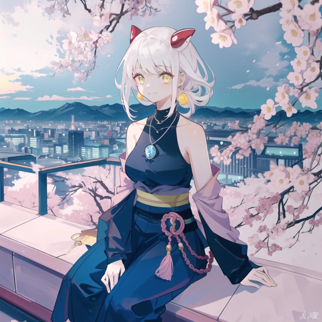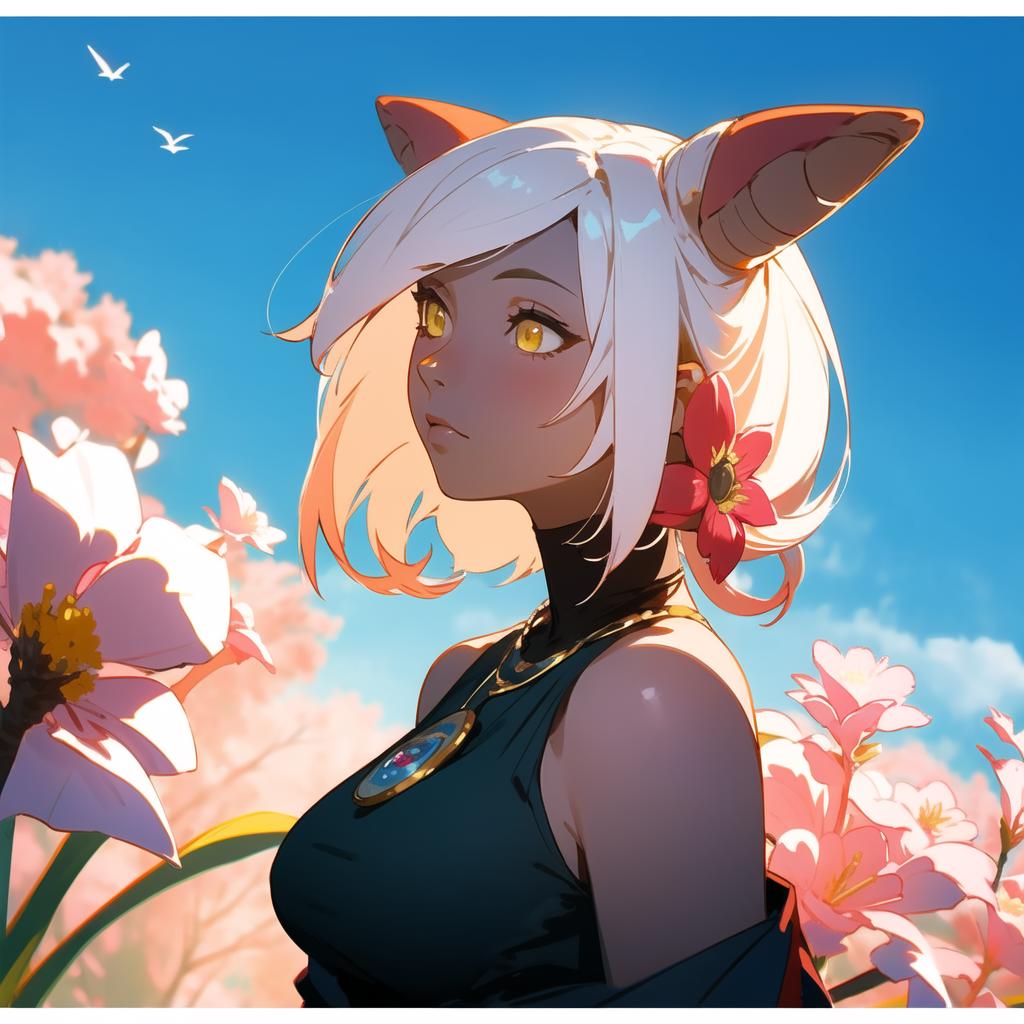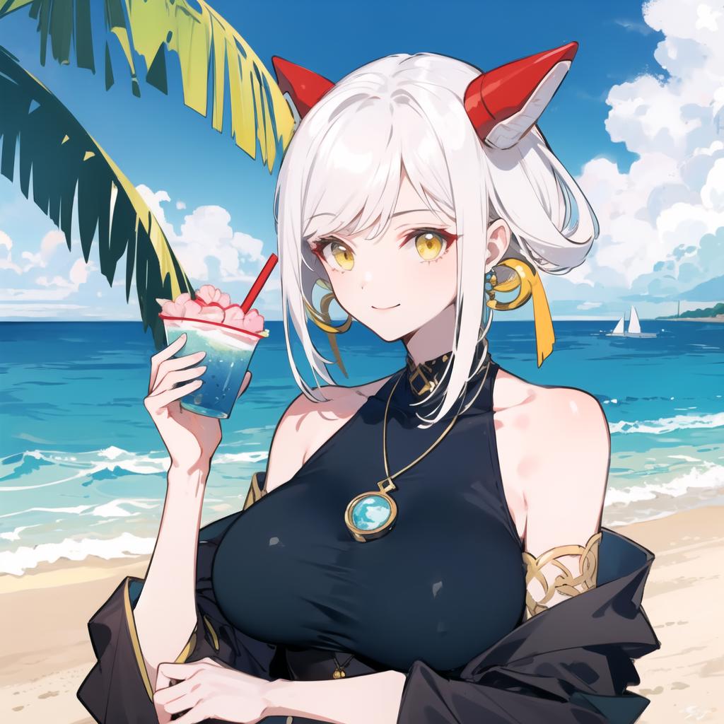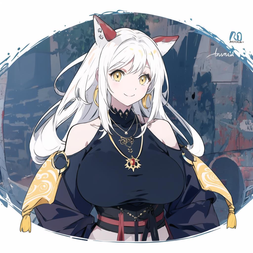 Example Prompt: 1girl, solo, large breasts, bare shoulders, jewelry, white hair, yellow eyes, clothing cutout, necklace, (animal ears|red horn:0.85)