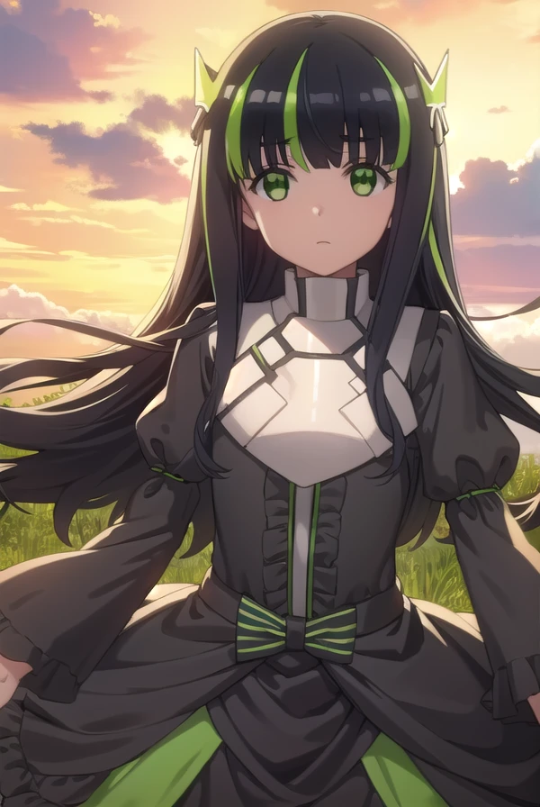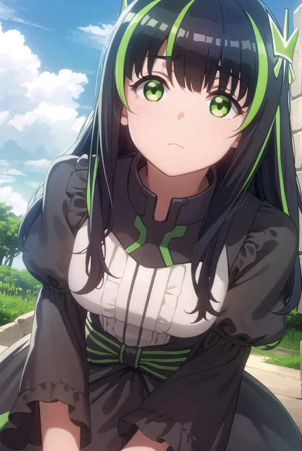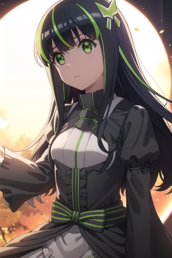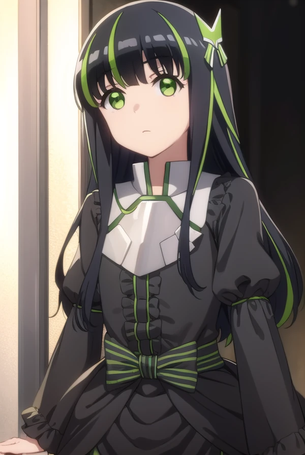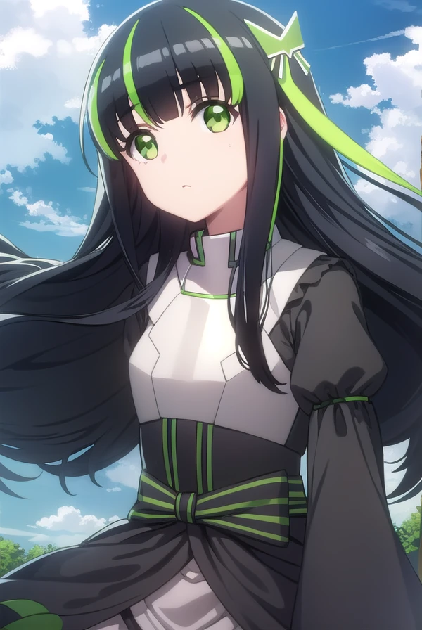 may, long hair, bangs, black hair, hair ornament, bow, (green eyes:1.5), multicolored hair, green hair, two-tone hair, streaked hair,