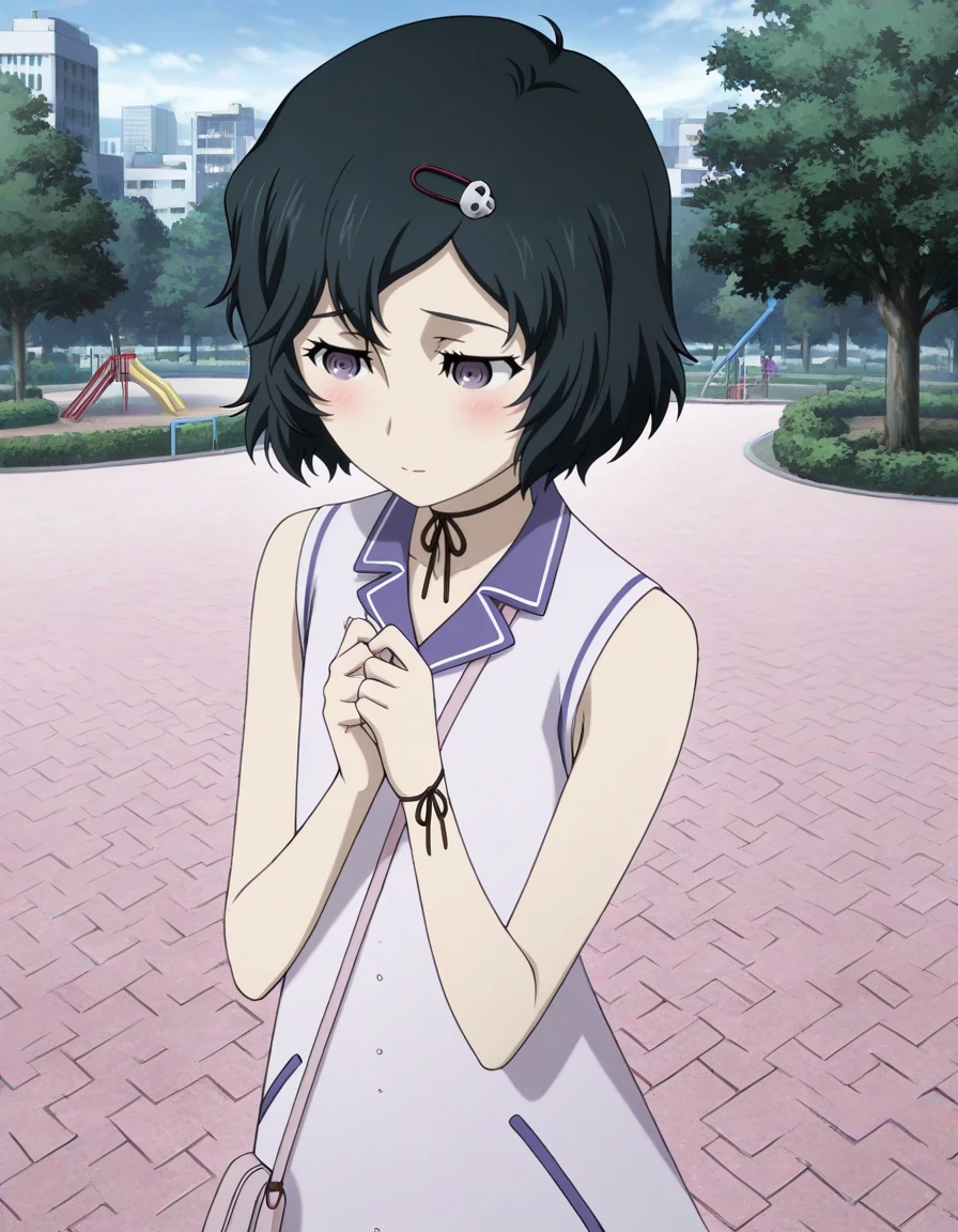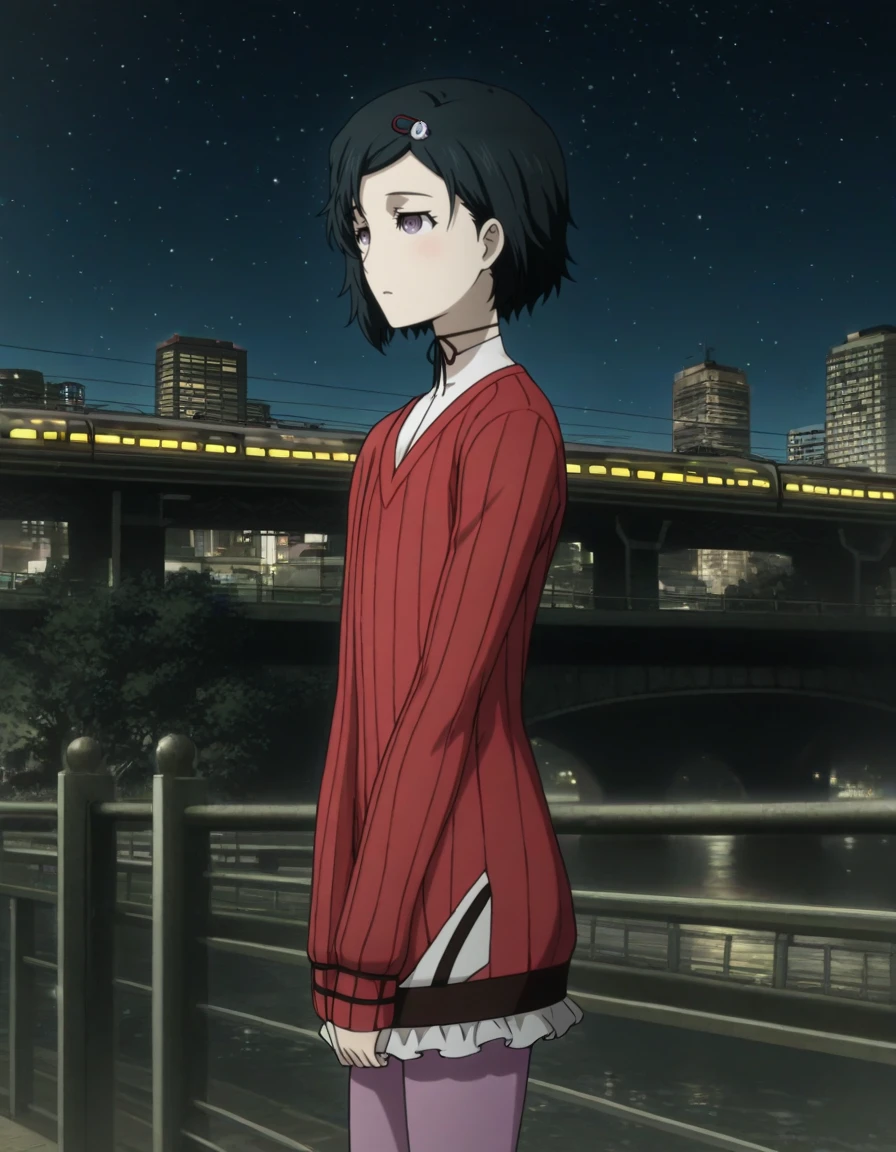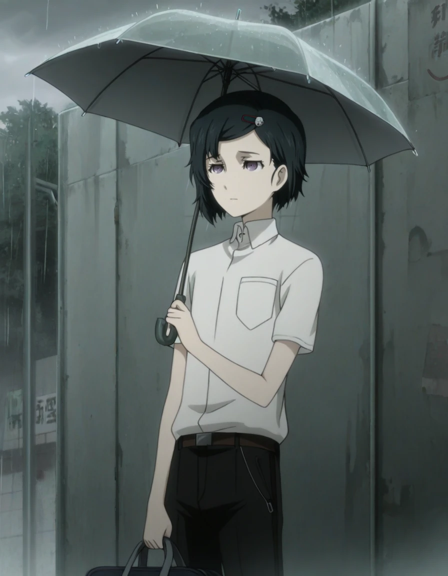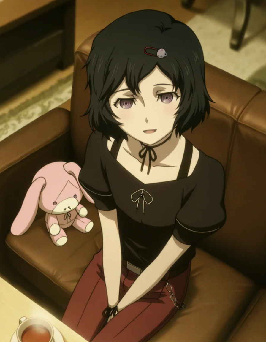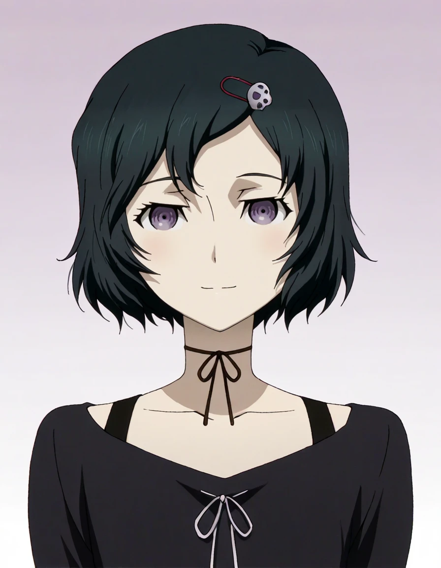 <lora:ruka_urushibara-steins_gate_mov-v2-ixl-anime-soralz:1>, ruka urushibara (steins;gate), short hair, black hair, skull hair ornament, purple eyesOutfit - Casual