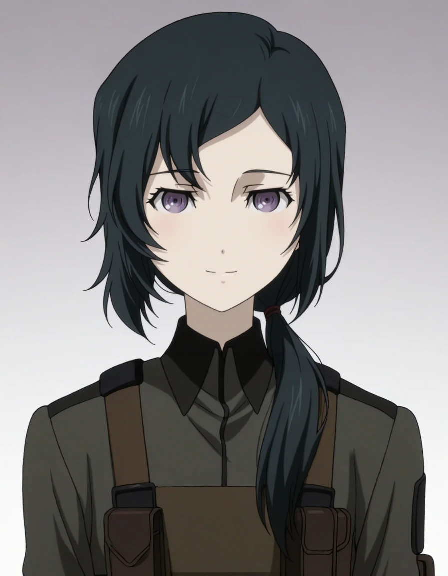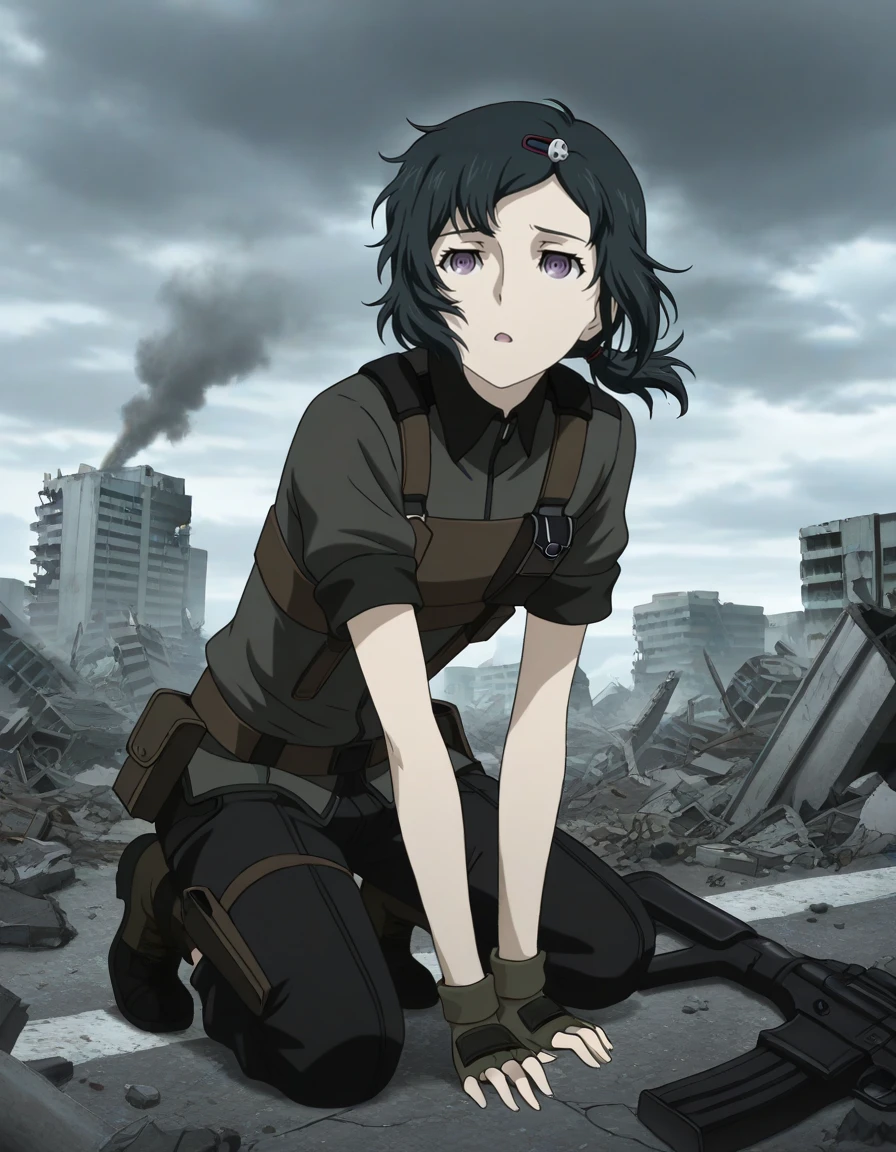 <lora:ruka_urushibara-steins_gate_mov-v2-ixl-anime-soralz:1>, ruka urushibara alt (steins;gate), black hair, purple eyes, short hair, skull hair ornament, short ponytailOutfit - Combat