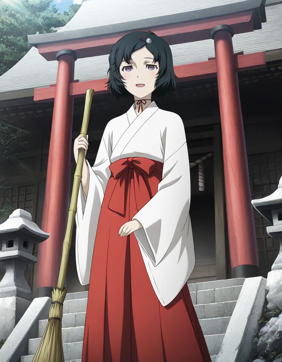 <lora:ruka_urushibara-steins_gate_mov-v2-ixl-anime-soralz:1>, ruka urushibara alt (steins;gate), black hair, purple eyes, short hair, skull hair ornament, short ponytail