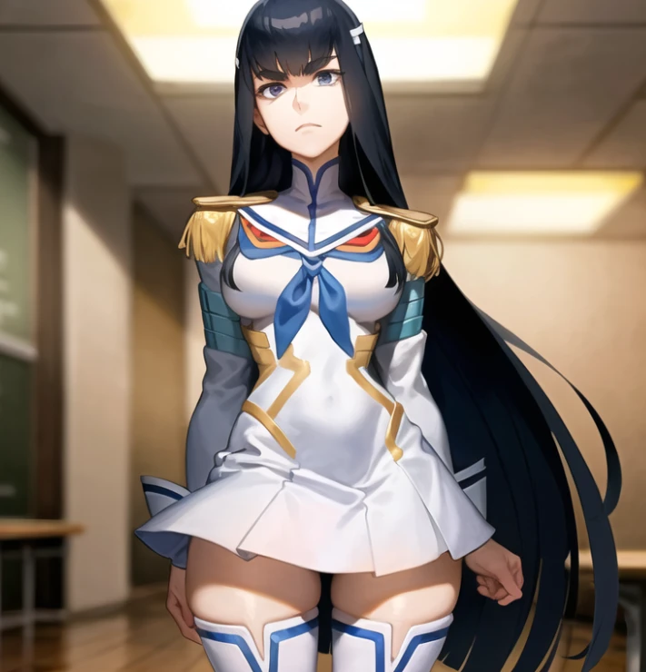 She can be placed in any clothes but if you wish to put her in traditional clothes: junketsu, epaulettes, school uniform, skirt, white thigh boots
