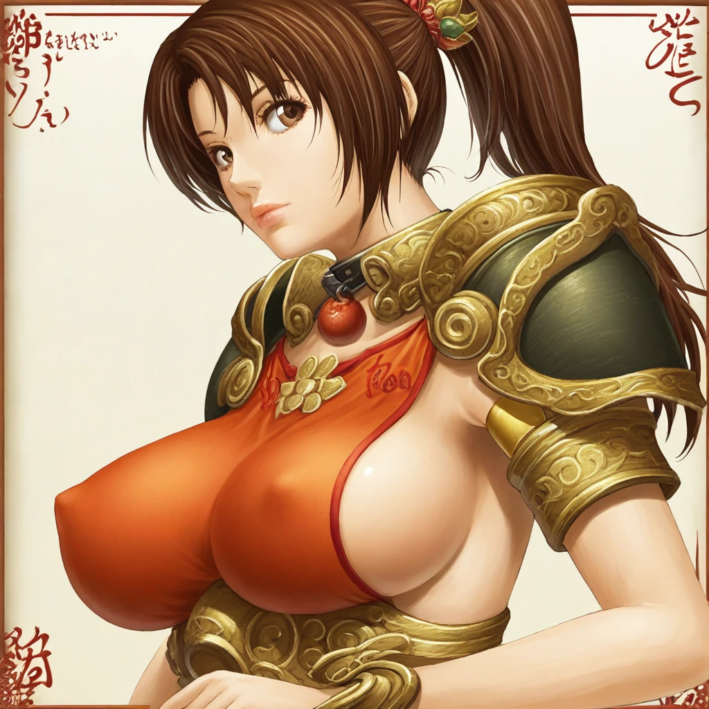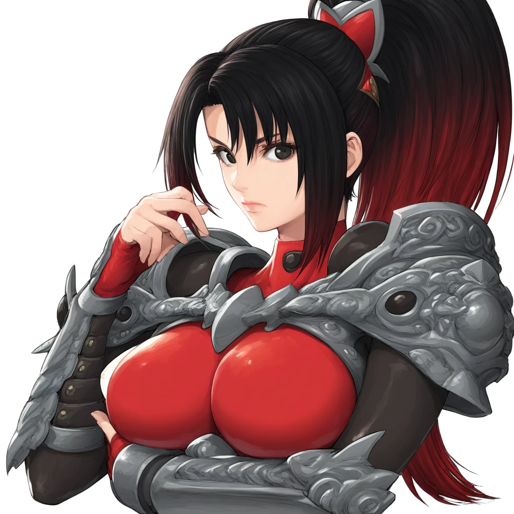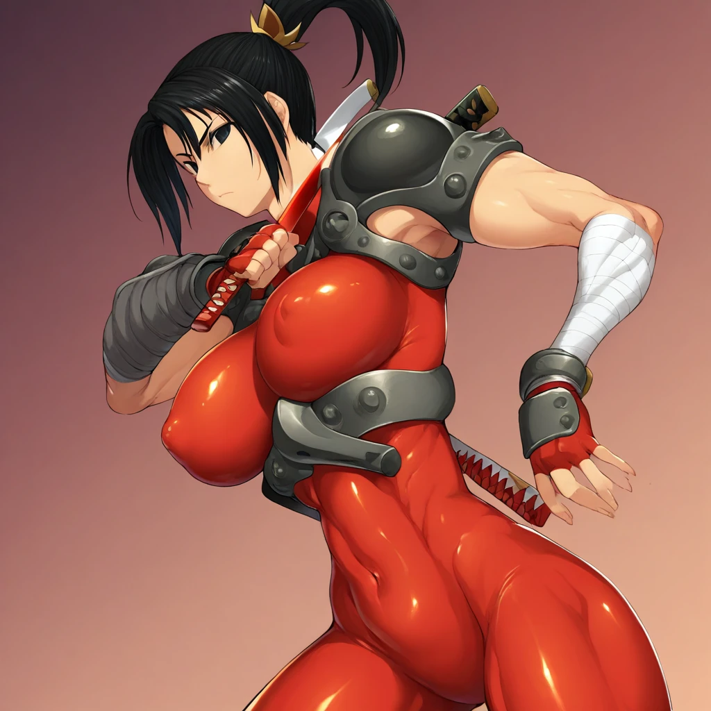 Trigger words: Taki, long black hair, ponytail, bangs, brown eyes, ninja, armor, red jumpsuit, full body suit, fingerless gloves, elbow-length gloves, shoulder armor, arm guards, shoulder pads, mask, mouth mask, fishnet stockings, athletic build, hair ornament, tight clothing, covered navel, covered collarbone, sleeveless