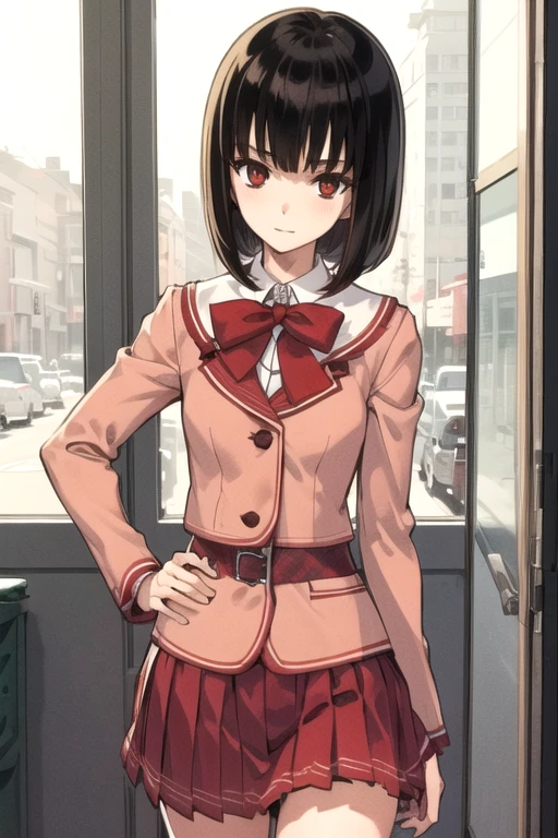 KagamiYagami, 1girl, solo, short hair, red skirt, black hair, red eyes, long sleeves, brown eyes, school uniform, jacket, pleated skirt, red bowtie, bob cut,