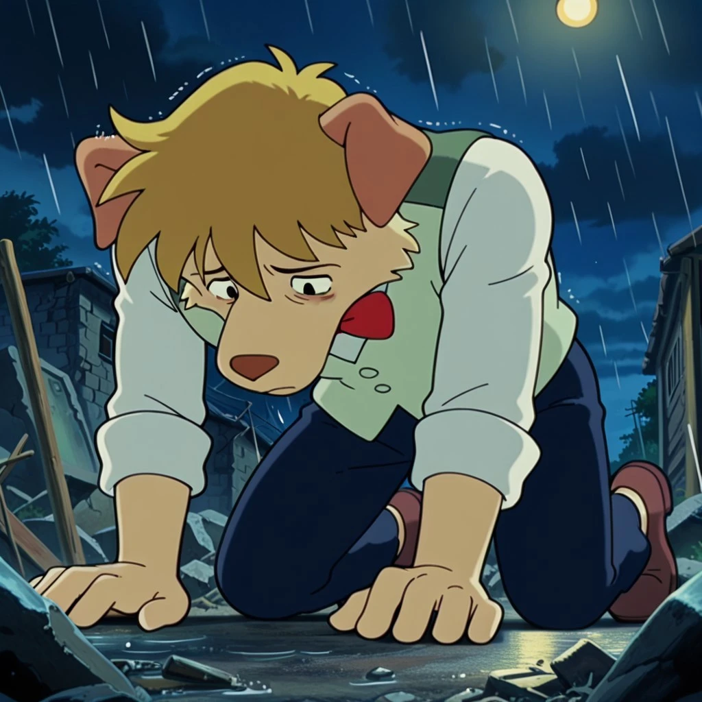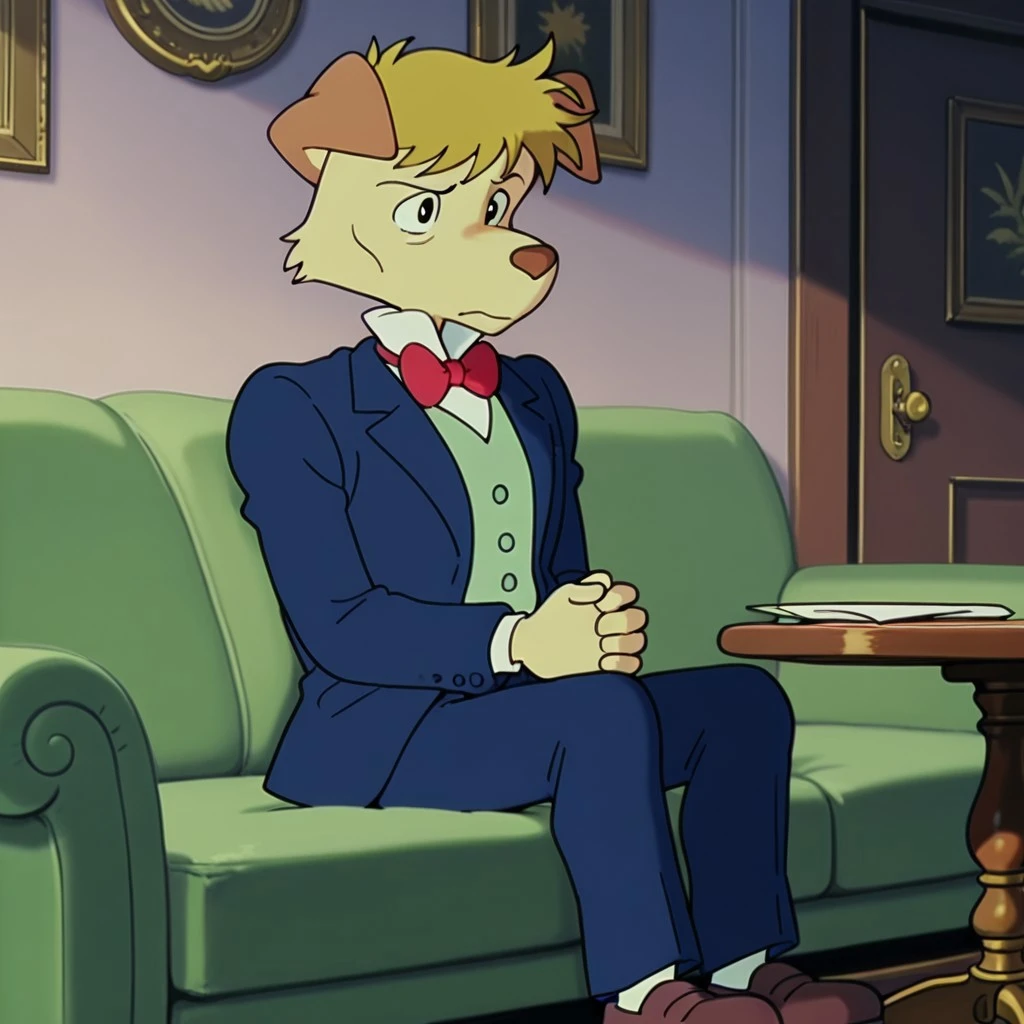 Tags: furry, furry male, canine, animal ears, blonde hair, pale yellow fur, brown nose, black eyes